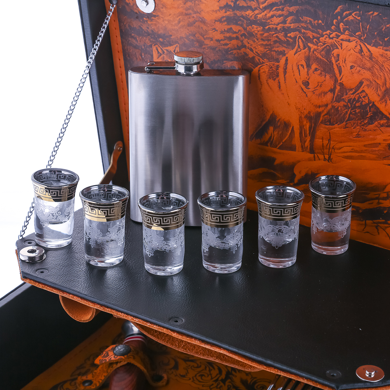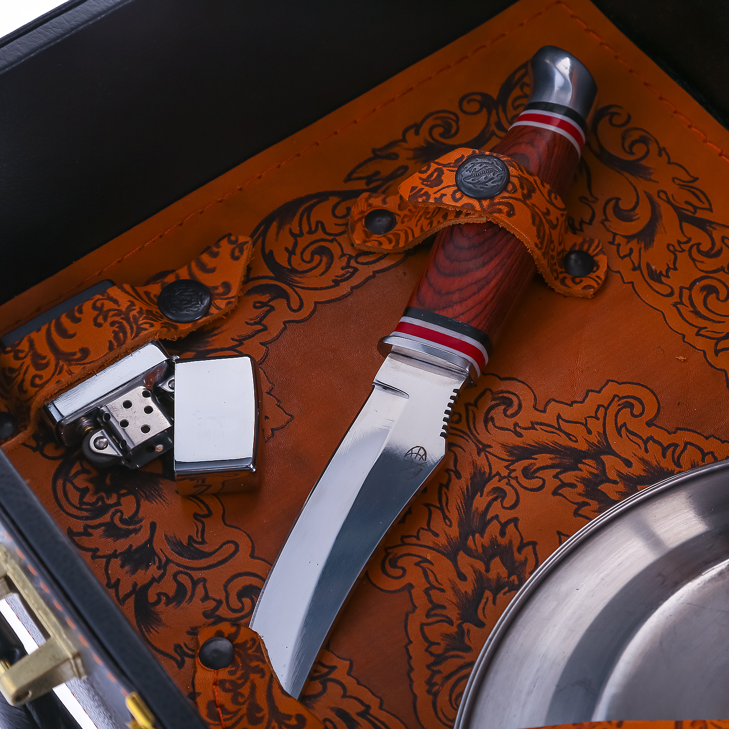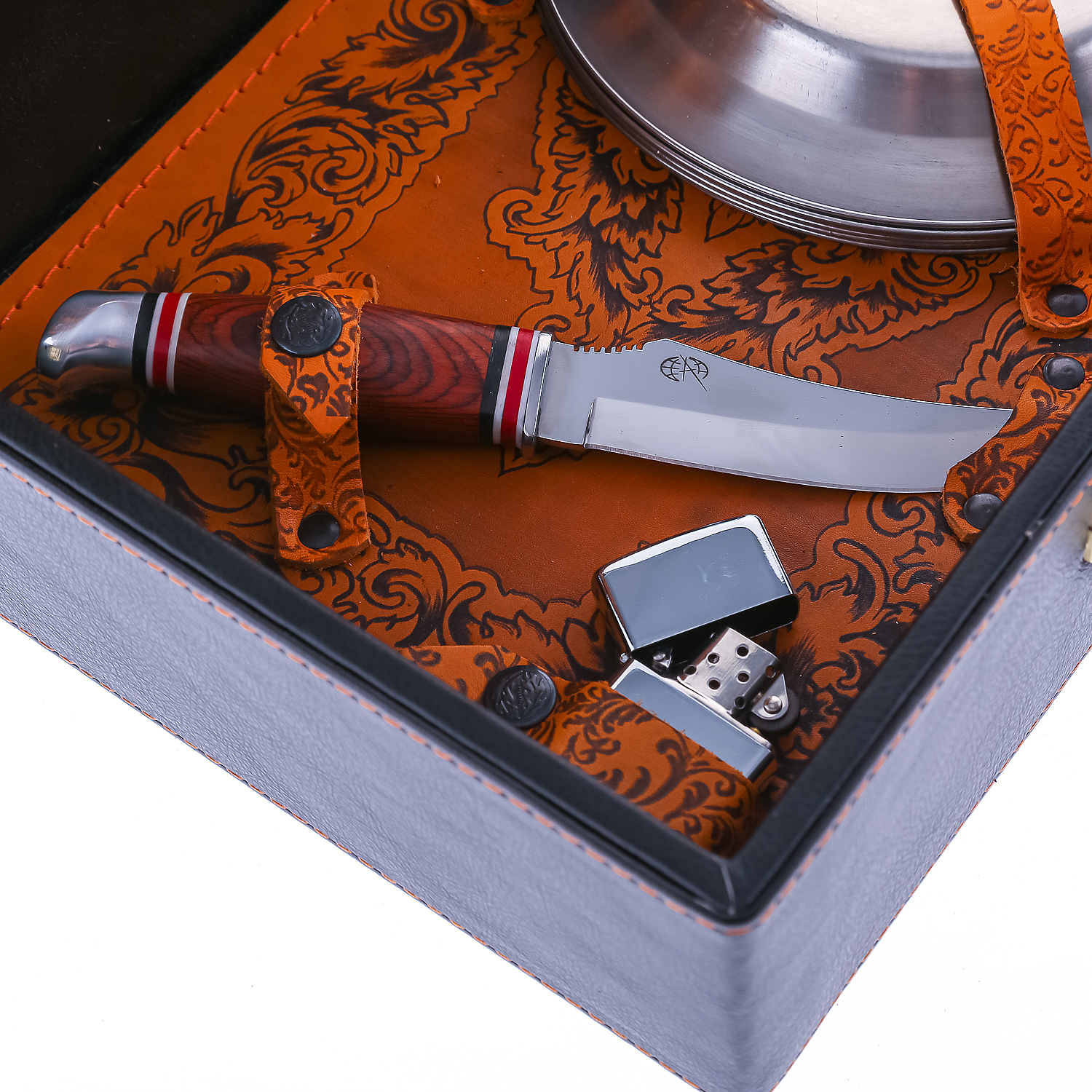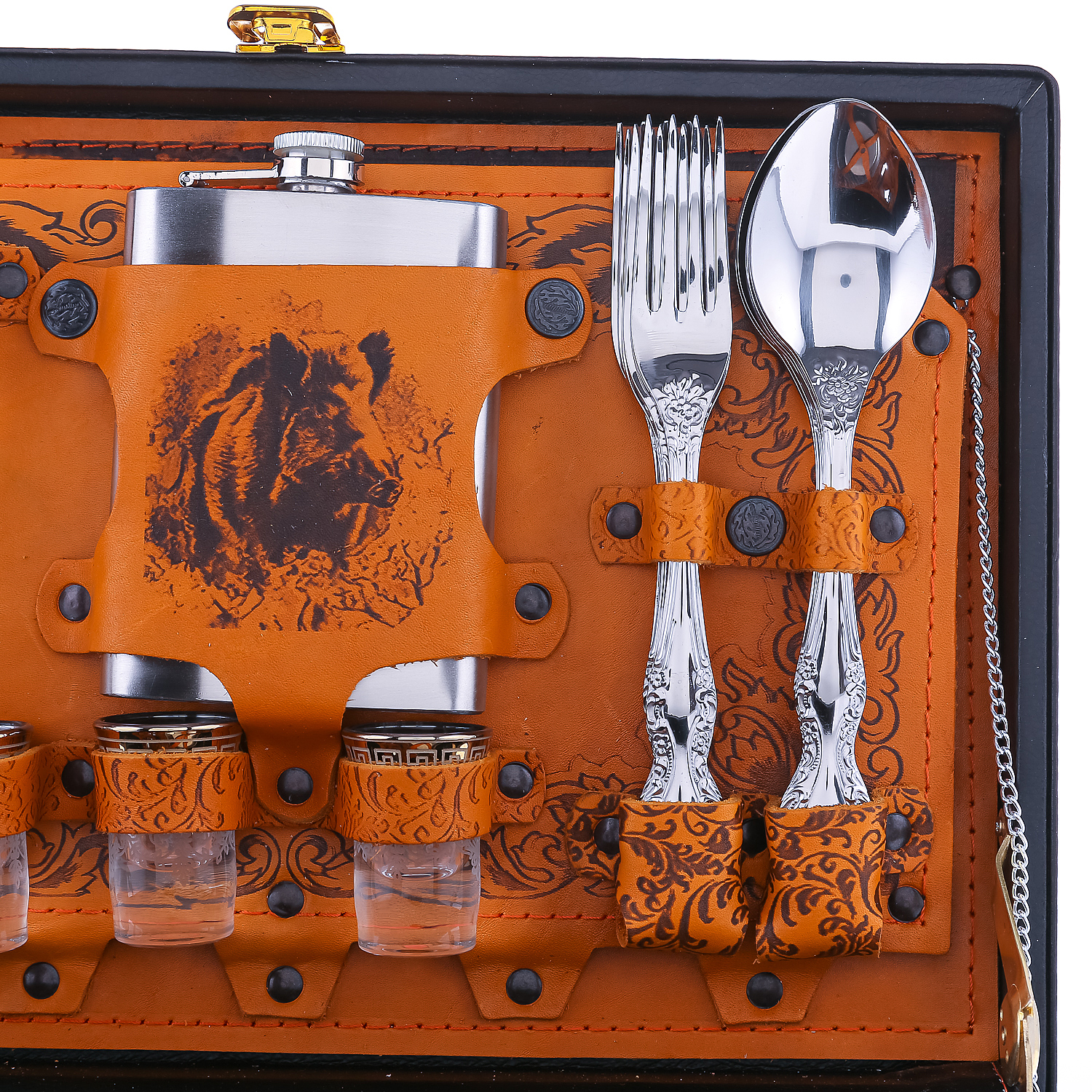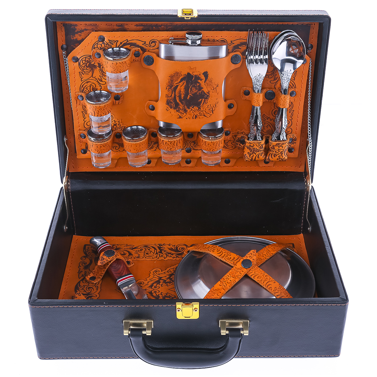 Комплектация: фляга, стопка 6 шт., вилка 6 шт., ложка 6 шт., тарелка 6 шт., зажигалка, нож.