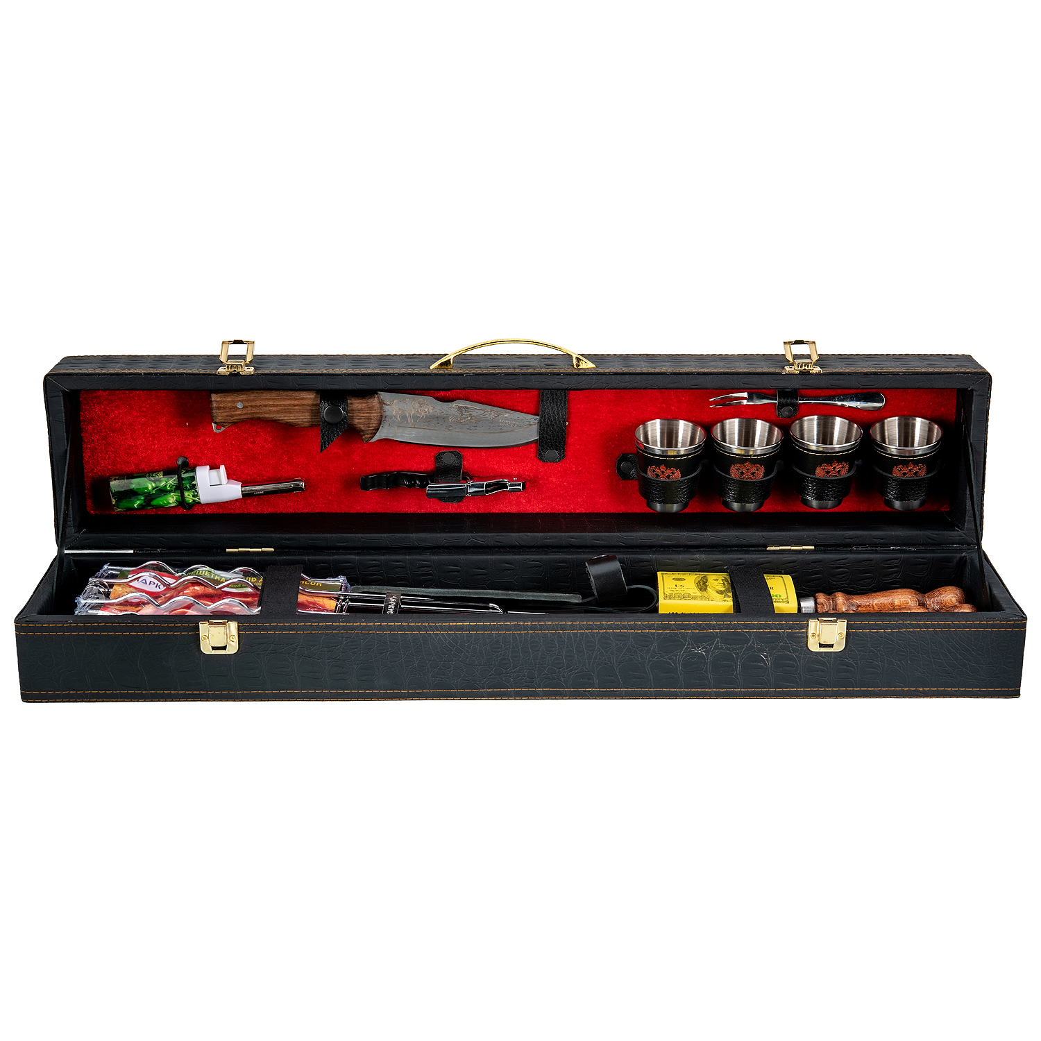 Комплектация: стопка 4 шт., зажигалка 1 шт., вилка 1 шт., нож 1 шт., открывашка 1 шт., шампур 4 шт., решетка 1 шт., колода карт 1 шт.