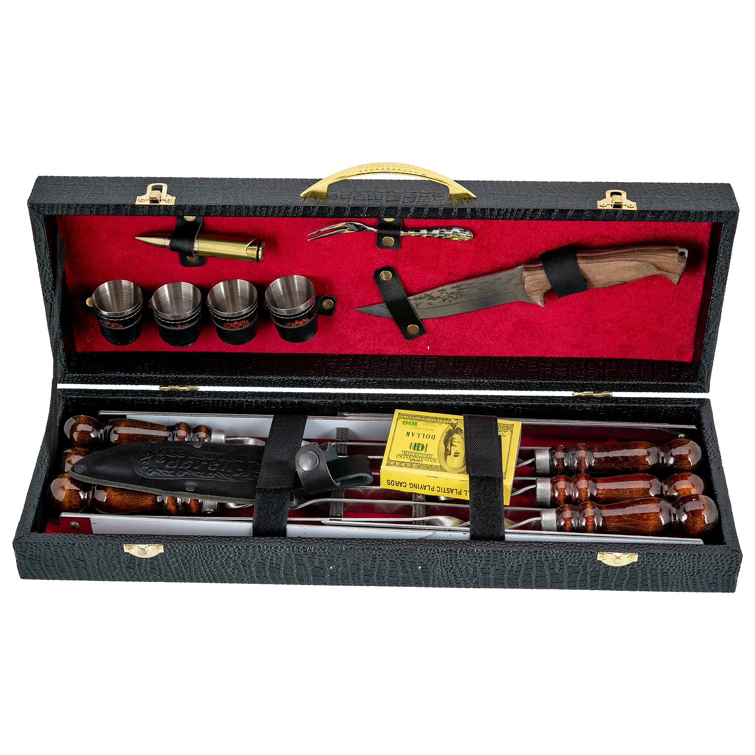 Шашлычный набор для пикника в кожаном футляре.Материалы: нержавеющая сталь, дерево, кожа.