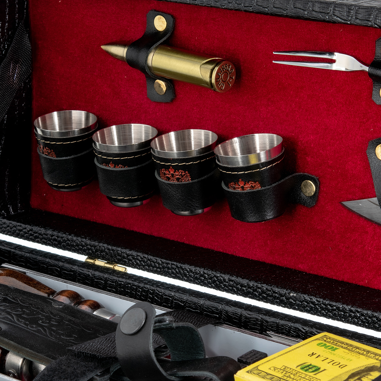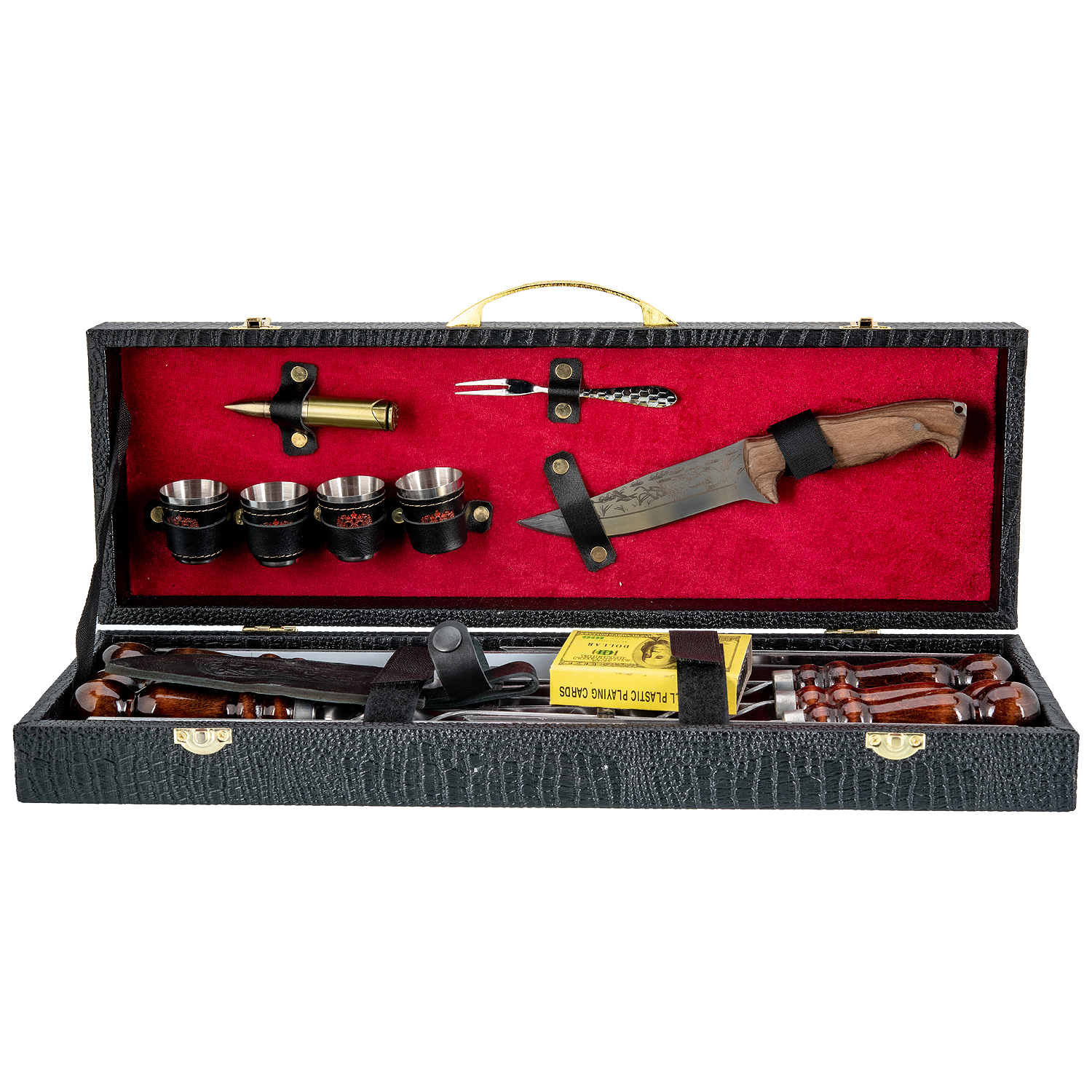 Комплектация: стопка 4 шт., зажигалка 1 шт., вилка 1 шт., нож 1 шт., шампур 6 шт., мангал 1 шт., колода карт 1 шт.