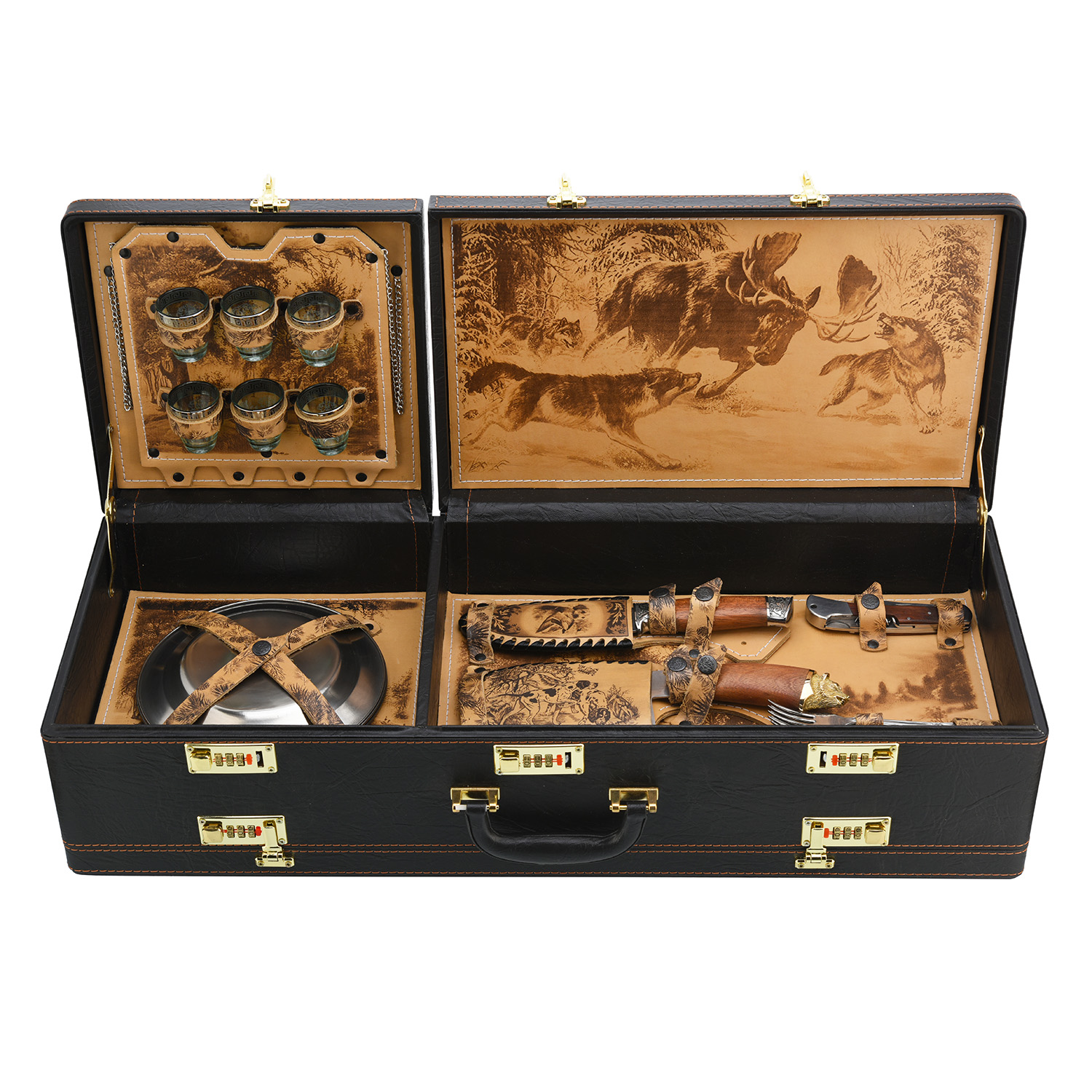 Набор для пикника "Подарочный".Материалы: нержавеющая сталь, дерево, бронза, кожа.