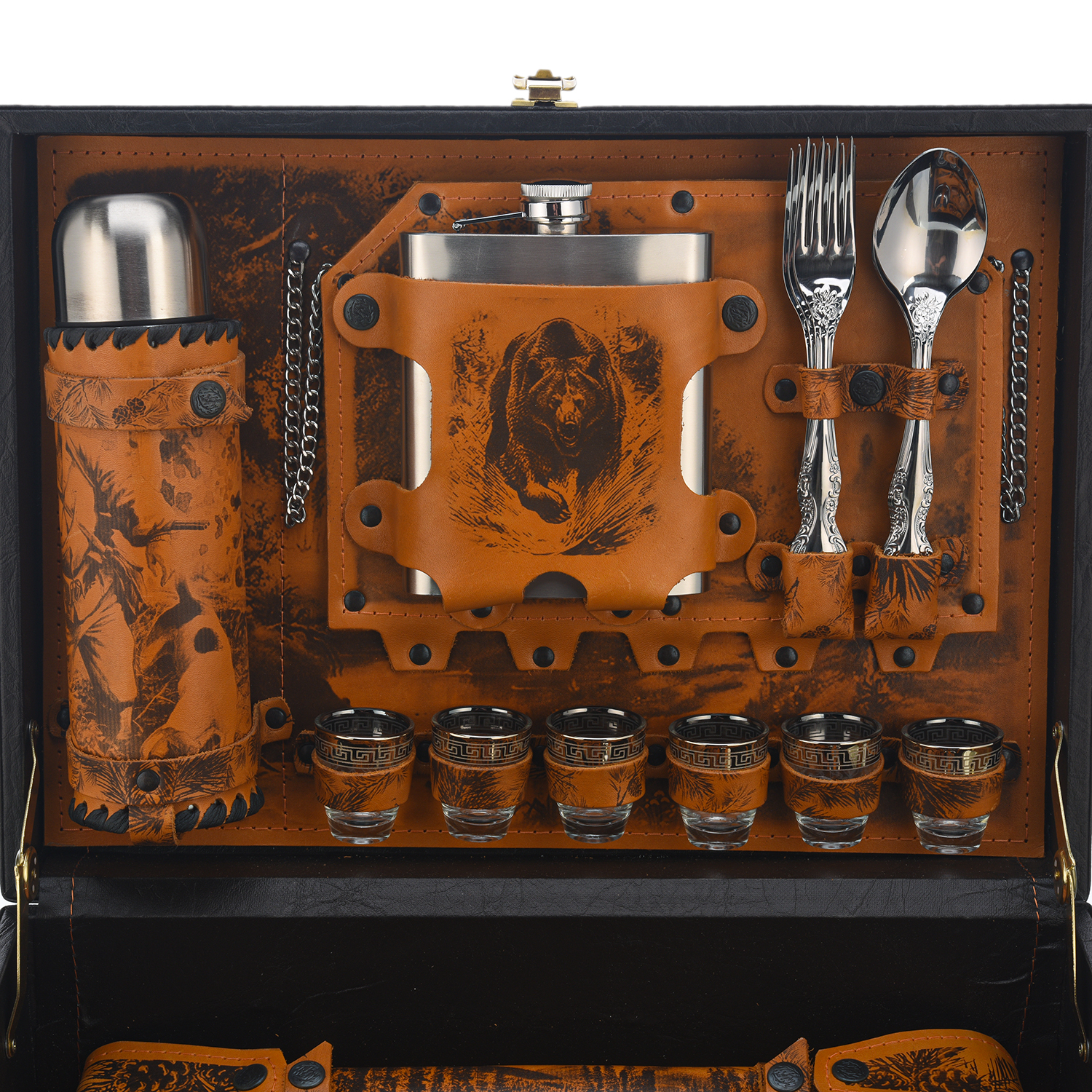 Комплектация: термос 1 шт., фляга 1 шт., вилка 6 шт., ложка 6 шт., стопка 6 шт., тарелка 6 шт., нож 1 шт., топорик 1 шт.