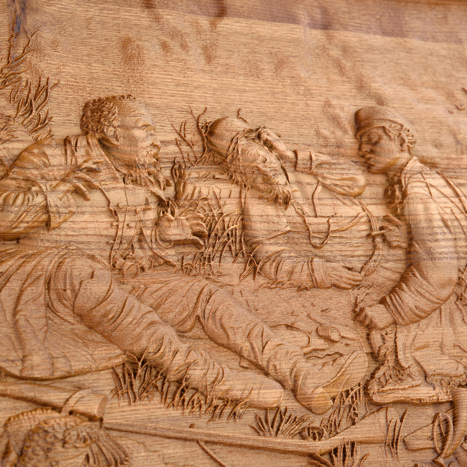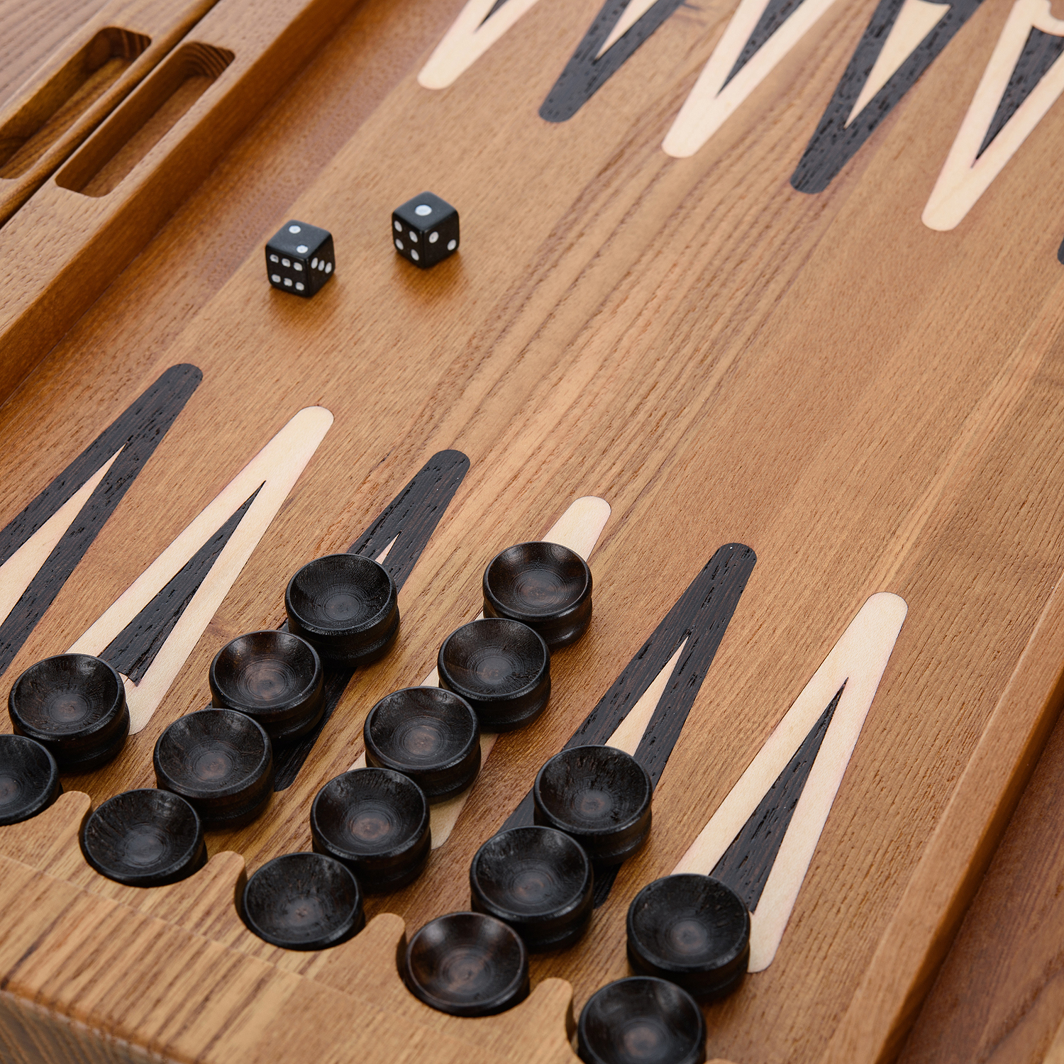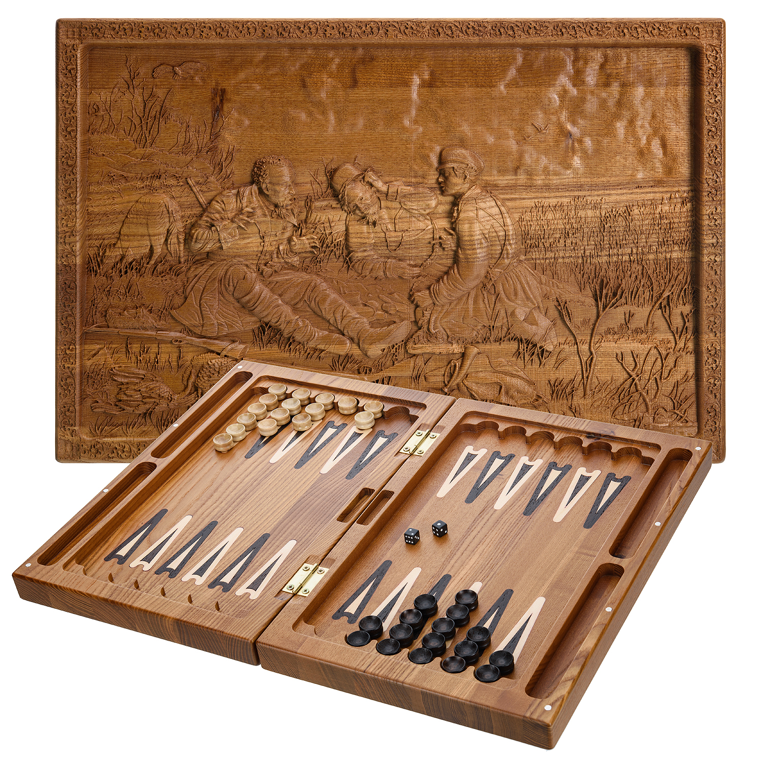 Нарды-шашки деревянные "Охотники на привале".Материалы: массив мореного ясеня.