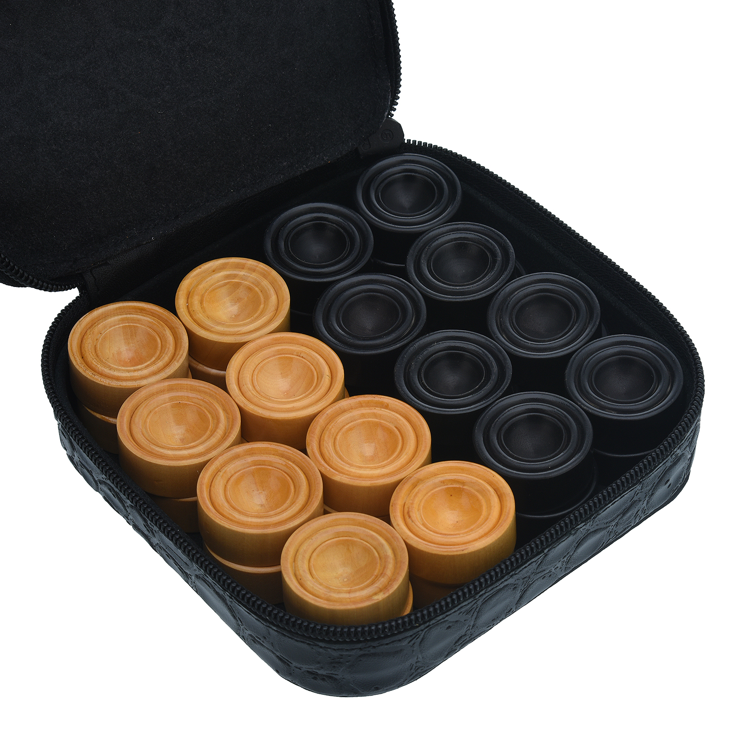 Набор деревянных фишек для нард в кожаном футляре.Материалы: эбен, самшит, кожа.