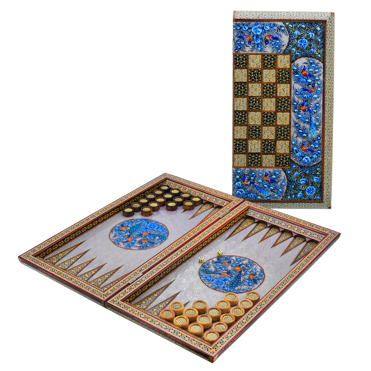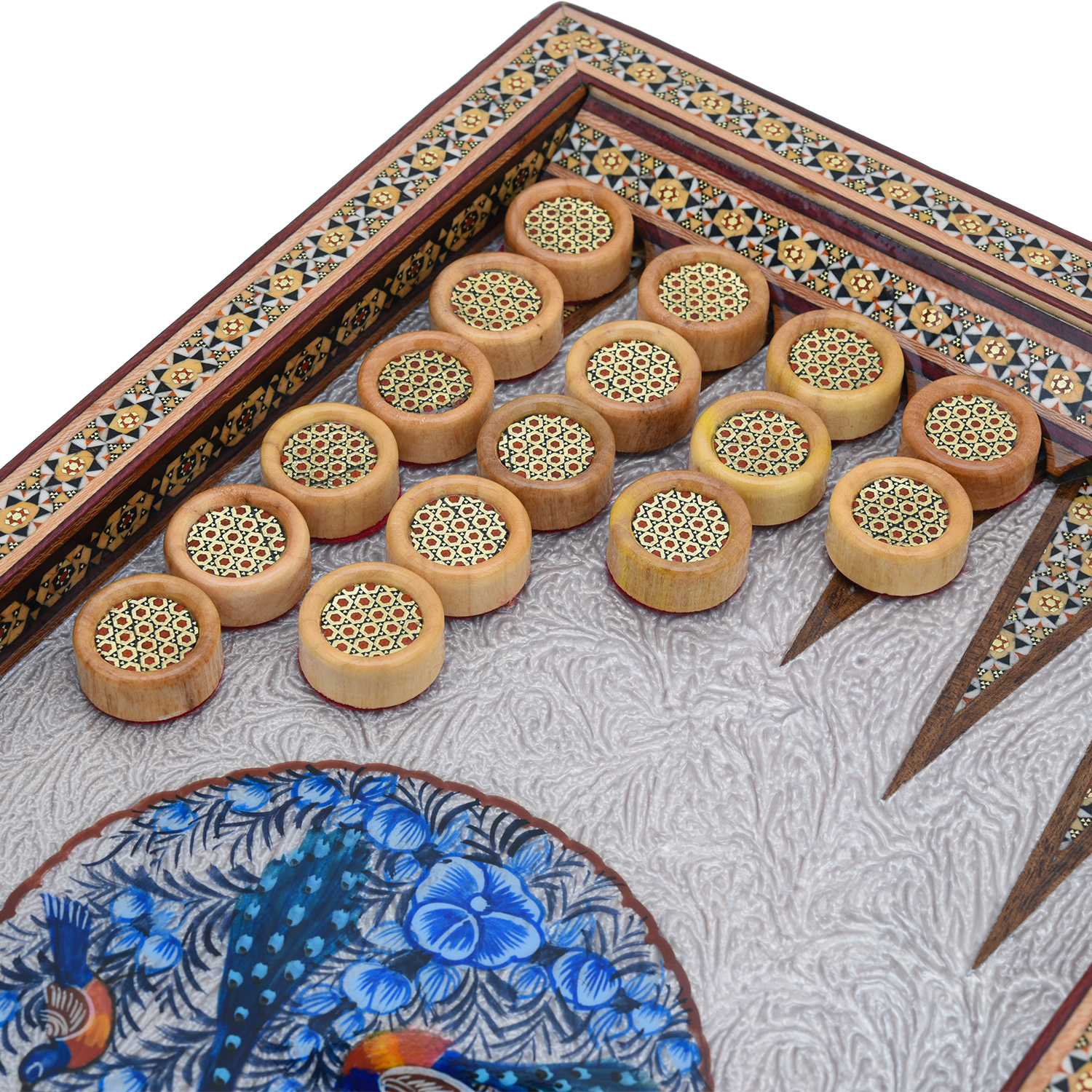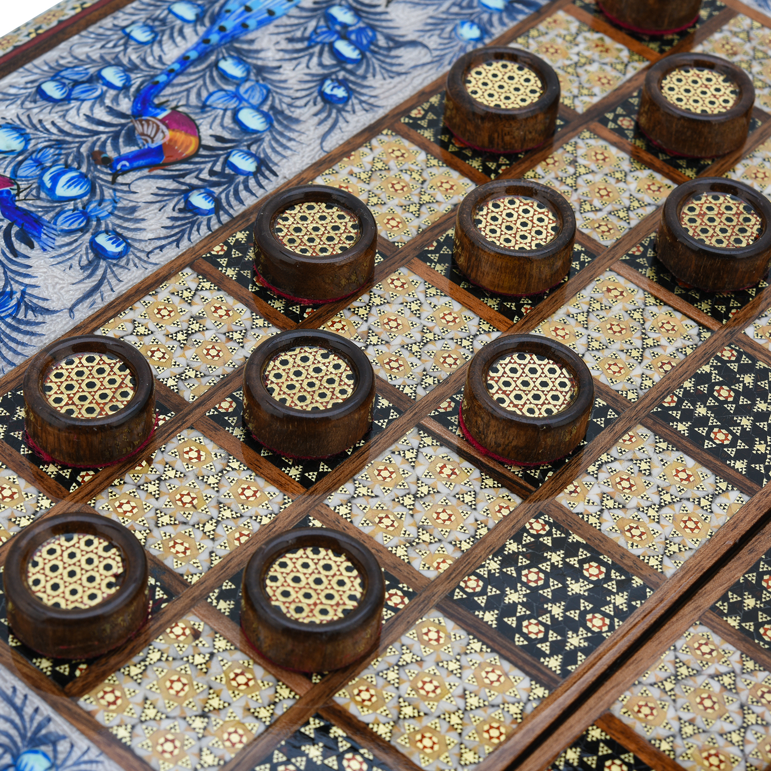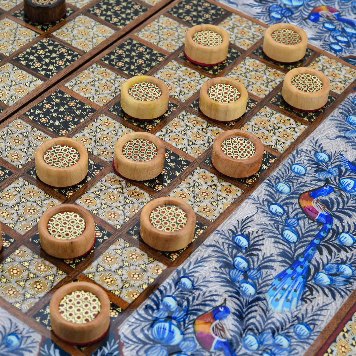 Роскошные нарды ручной работы, выполненные из массива, сочетают в себе изысканность природной текстуры древесины и искусство персидской техники Хатам Кари. Инкрустация геометрическими узорами из разноцветных пород дерева, металла и кости придаёт игровому полю уникальный декоративный эффект. В комплекте — деревянные шашки, гармонирующие с дизайном. Идеальный выбор для ценителей эксклюзивных настольных игр, восточной эстетики и элитных аксессуаров интерьера.Размер: 490х250х70 мм