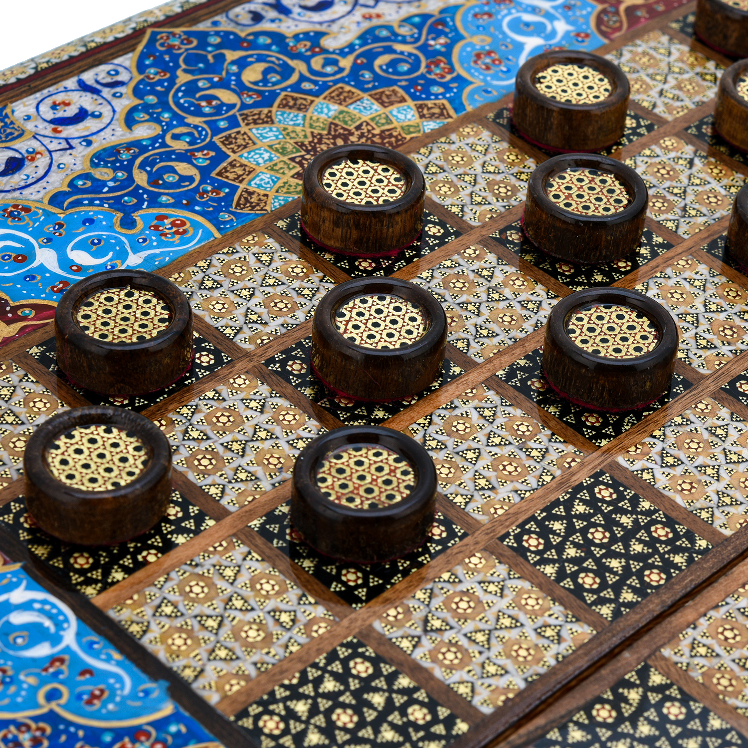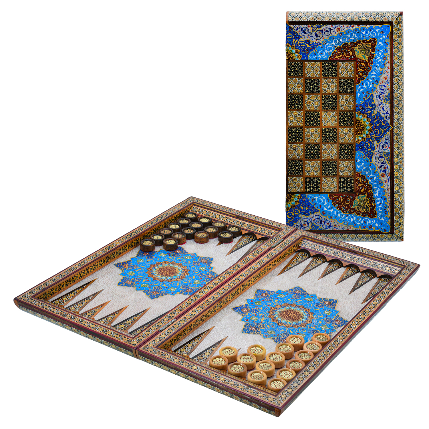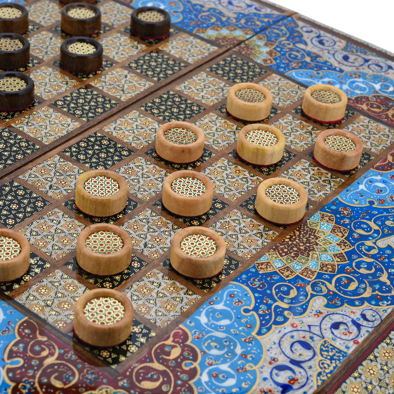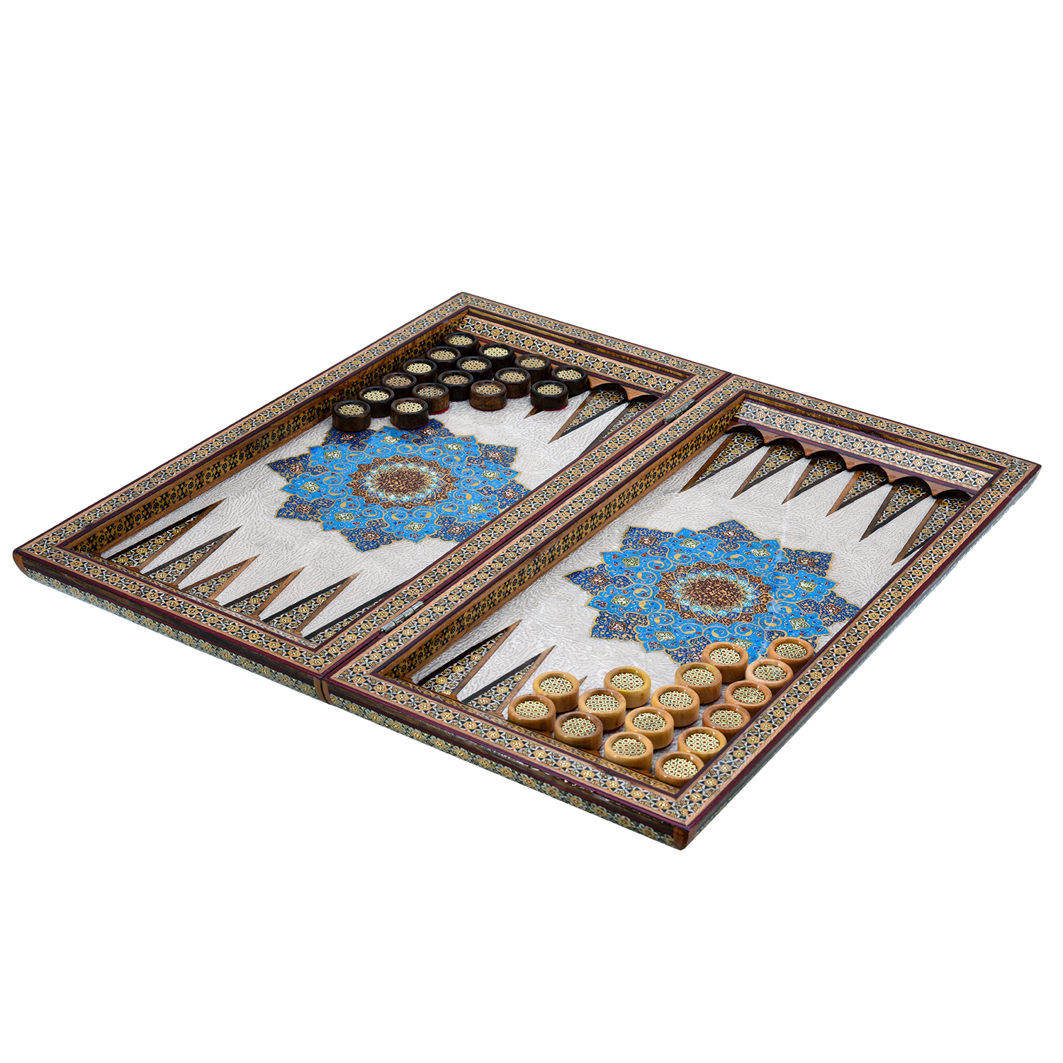Роскошные нарды ручной работы, выполненные из массива, сочетают в себе изысканность природной текстуры древесины и искусство персидской техники Хатам Кари. Инкрустация геометрическими узорами из разноцветных пород дерева, металла и кости придаёт игровому полю уникальный декоративный эффект. В комплекте — деревянные шашки, гармонирующие с дизайном. Идеальный выбор для ценителей эксклюзивных настольных игр, восточной эстетики и элитных аксессуаров интерьера.Размер: 490х250х70 мм