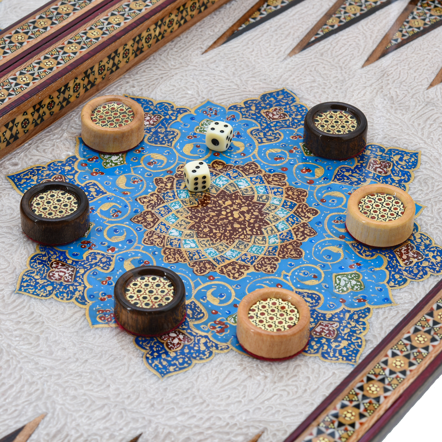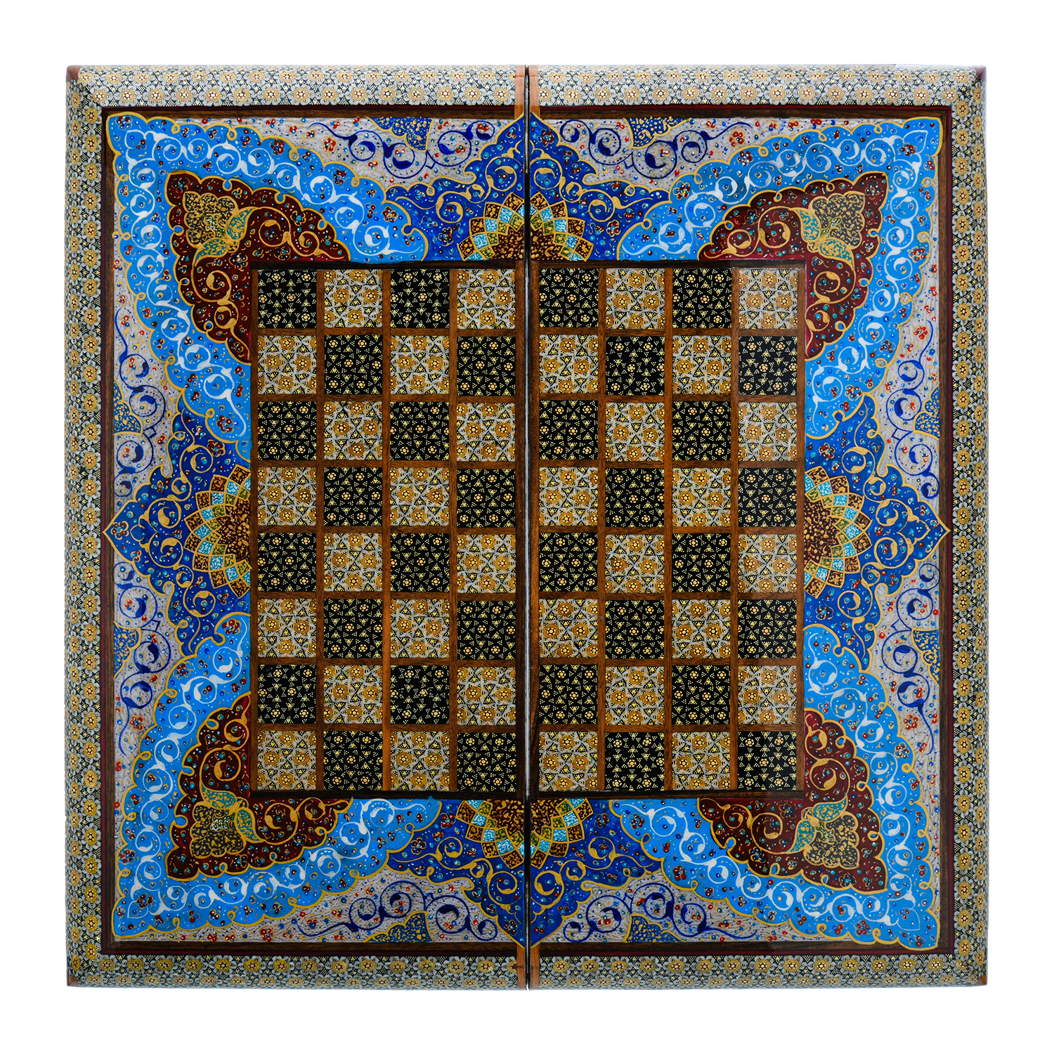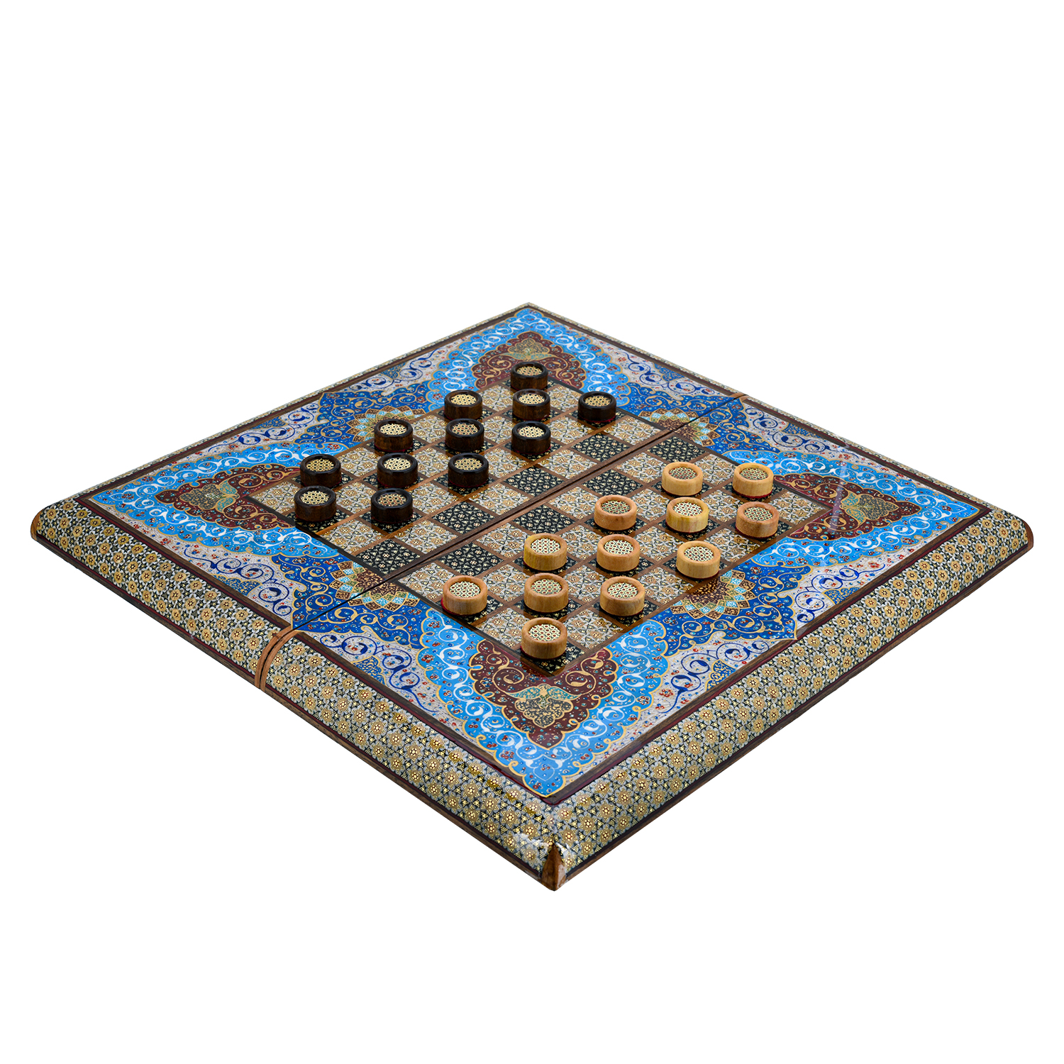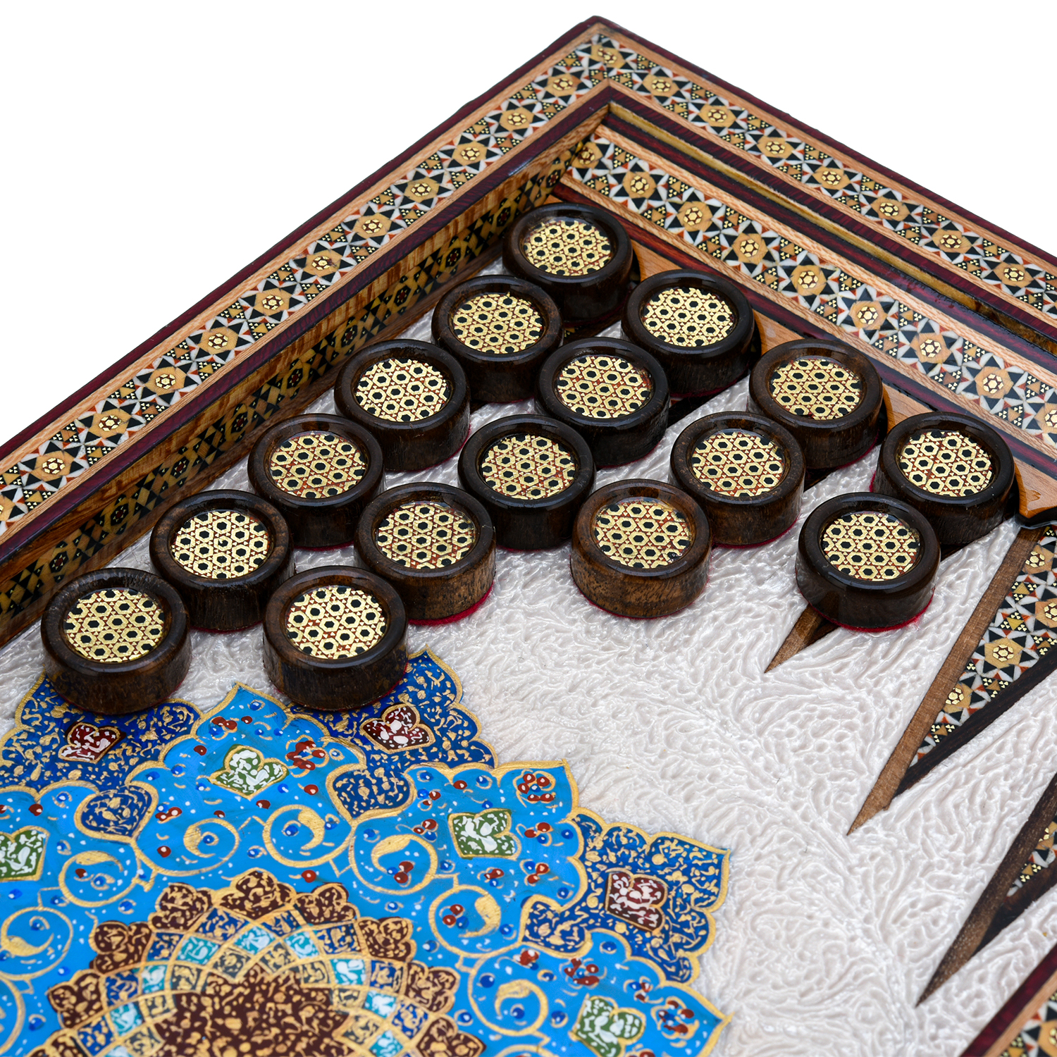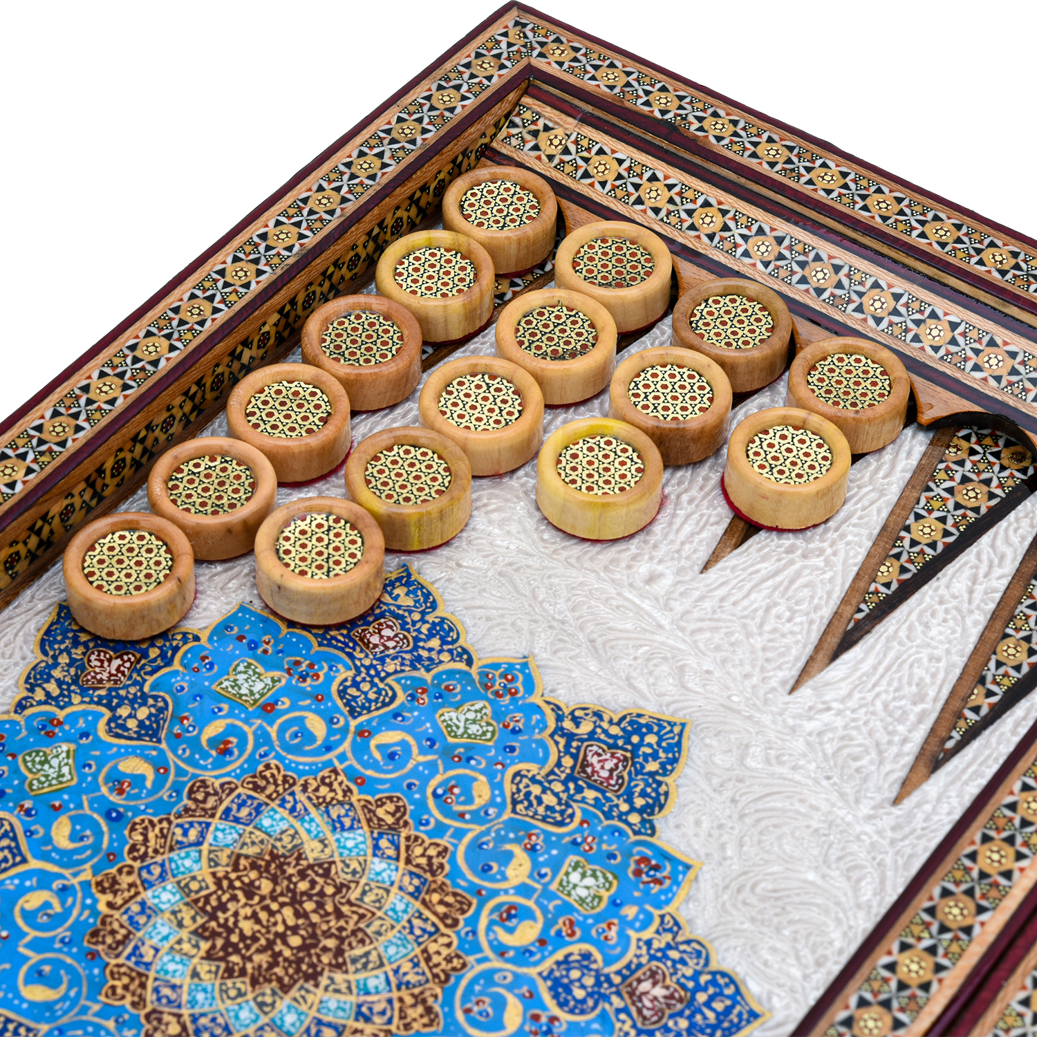 Роскошные нарды ручной работы, выполненные из массива, сочетают в себе изысканность природной текстуры древесины и искусство персидской техники Хатам Кари. Инкрустация геометрическими узорами из разноцветных пород дерева, металла и кости придаёт игровому полю уникальный декоративный эффект. В комплекте — деревянные шашки, гармонирующие с дизайном. Идеальный выбор для ценителей эксклюзивных настольных игр, восточной эстетики и элитных аксессуаров интерьера.Размер: 490х250х70 мм