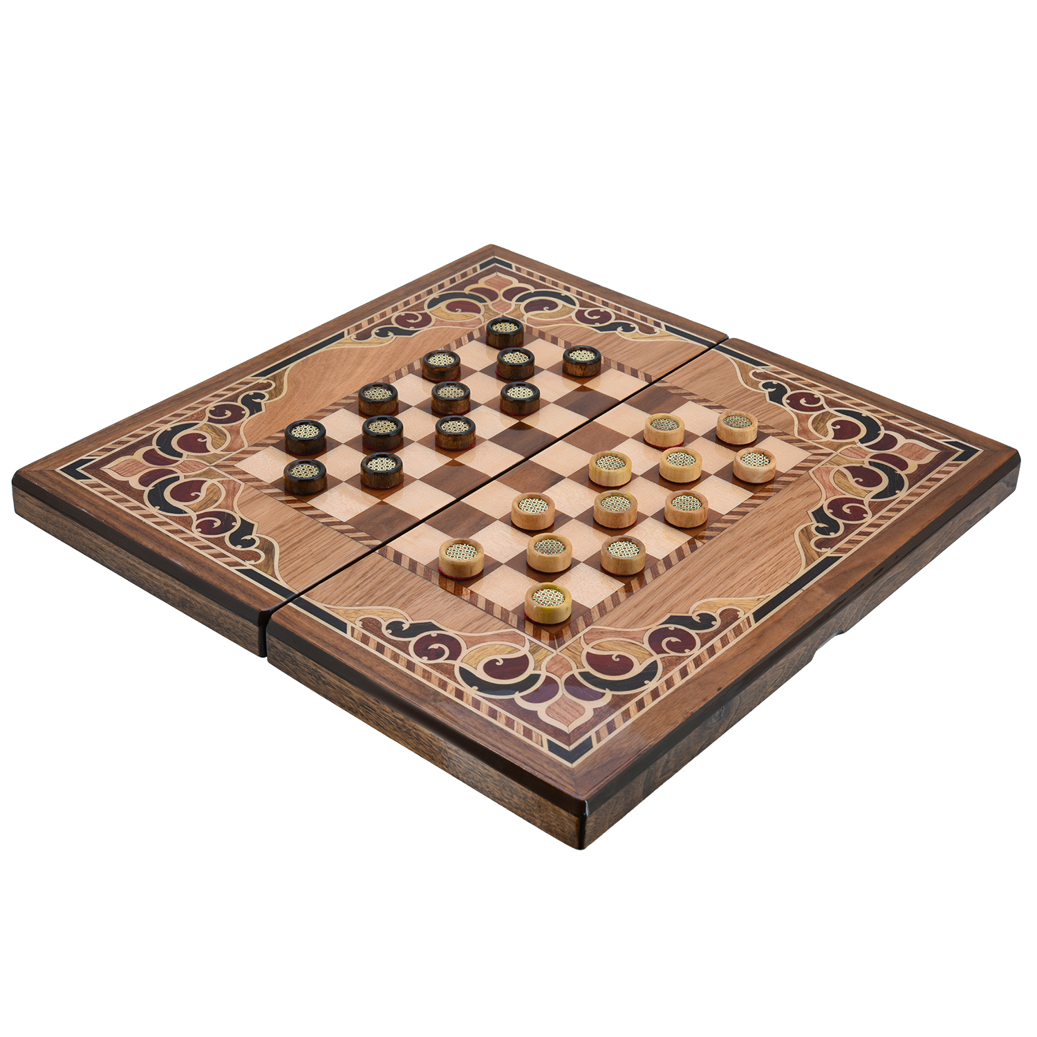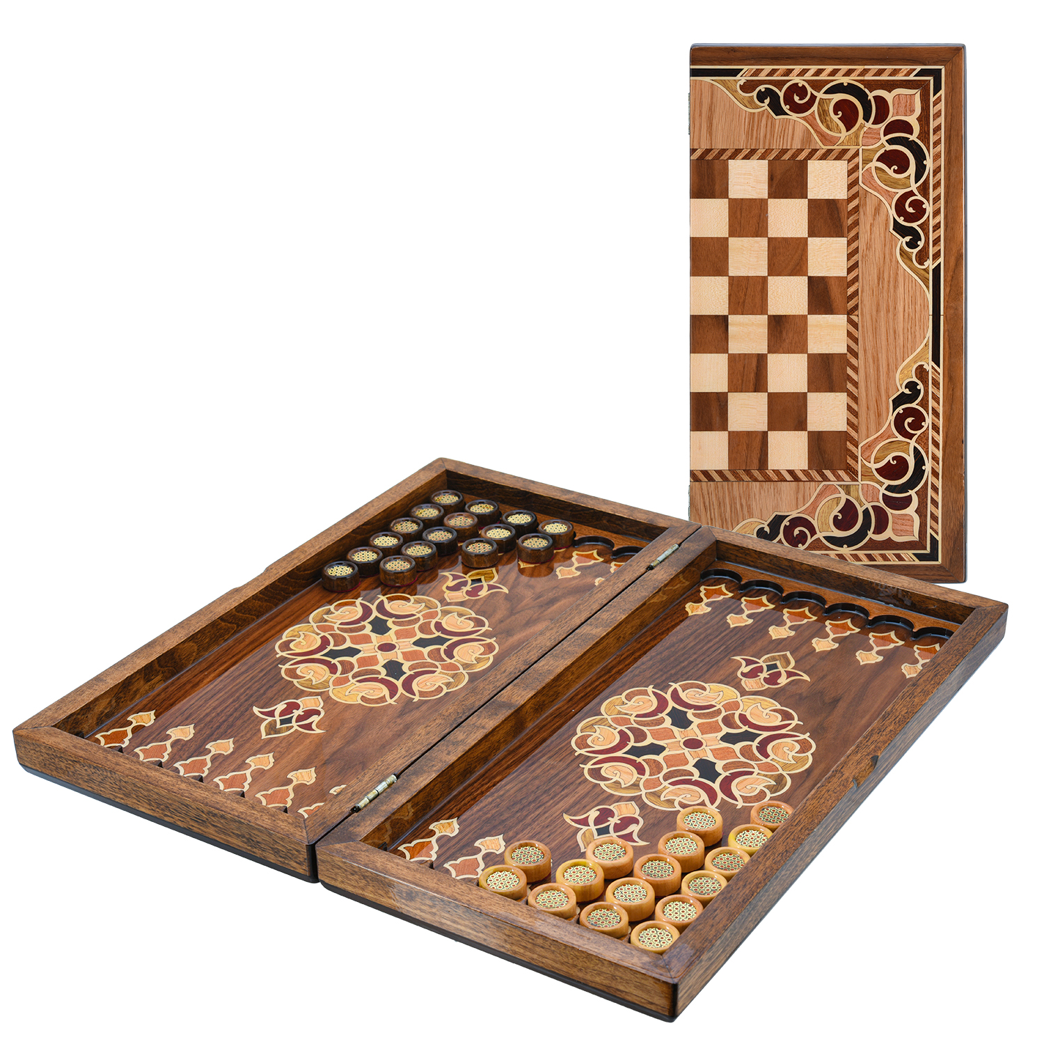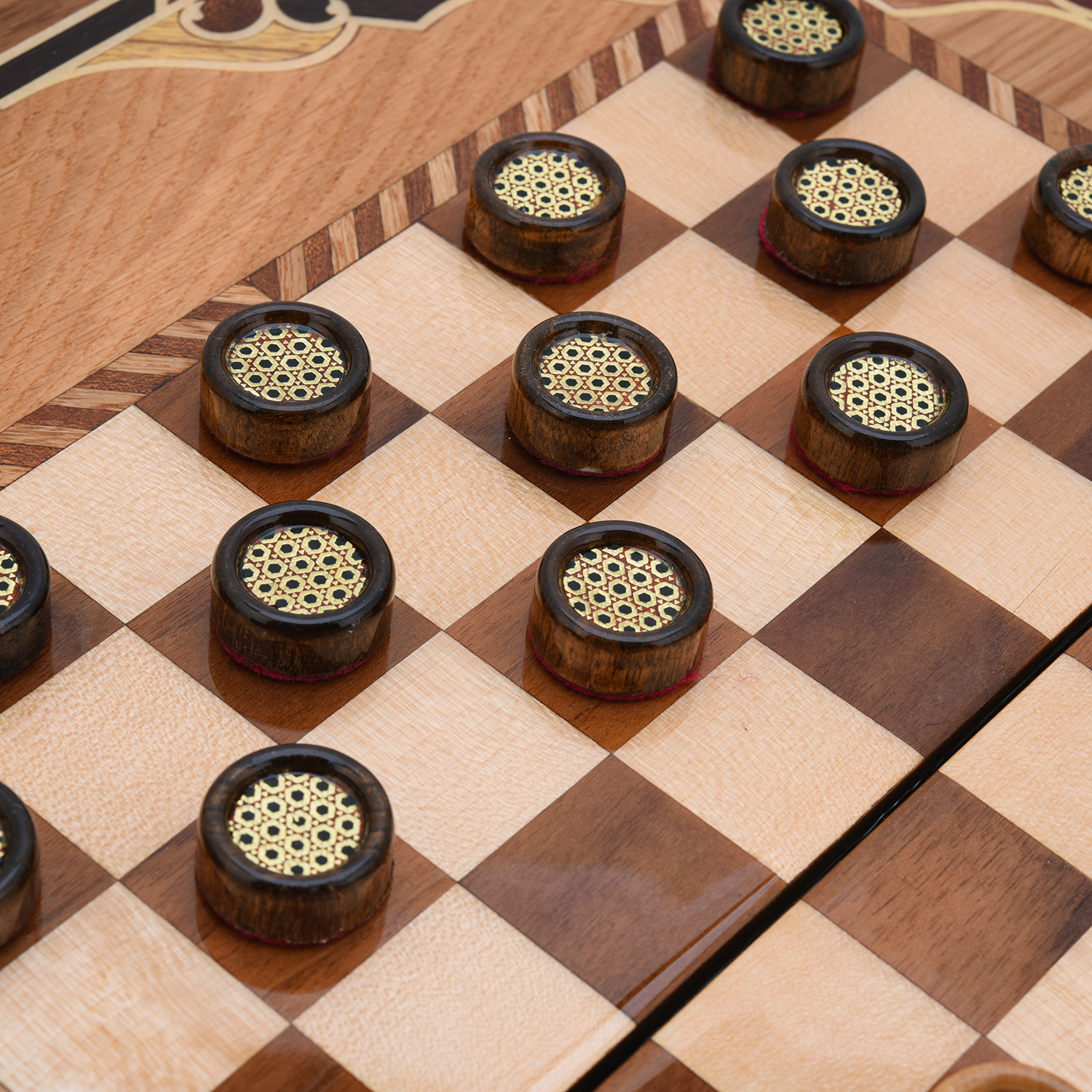 Эксклюзивные нарды - шашки ручной работы, выполненные из натурального массива дерева, украшены изящной инкрустацией разноцветными шпонами ценных пород. Геометрические узоры, сочетающие контрастные оттенки и текстуры, подчеркивают природную эстетику материала, добавляя изделию утонченности и роскоши. Прочная конструкция и тщательная обработка гарантируют долговечность набора, а деревянные шашки, стилистически созвучные дизайну, завершают гармоничный образ. Идеальный выбор для ценителей классических игр, эко-эстетики и уникальных предметов интерьера, созданных с любовью к деталям.При создании данных изделий мастера используют технику "Маркетри", где естественные оттенки и текстура древесины (например, ореха, красного дерева, клёна) используется для создания контрастов, иллюзии объёма и сложных узоров. Элементы шпона вручную подгоняются, склеиваются и фиксируются на основе, после чего поверхность шлифуется и покрывается лаком.