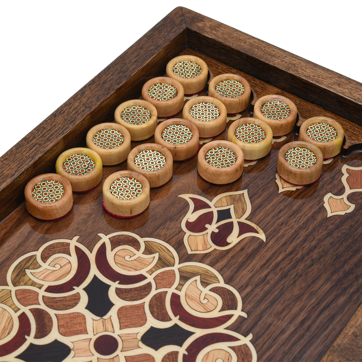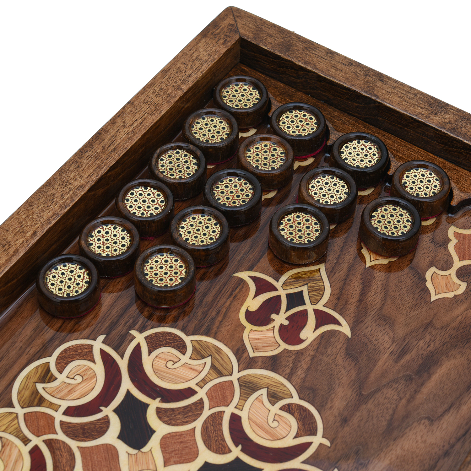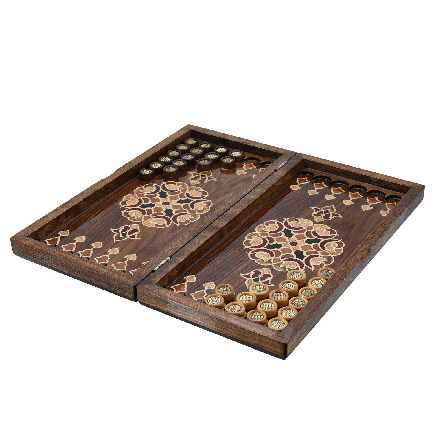 Эксклюзивные нарды - шашки ручной работы, выполненные из натурального массива дерева, украшены изящной инкрустацией разноцветными шпонами ценных пород. Геометрические узоры, сочетающие контрастные оттенки и текстуры, подчеркивают природную эстетику материала, добавляя изделию утонченности и роскоши. Прочная конструкция и тщательная обработка гарантируют долговечность набора, а деревянные шашки, стилистически созвучные дизайну, завершают гармоничный образ. Идеальный выбор для ценителей классических игр, эко-эстетики и уникальных предметов интерьера, созданных с любовью к деталям.При создании данных изделий мастера используют технику "Маркетри", где естественные оттенки и текстура древесины (например, ореха, красного дерева, клёна) используется для создания контрастов, иллюзии объёма и сложных узоров. Элементы шпона вручную подгоняются, склеиваются и фиксируются на основе, после чего поверхность шлифуется и покрывается лаком.
