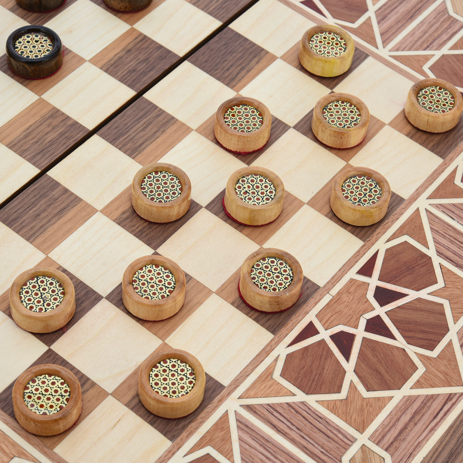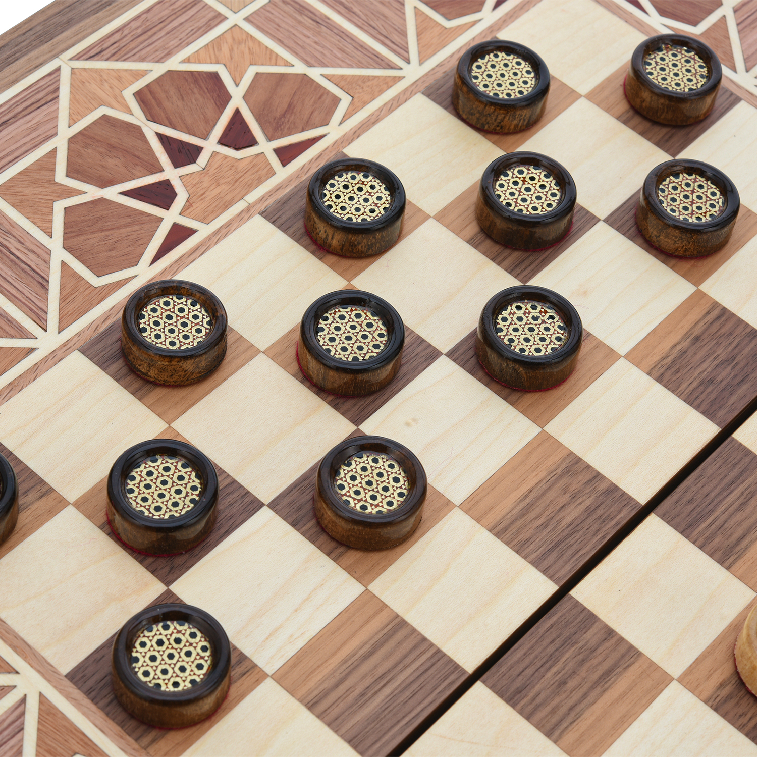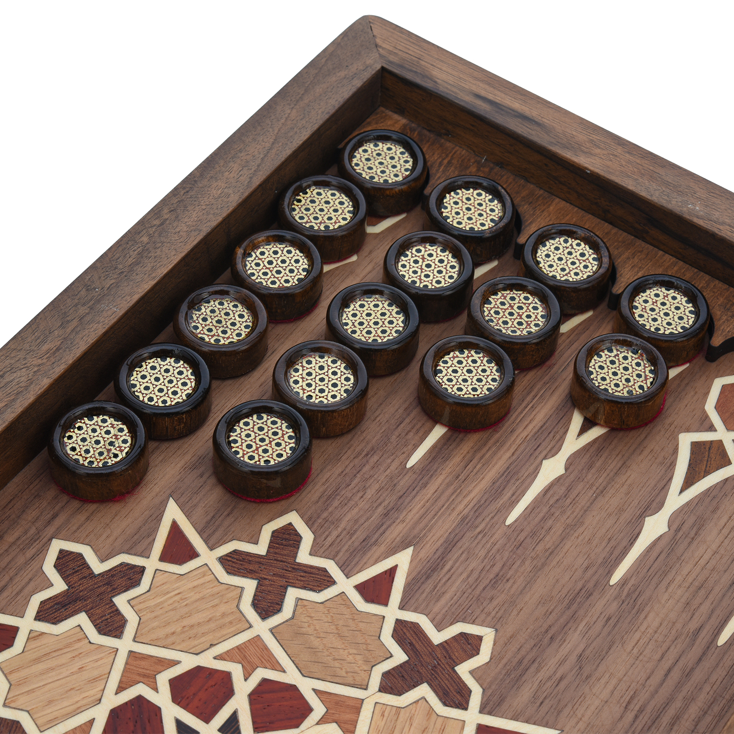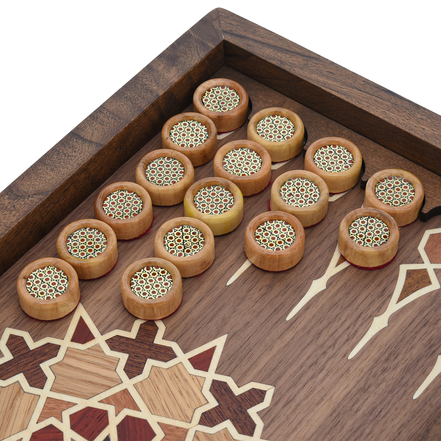 Эксклюзивные нарды - шашки ручной работы, выполненные из натурального массива дерева, украшены изящной инкрустацией разноцветными шпонами ценных пород. Геометрические узоры, сочетающие контрастные оттенки и текстуры, подчеркивают природную эстетику материала, добавляя изделию утонченности и роскоши. Прочная конструкция и тщательная обработка гарантируют долговечность набора, а деревянные шашки, стилистически созвучные дизайну, завершают гармоничный образ. Идеальный выбор для ценителей классических игр, эко-эстетики и уникальных предметов интерьера, созданных с любовью к деталям.При создании данных изделий мастера используют технику "Маркетри", где естественные оттенки и текстура древесины (например, ореха, красного дерева, клёна) используется для создания контрастов, иллюзии объёма и сложных узоров. Элементы шпона вручную подгоняются, склеиваются и фиксируются на основе, после чего поверхность шлифуется и покрывается лаком.