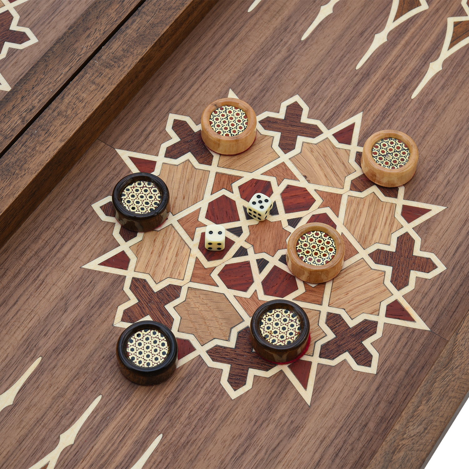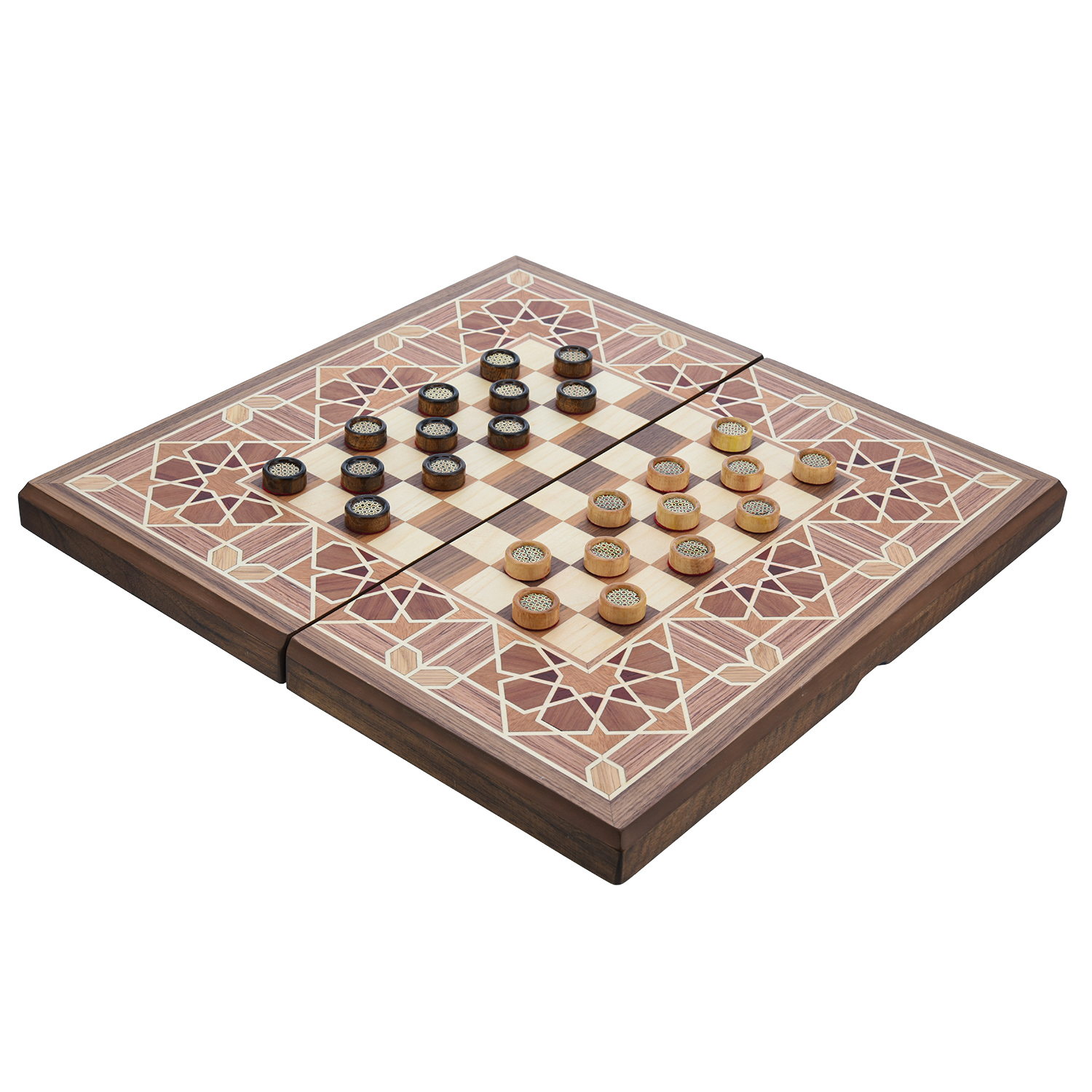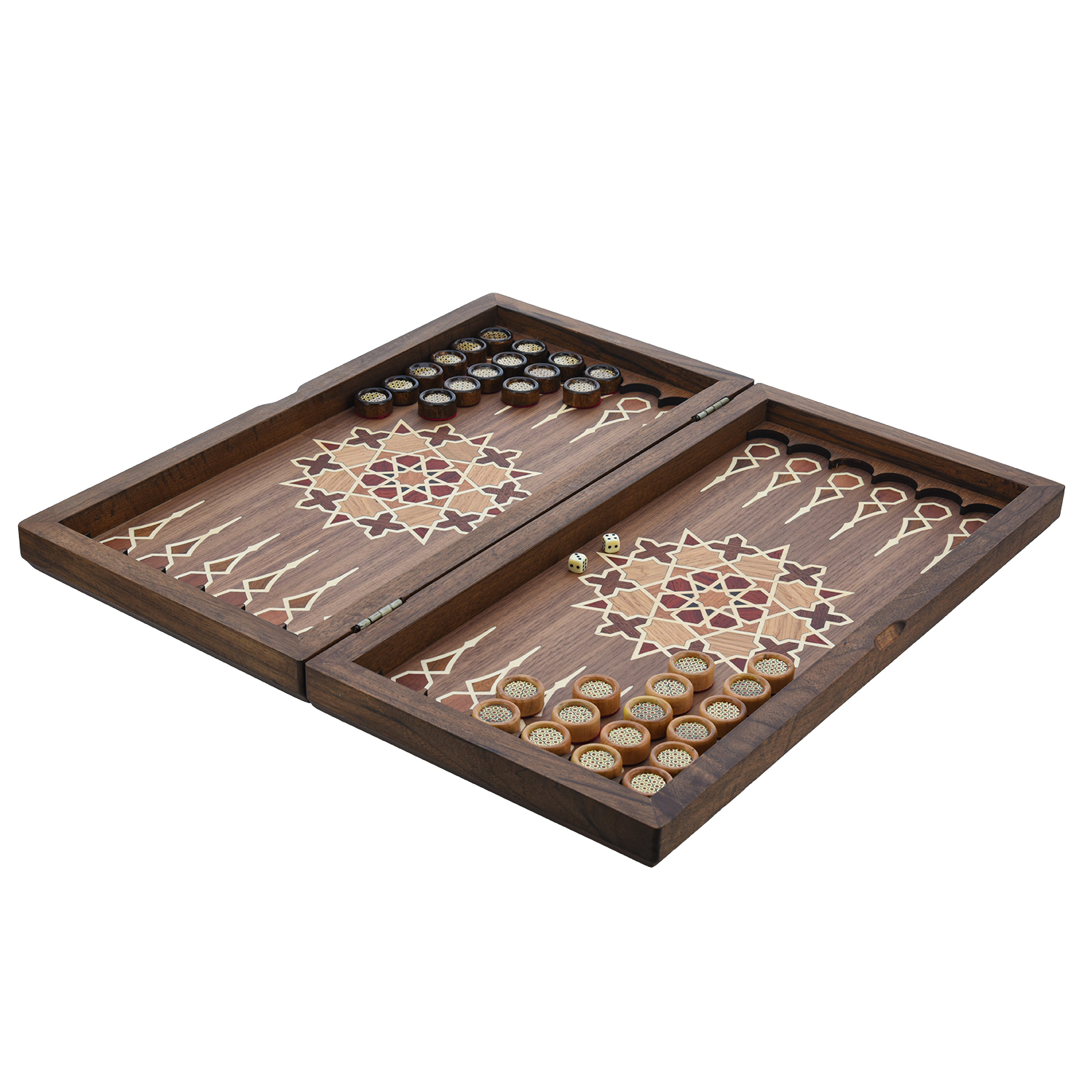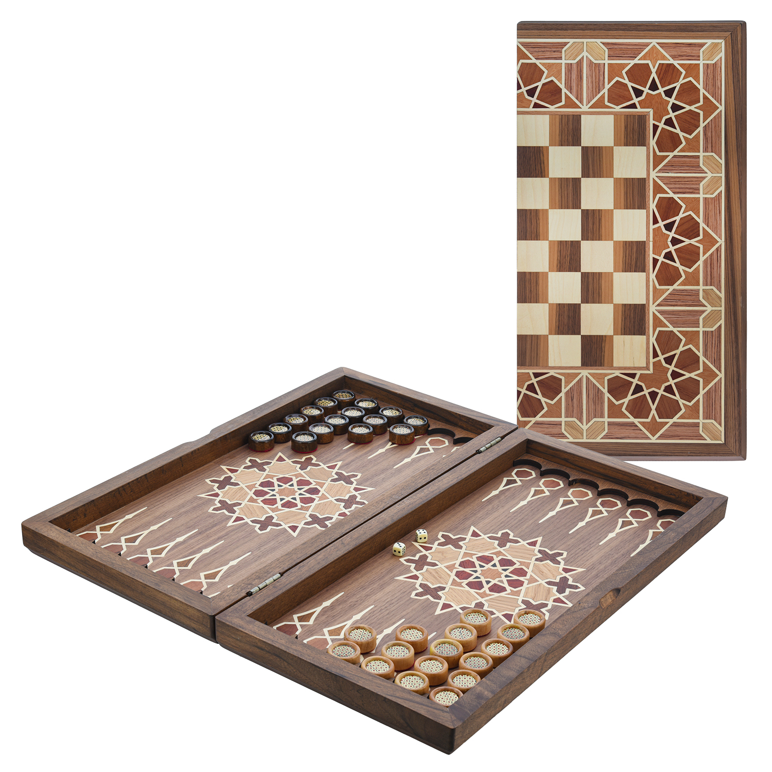 Эксклюзивные нарды - шашки ручной работы, выполненные из натурального массива дерева, украшены изящной инкрустацией разноцветными шпонами ценных пород. Геометрические узоры, сочетающие контрастные оттенки и текстуры, подчеркивают природную эстетику материала, добавляя изделию утонченности и роскоши. Прочная конструкция и тщательная обработка гарантируют долговечность набора, а деревянные шашки, стилистически созвучные дизайну, завершают гармоничный образ. Идеальный выбор для ценителей классических игр, эко-эстетики и уникальных предметов интерьера, созданных с любовью к деталям.При создании данных изделий мастера используют технику "Маркетри", где естественные оттенки и текстура древесины (например, ореха, красного дерева, клёна) используется для создания контрастов, иллюзии объёма и сложных узоров. Элементы шпона вручную подгоняются, склеиваются и фиксируются на основе, после чего поверхность шлифуется и покрывается лаком.