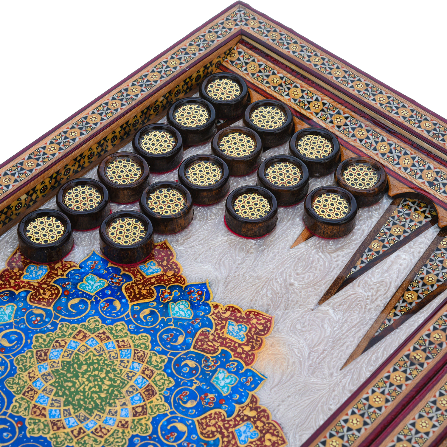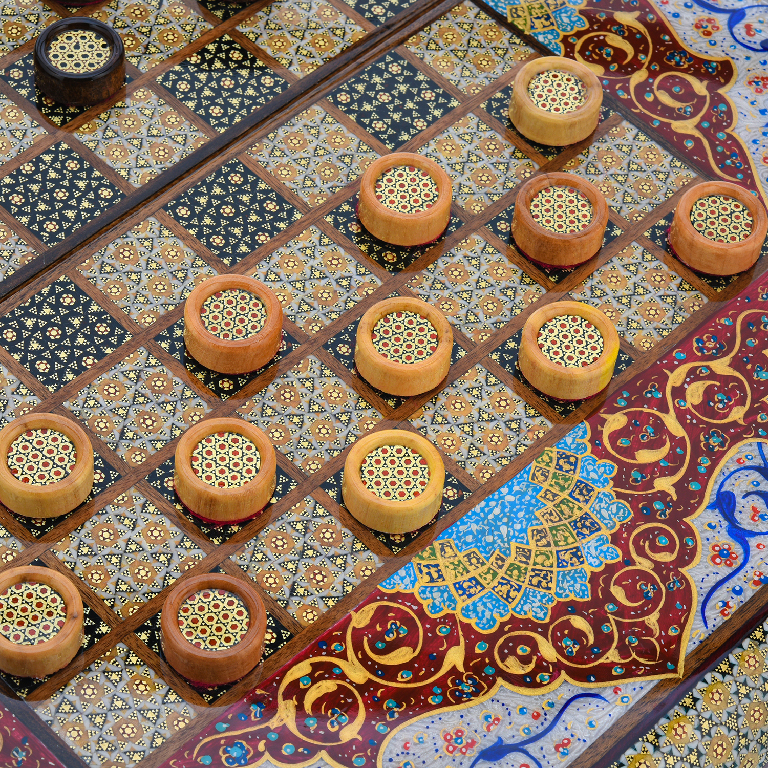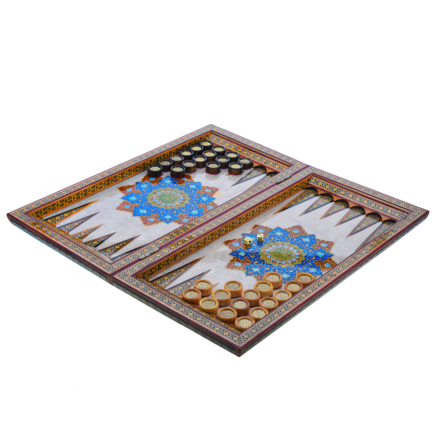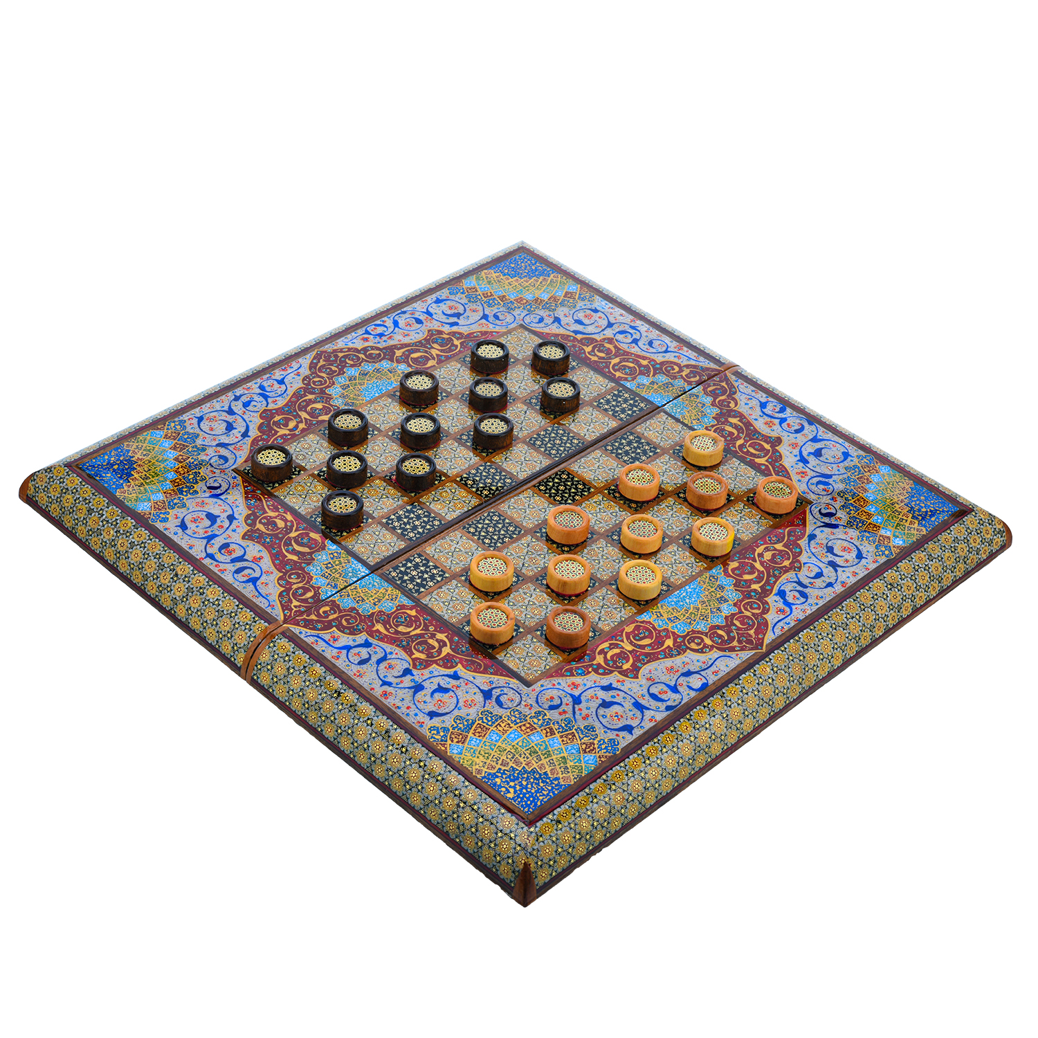 Роскошные нарды ручной работы, выполненные из массива, сочетают в себе изысканность природной текстуры древесины и искусство персидской техники Хатам Кари. Инкрустация геометрическими узорами из разноцветных пород дерева, металла и кости придаёт игровому полю уникальный декоративный эффект. В комплекте — деревянные шашки, гармонирующие с дизайном. Идеальный выбор для ценителей эксклюзивных настольных игр, восточной эстетики и элитных аксессуаров интерьера.Размер: 490х250х70 мм ....