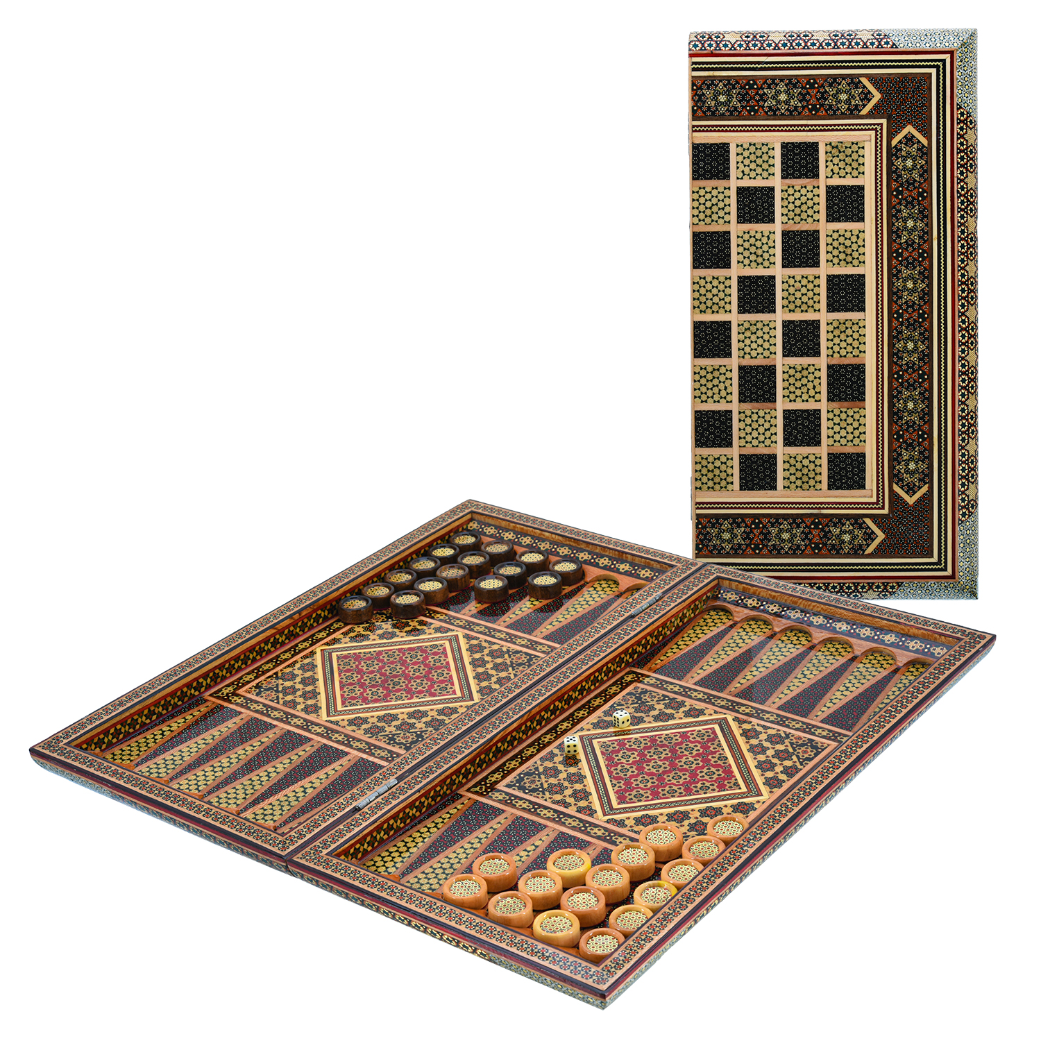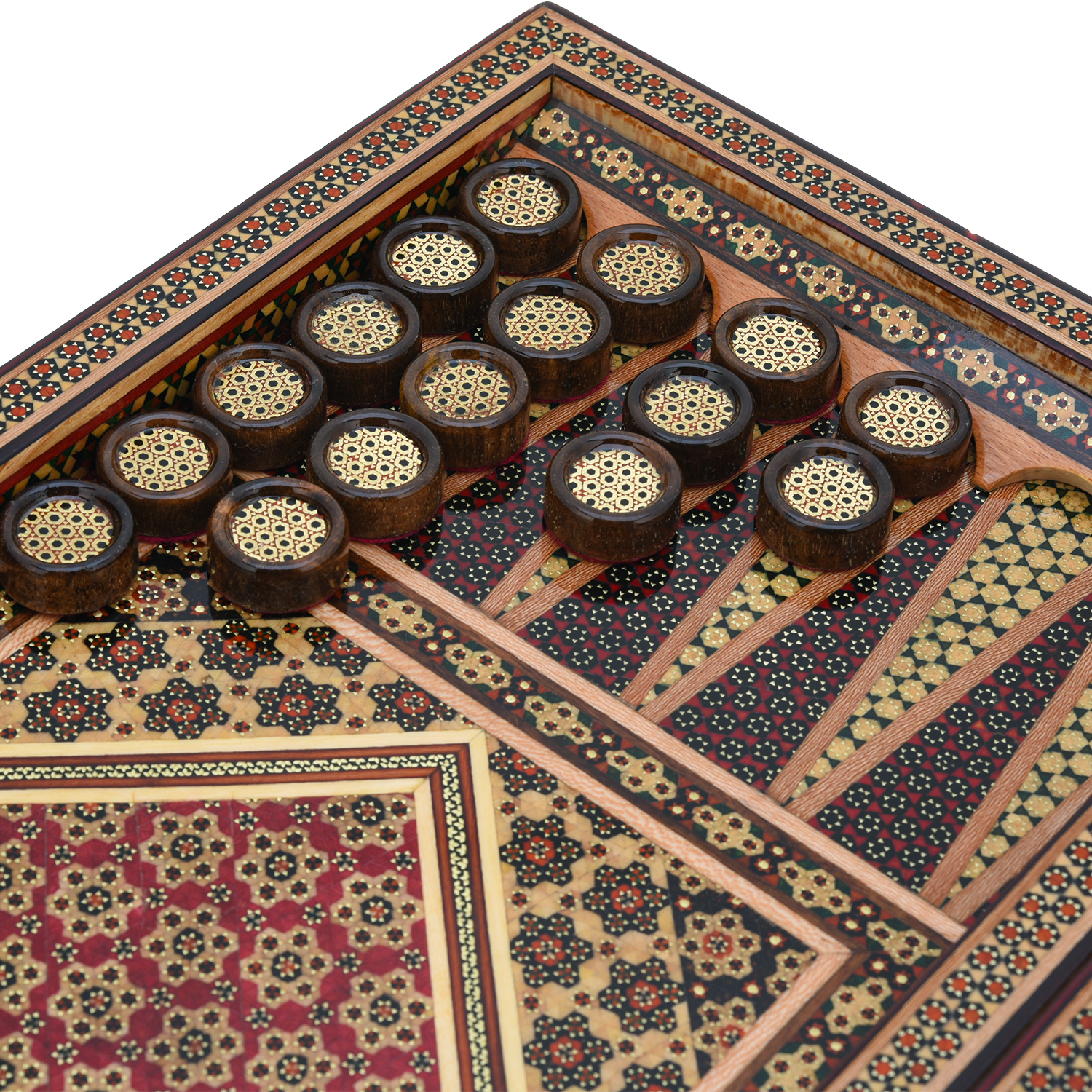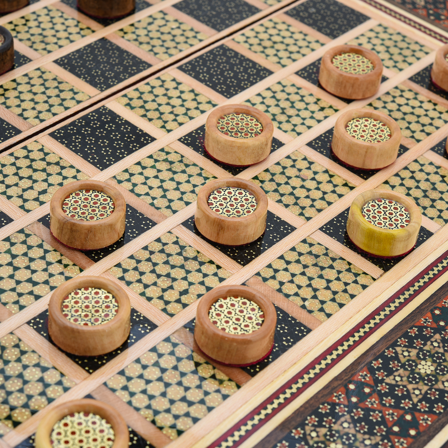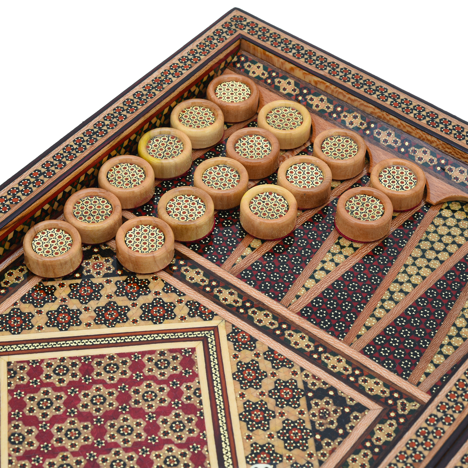 Роскошные нарды ручной работы, выполненные из массива, сочетают в себе изысканность природной текстуры древесины и искусство персидской техники Хатам Кари. Инкрустация геометрическими узорами из разноцветных пород дерева, металла и кости придаёт игровому полю уникальный декоративный эффект. В комплекте — деревянные шашки, гармонирующие с дизайном. Идеальный выбор для ценителей эксклюзивных настольных игр, восточной эстетики и элитных аксессуаров интерьера.Размер: 490х250х70 мм