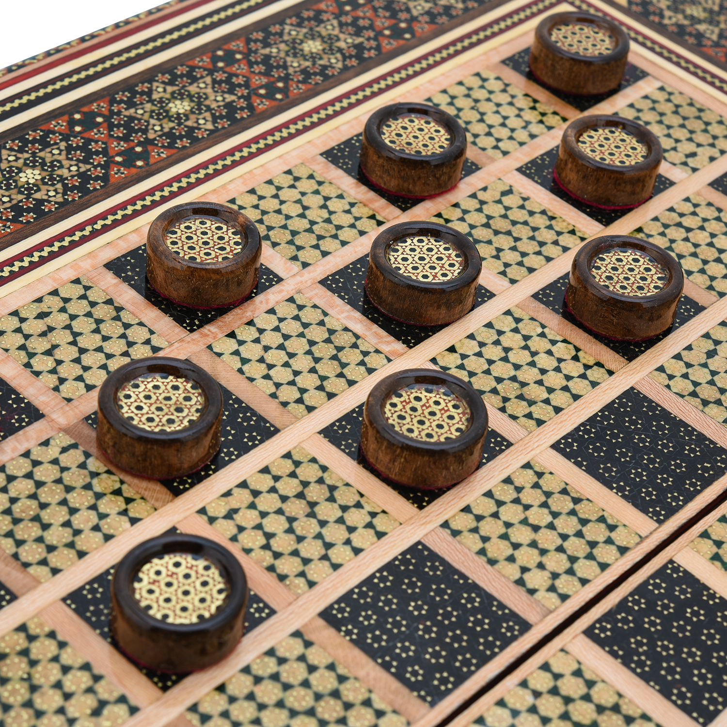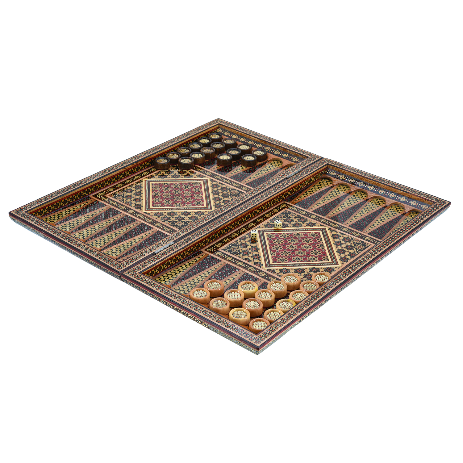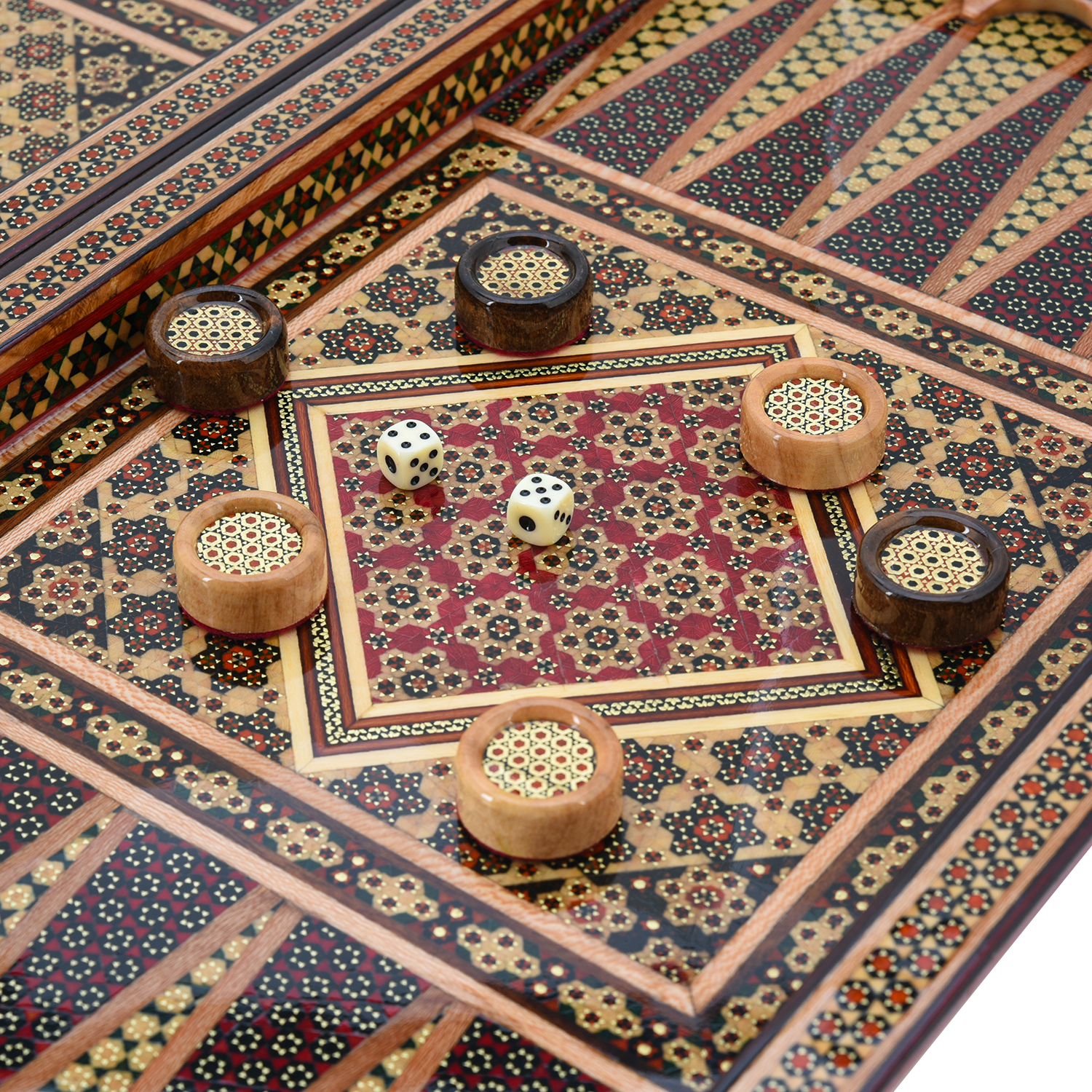 Роскошные нарды ручной работы, выполненные из массива, сочетают в себе изысканность природной текстуры древесины и искусство персидской техники Хатам Кари. Инкрустация геометрическими узорами из разноцветных пород дерева, металла и кости придаёт игровому полю уникальный декоративный эффект. В комплекте — деревянные шашки, гармонирующие с дизайном. Идеальный выбор для ценителей эксклюзивных настольных игр, восточной эстетики и элитных аксессуаров интерьера.Размер: 490х250х70 мм