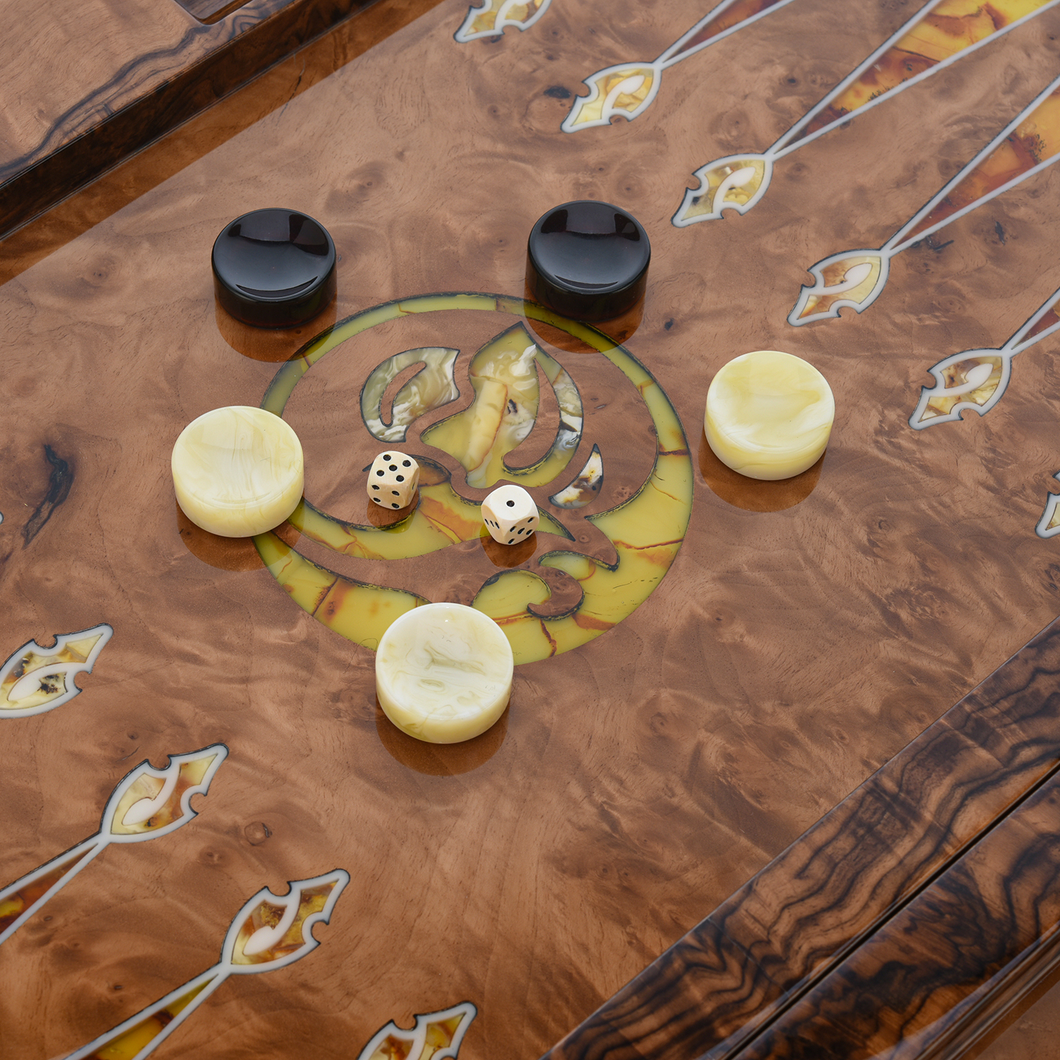 Нарды, трик-трак, бэкгаммон, тавла, шеш-беш, коша насчитывают свыше 5 тысяч лет и переводятся с древнеиранского языка как храбрый. Древние египтяне играли в сенет из семейства «гоночных игр», где ходы контролируются игральными костями, в 3500 до н. э.. В царской игре Ура участвовали жители древней Месопотамии. Находки в Шахри-Сухте в Иране показали, что похожая игра (две кости и 60 фишек) существовала около 3000 до нашей эры. Римская табула была идентична современным нардам, ее описал в эпиграмме византийский император Зенон. Предшественником ее считается древнеримская игра Ludus duodecim scriptorum (с латинского «игра двенадцати знаков»). Она упоминается в «Науке любви» Овидия. Мореный дуб (от французского «marais» - болото) является драгоценным древесным материалом с серебристо-седыми благородными прожилками. Столетиями, тысячелетиями затонувшие дубовые стволы находились на дне водоемов, где без доступа воздуха, в процессе морения приобрели прочность подобно камню. Нежные палевые оттенки свидетельствуют о возрасте морения в 300-400 лет, а черный цвет - более чем 1000 лет. Мореный дуб именуют «черным» или «железным деревом» из-за высокой минерализации солями металла. Древесина, благодаря длительному пребыванию в воде, обладает мощной энергетикой. .