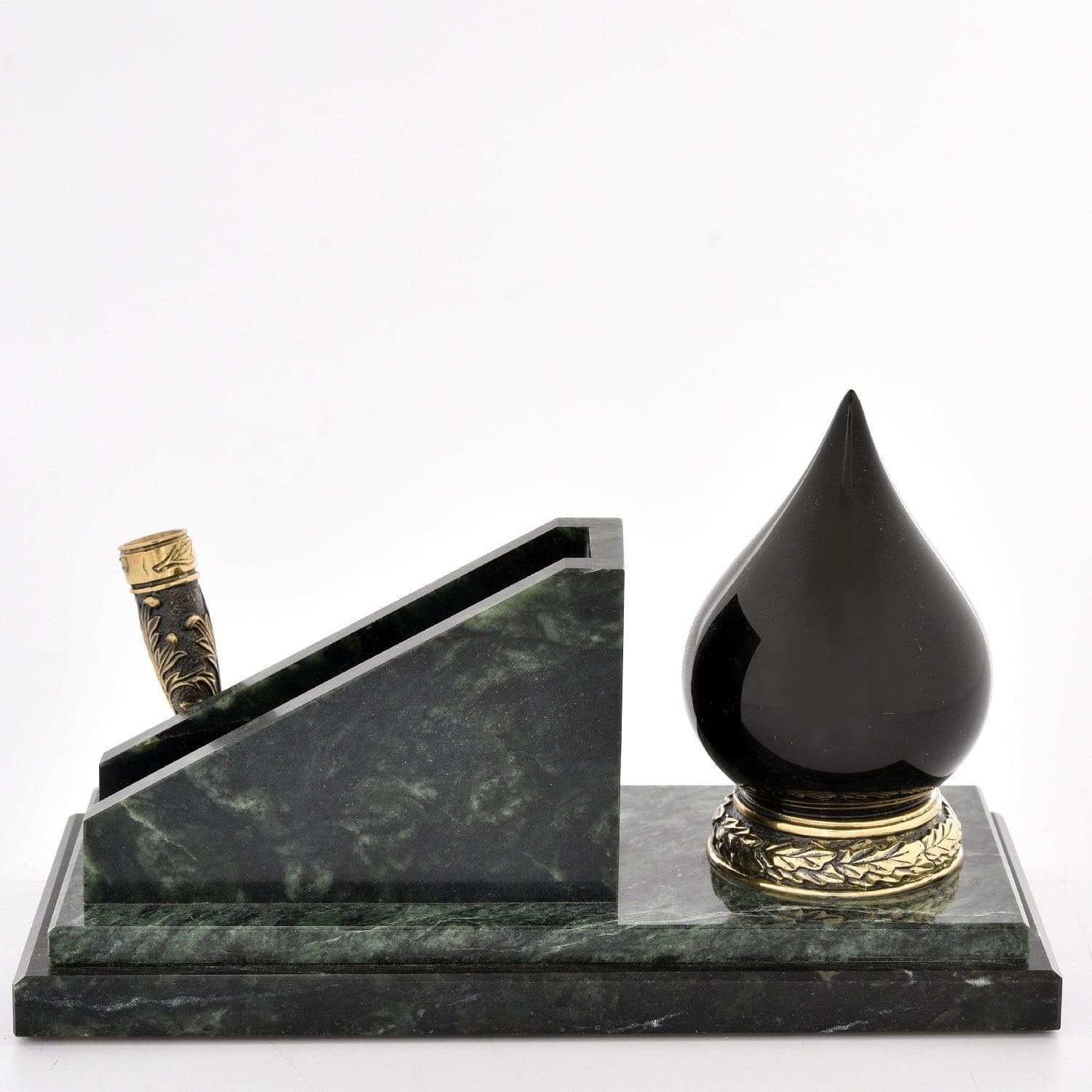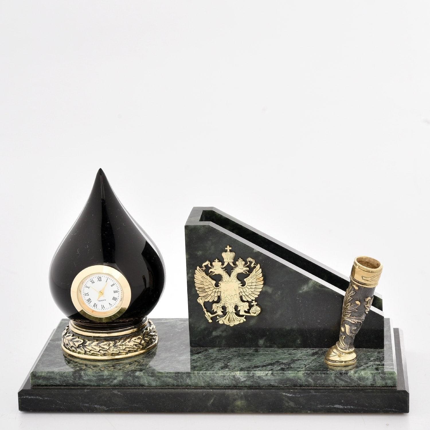 Эта авторская визитница с российской символикой поможет навести порядок на рабочем столе и станет символом должностного статуса. Она представляет собой адресный подарок на День газовика и нефтяника для сотрудника нефтегазовой отрасли России. Этот символичный авторский интерьерный аксессуар включает скульптур в виде капли нефти из оникса с часовым механизмом; ёмкость для визиток украшена гербом, оба предмета установлены на постамент-подставку из натурального камня, змеевика...