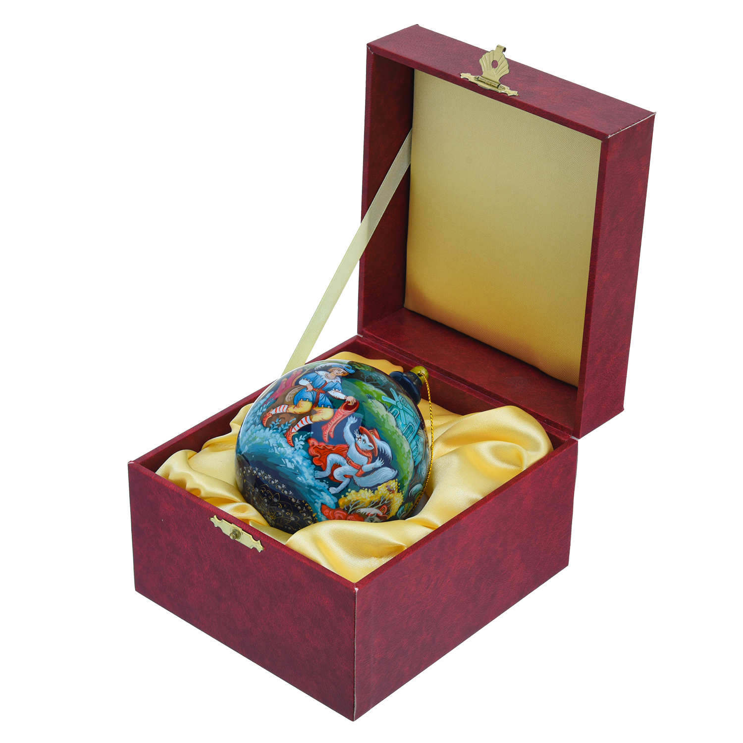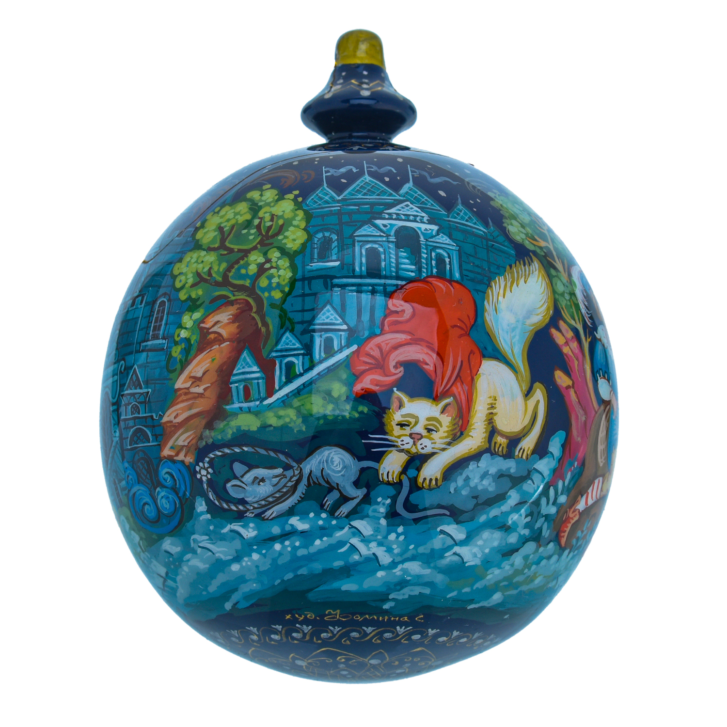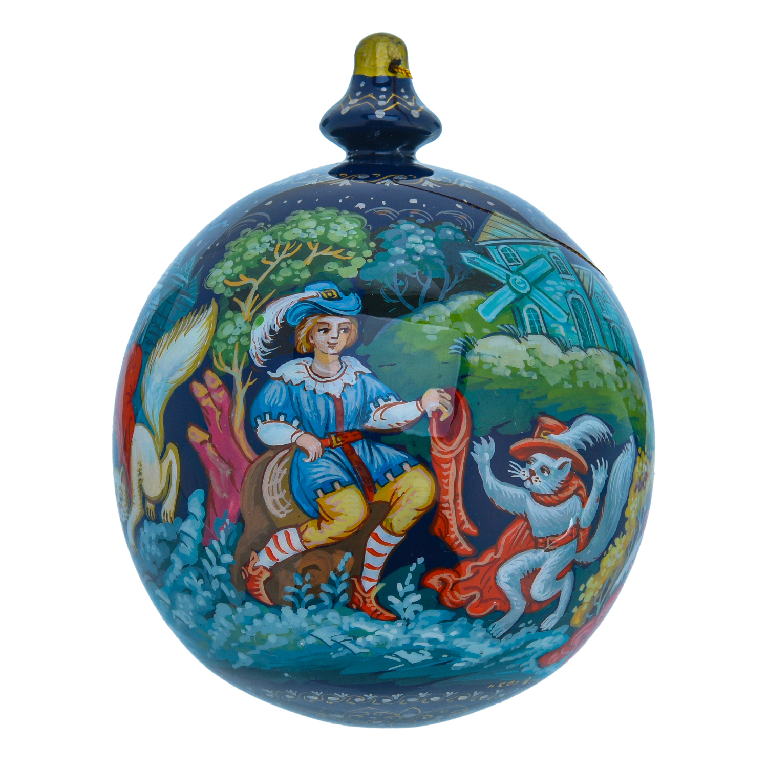 Елочный шар с росписью "Кот в сапогах".Материалы: дерево, краски, лак.