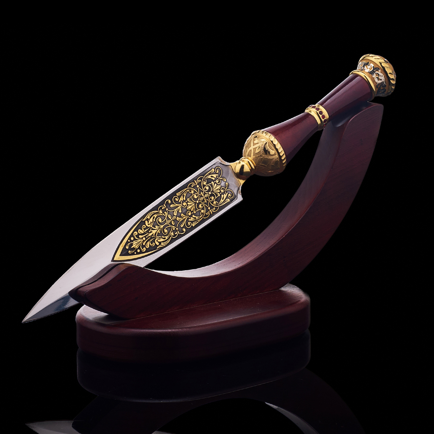 Нож для бумаг на подставке "Кабинетный". Златоуст.Материалы: сталь, латунь, никель, золото 999,9*, дерево, фианиты.