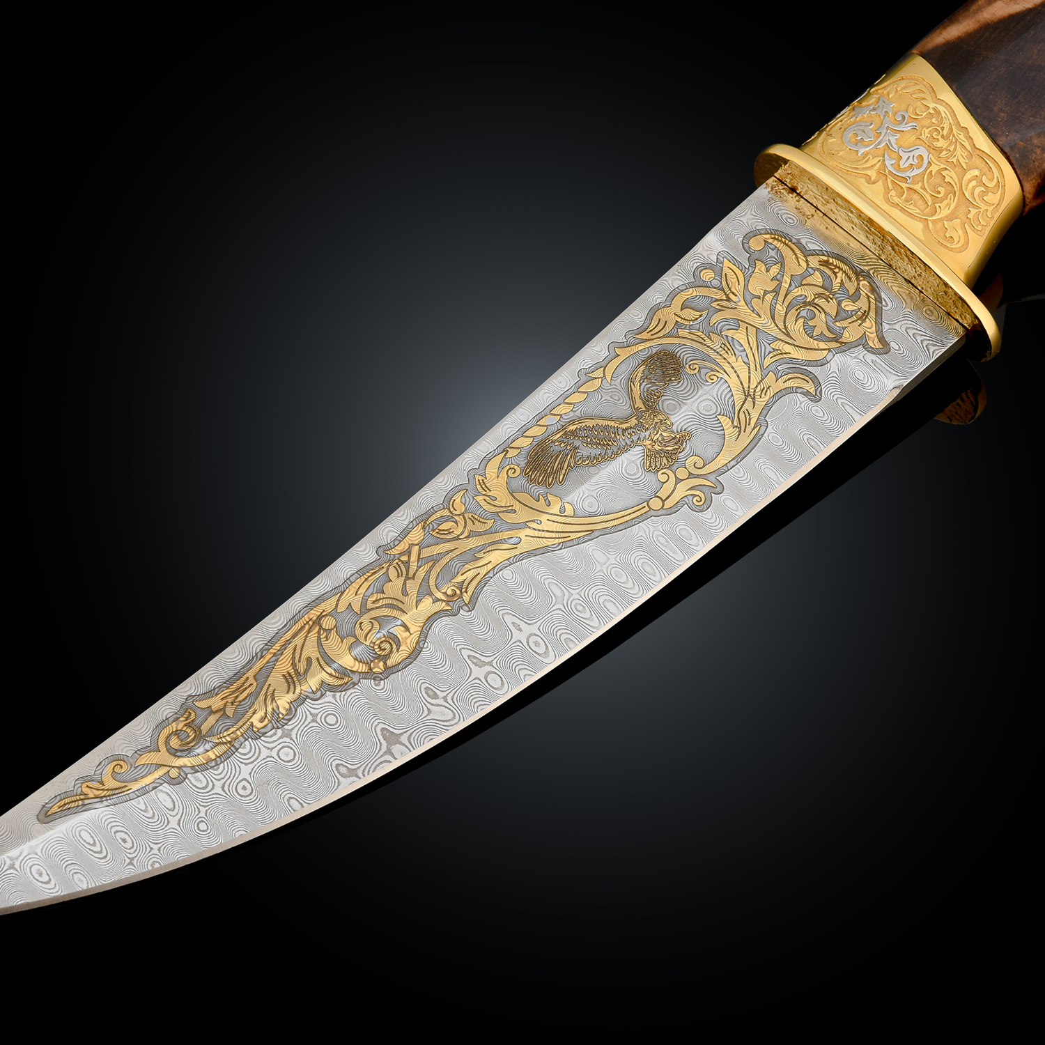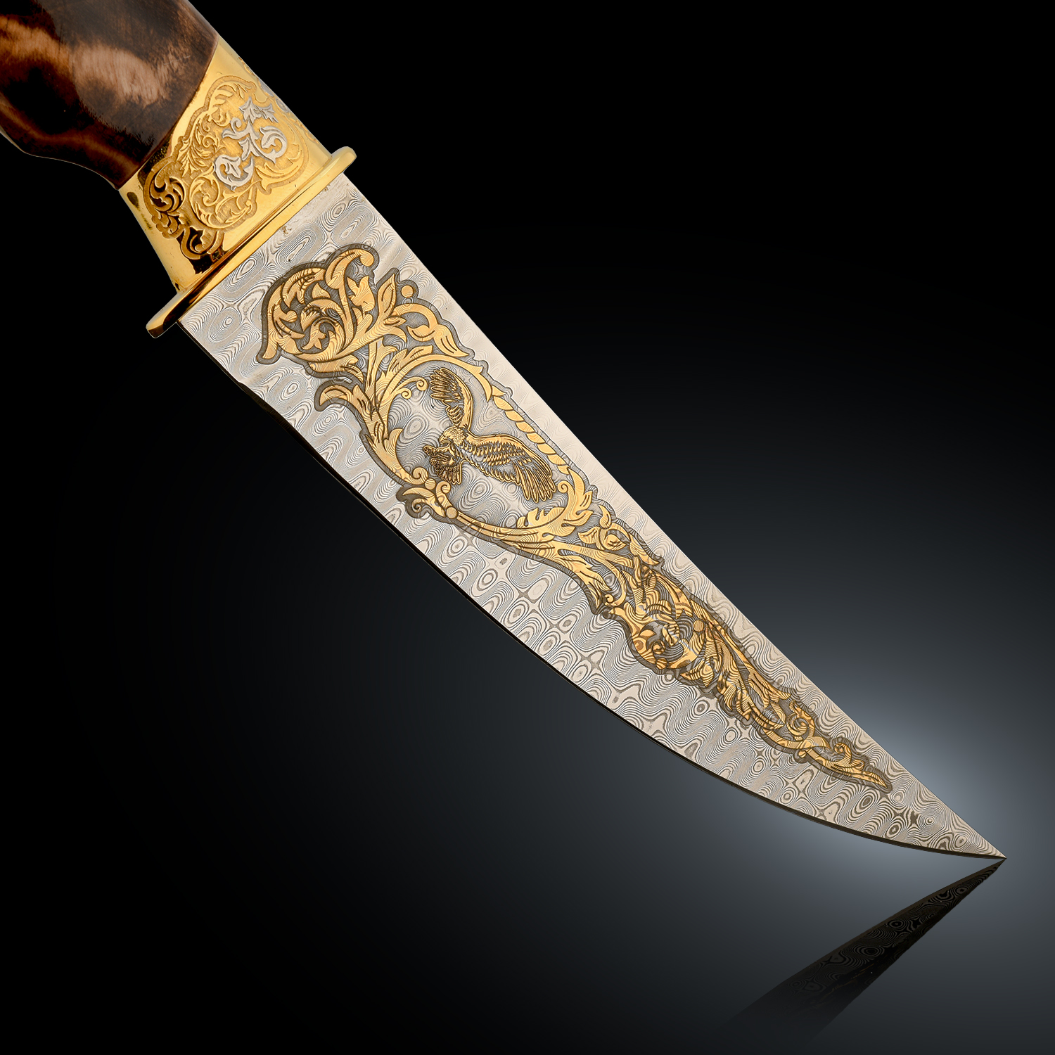 Нож сувенирный "Сокол". Златоуст.Материалы: дамасская сталь, латунь, никель, золото 999,9*, эмаль, дерево, кожа.