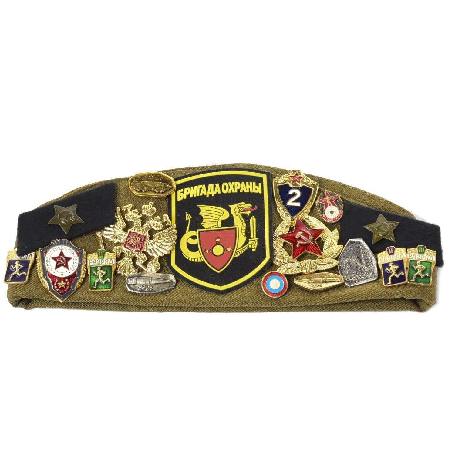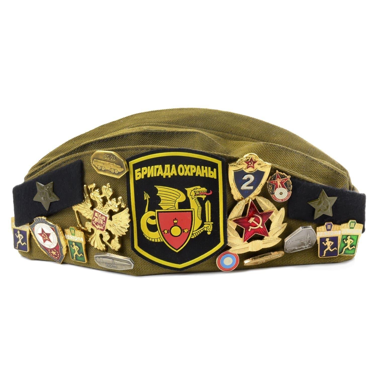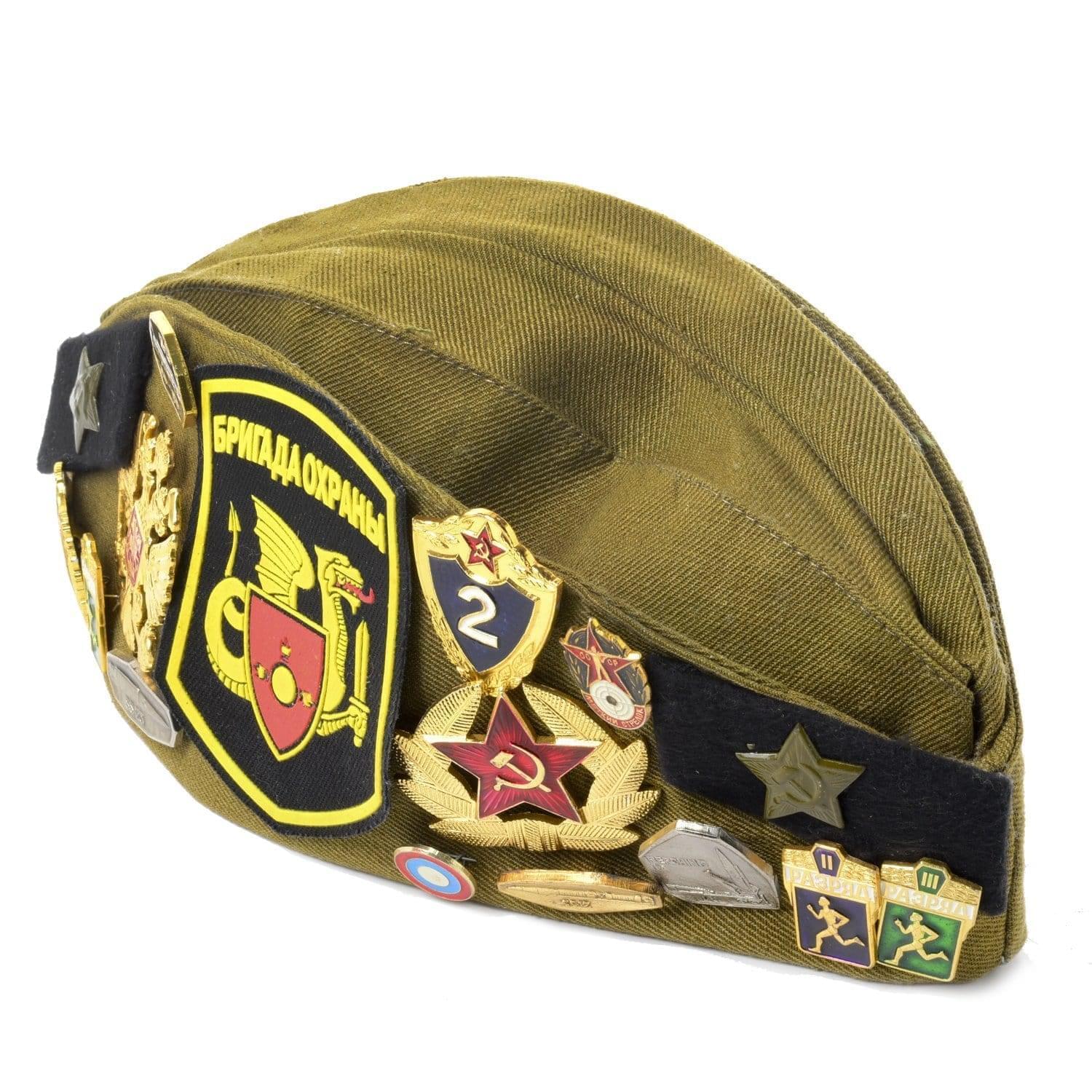 Аксессуары в русском стиле милитари - это вещи вне моды. Мы рады предложить Вашему вниманию военный головной убор цвета хакки с многочисленным знаками отличия СССР и государственным эмблемами. Этот головной убор в виде сплюснутой с боком легкой шапочки носился рядовыми ВС СССР. Он универсален для мужчин и женщин... ....