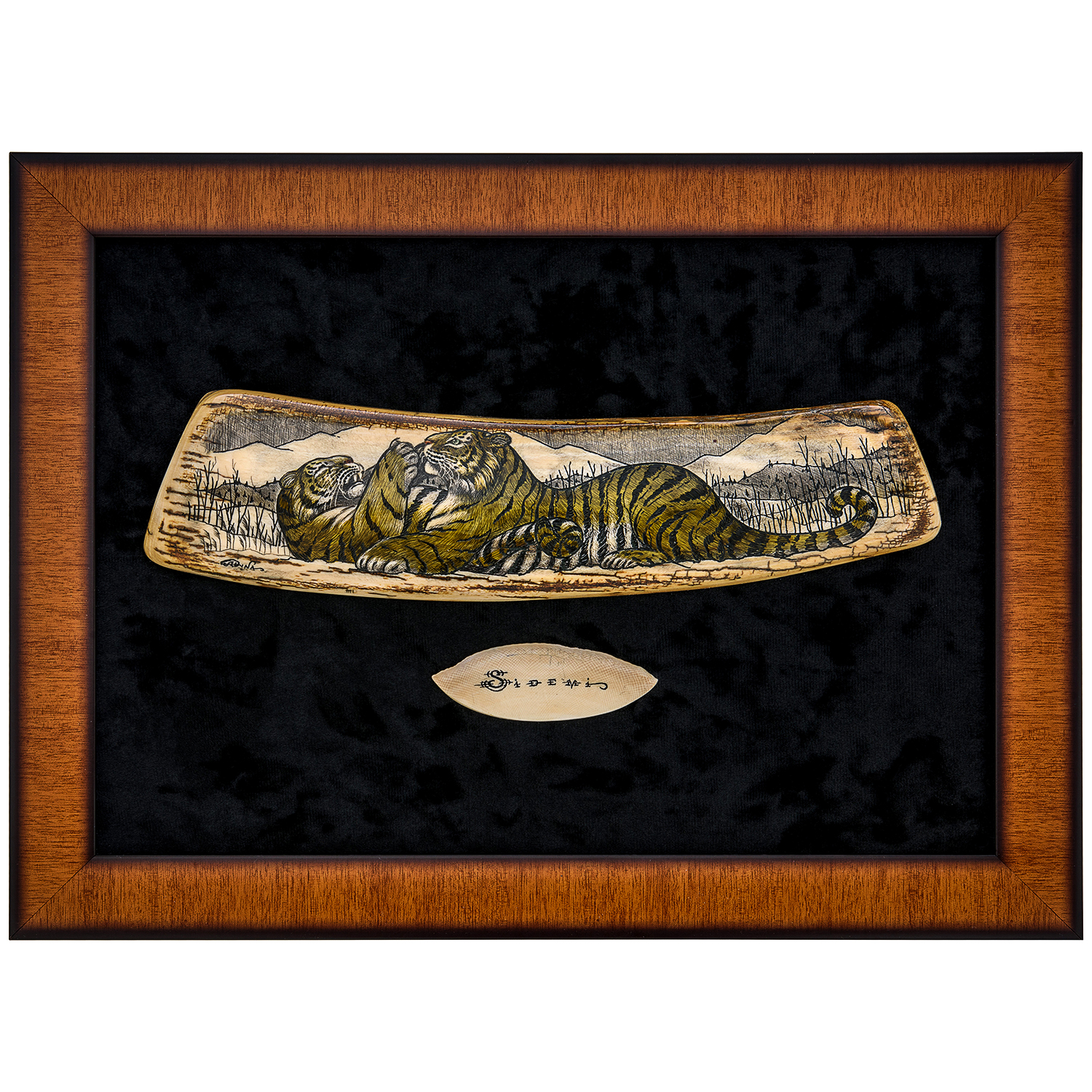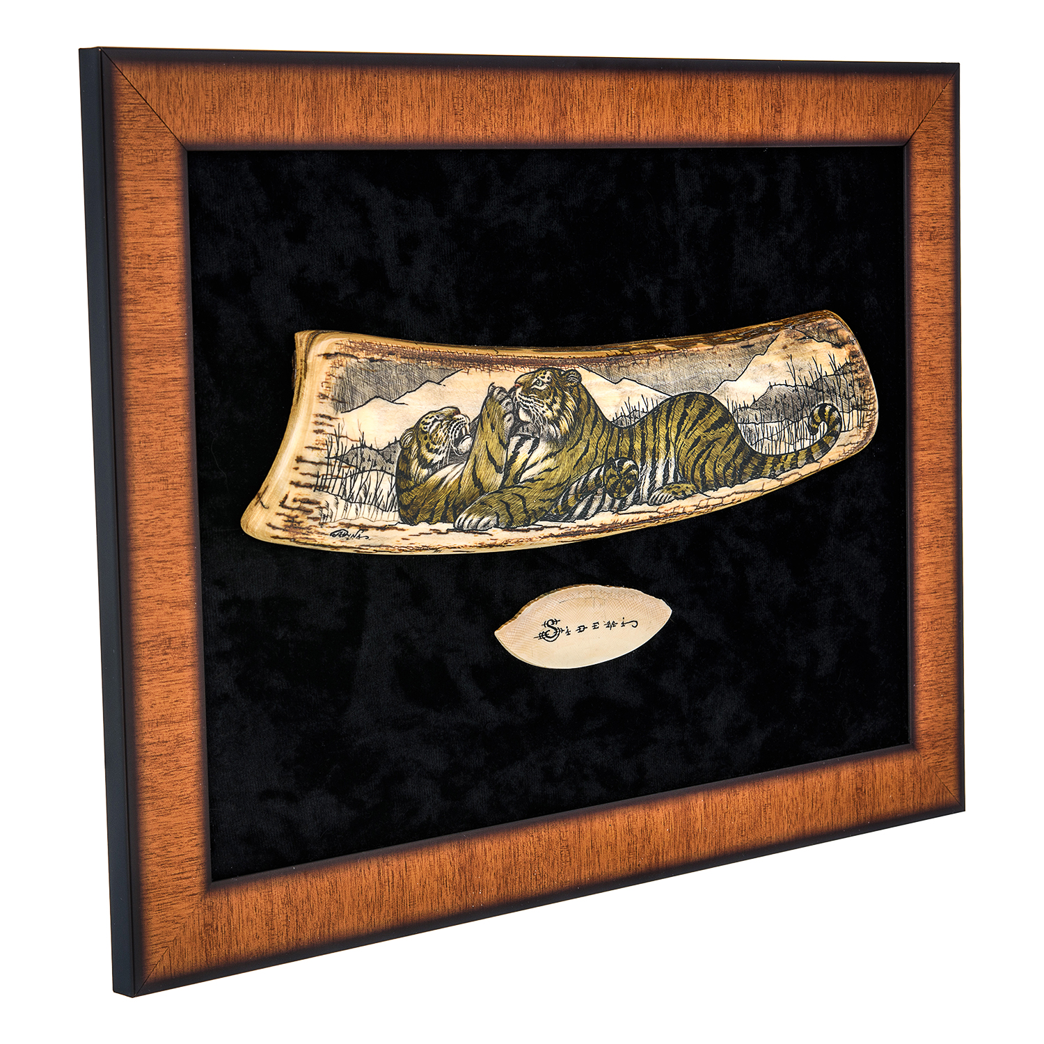 Панно из кости "Тигры".Материалы: кость, паспарту, деревянный багет.