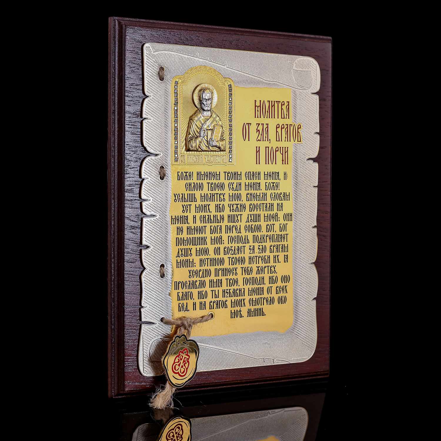 Плакетка "Молитва от зла, врагов и порчи". Златоуст.Материалы: латунь, никель, золото 999,9*, эмаль, дерево.