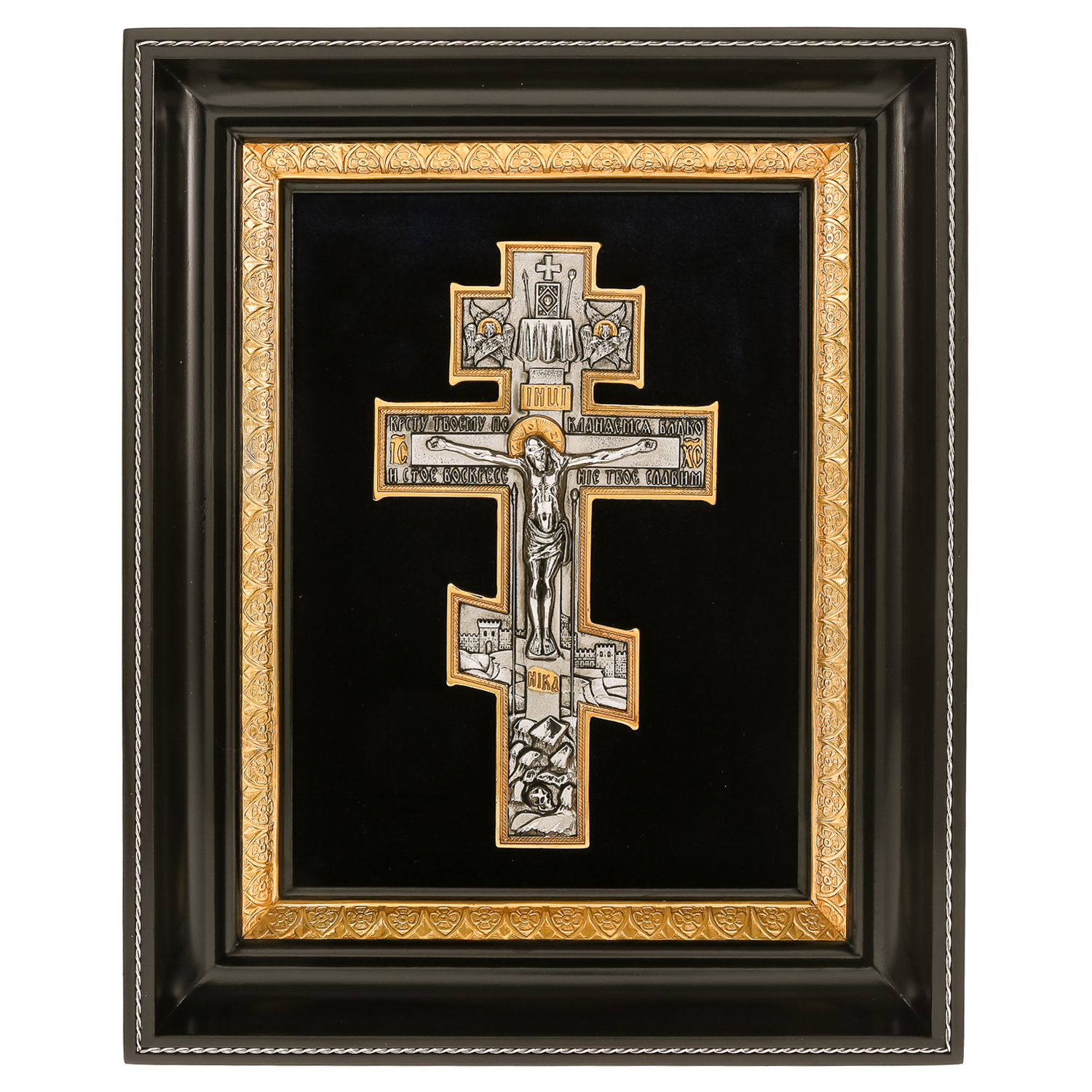 Панно "Крест".Панно является произведением ручной работы. Крест выполнен из меди, обработанной в технике гальванопластики, с гальваническим покрытием золотом и серебром. Рама резная, изготовлена из массива лиственных пород древесины и покрыта атмосферостойким лаком.
