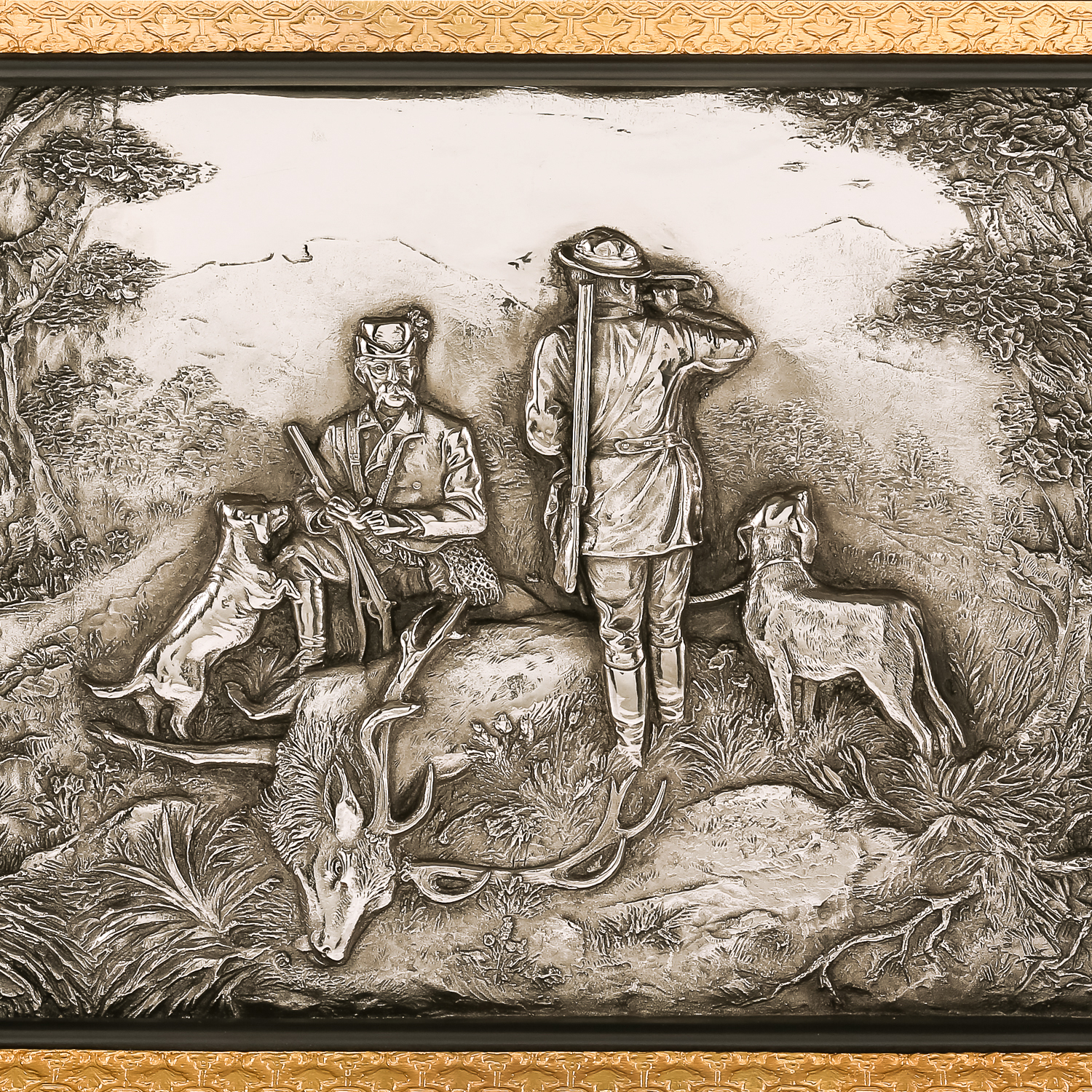 Панно "Охота".Материалы: гальванопластика (медь, серебрение) дерево, золочение.