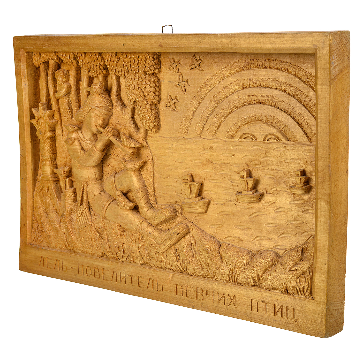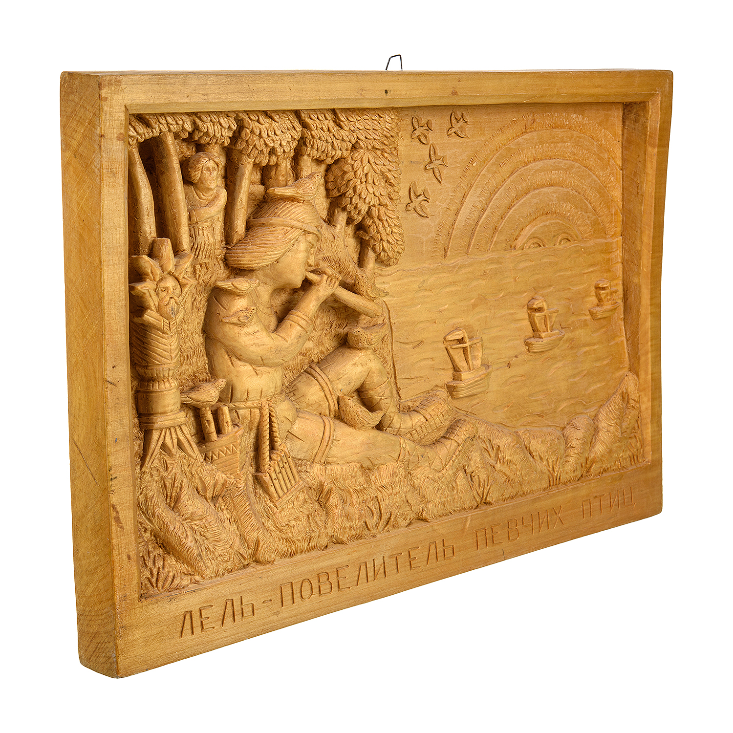 Русские подарки и сувениры → Интерьерные изделия → Панно → Деревянное резное панно "Лель, повелитель птиц" 49х33 см
