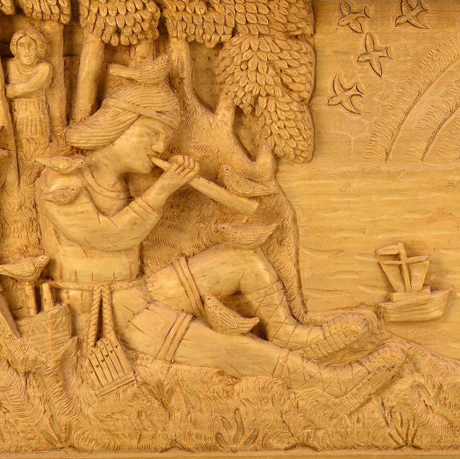 Деревянное резное панно "Лель, повелитель птиц" 49х33 см