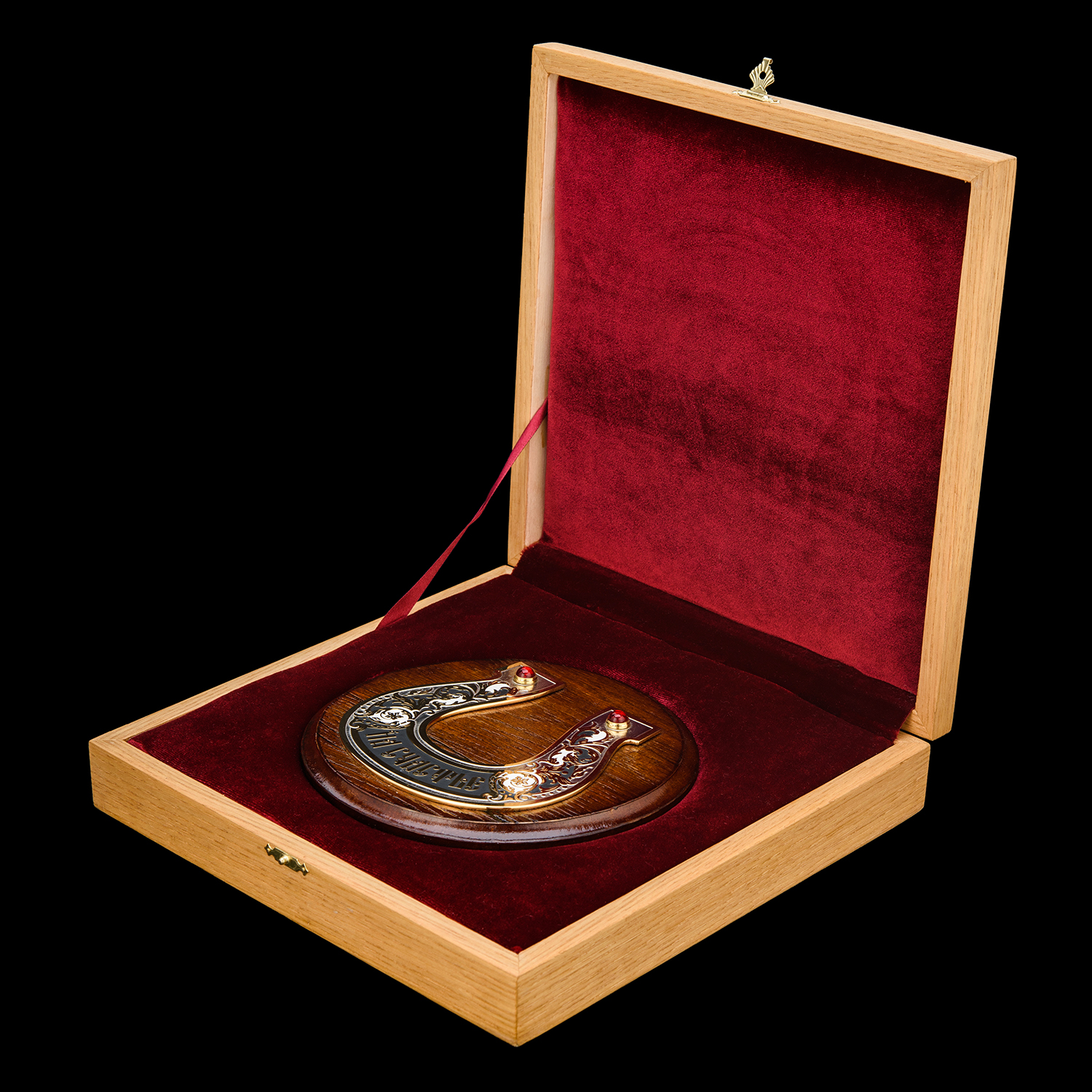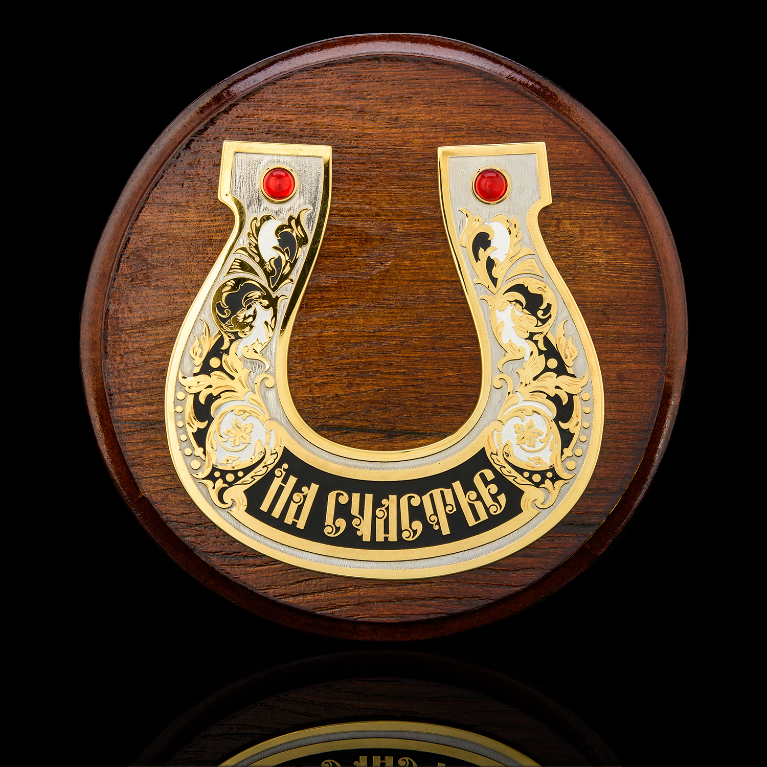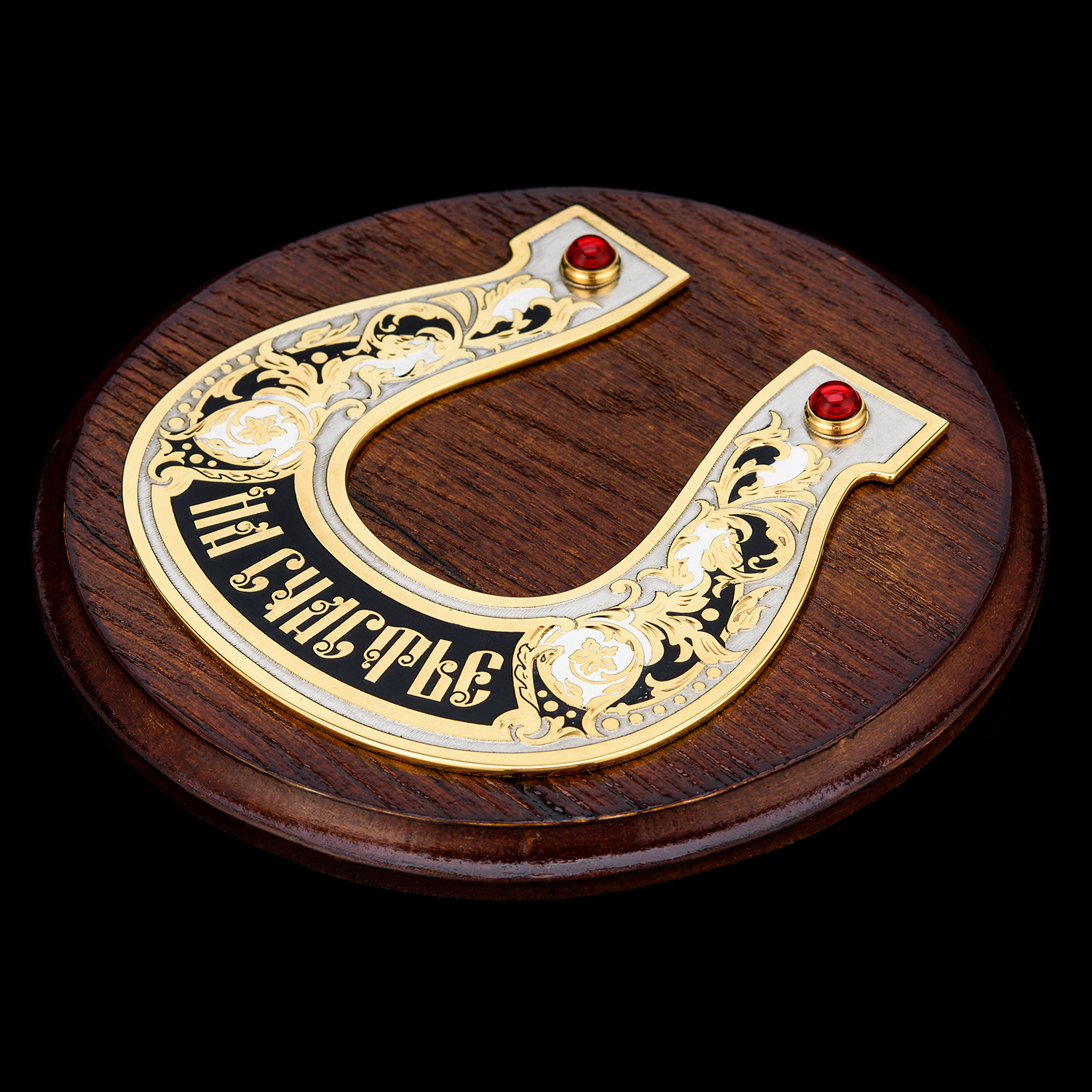 Панно "Подкова на счастье". Златоуст.Материалы: латунь, никель, золото 999,9*, эмаль, фианиты, дерево.