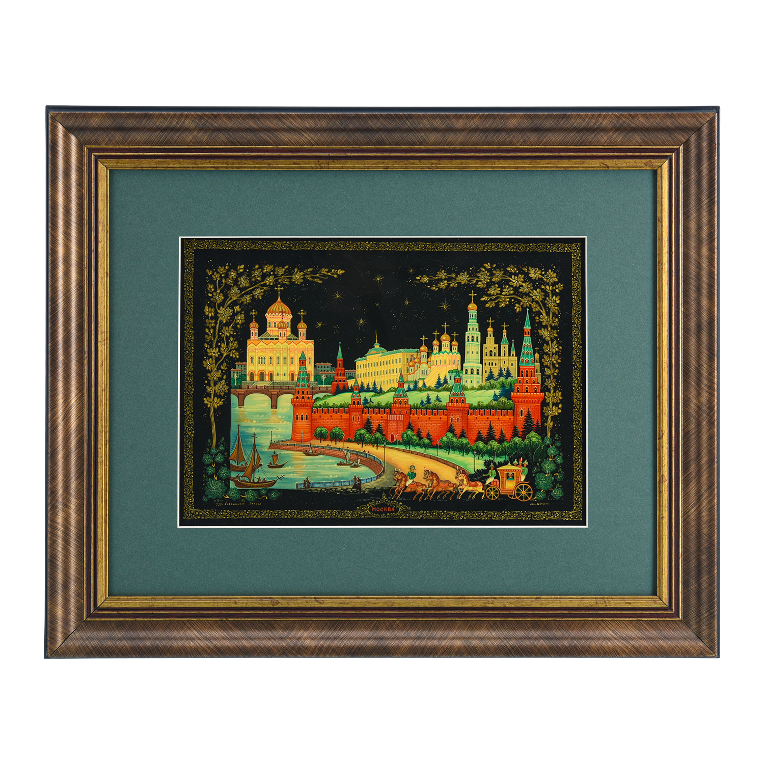 Панно с художественной росписью "Москва".Материалы: папье-маше, краски, лак, паспарту, деревянный багет.