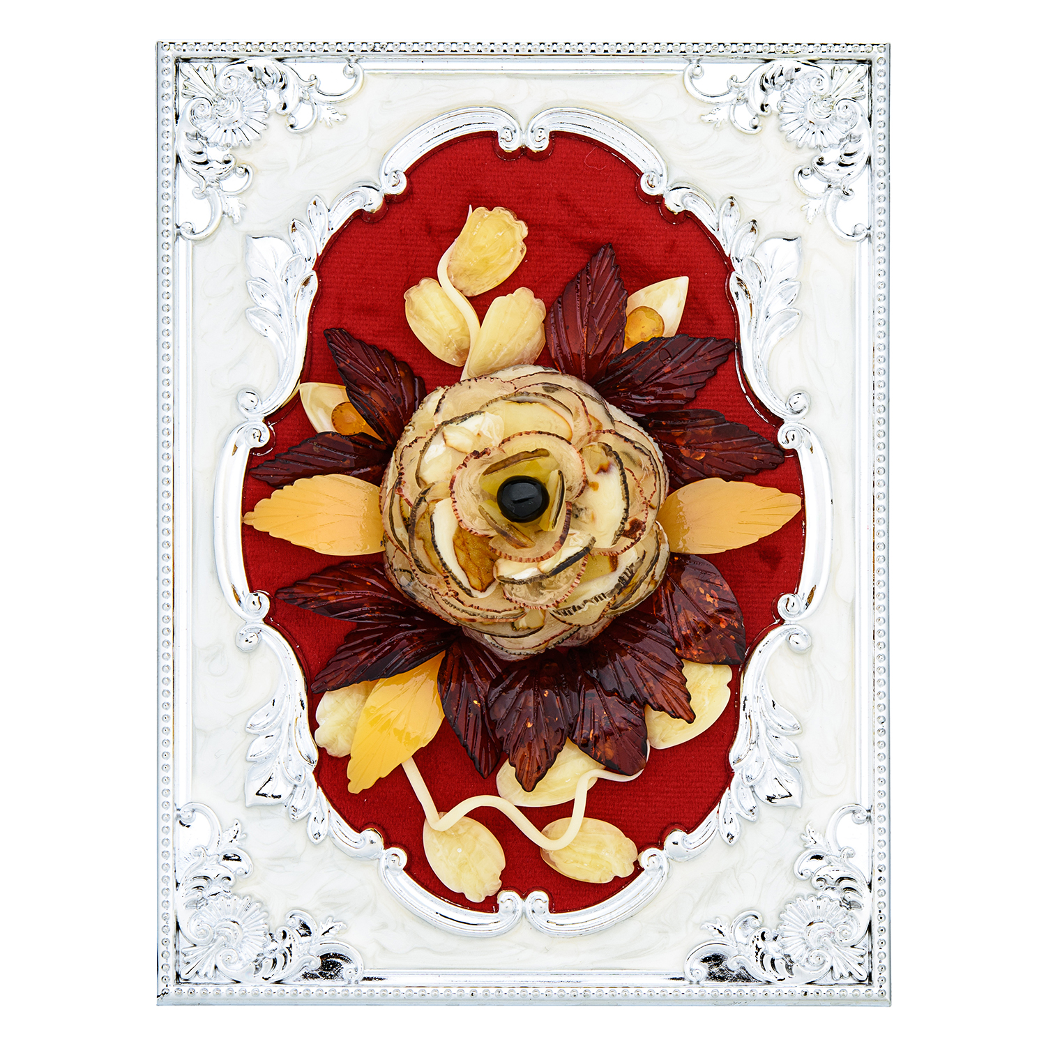 Русские подарки и сувениры → Интерьерные изделия → Панно → Настольное янтарное панно "Открытка с цветами" 21х15 см