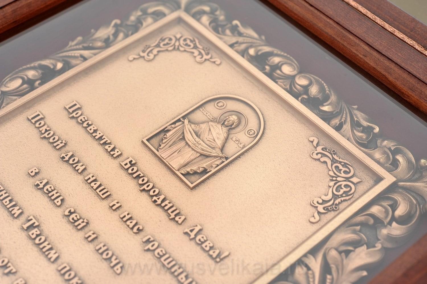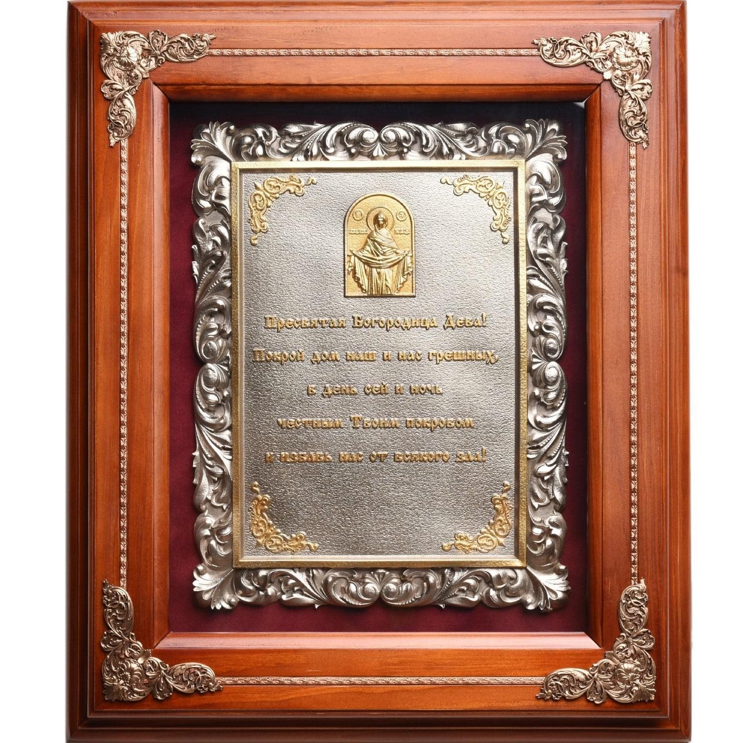 Не можете определиться с достойным запоминающимся подарком на новоселье родным и близким? Возможно, отличный вариант такого презента найдется в нашей большой коллекции панно и офортов ручной работы. Например, это великолепное панно с молитвой и изображением Богородицы станет отличным подарком на новоселье верующему человеку - православному христианину. Панно выполнено по эксклюзивному авторскому эскизу в технике гальванопластики. Работа отличается высокой детализацией, гармоничным сочетанием форм и линий внутри композиции. Оформлено панно в красивую раму из натурального дерева нежно-шоколадного цвета. По углам мастер декорировал раму металлическими аппликациями в виде витиеватых узоров.