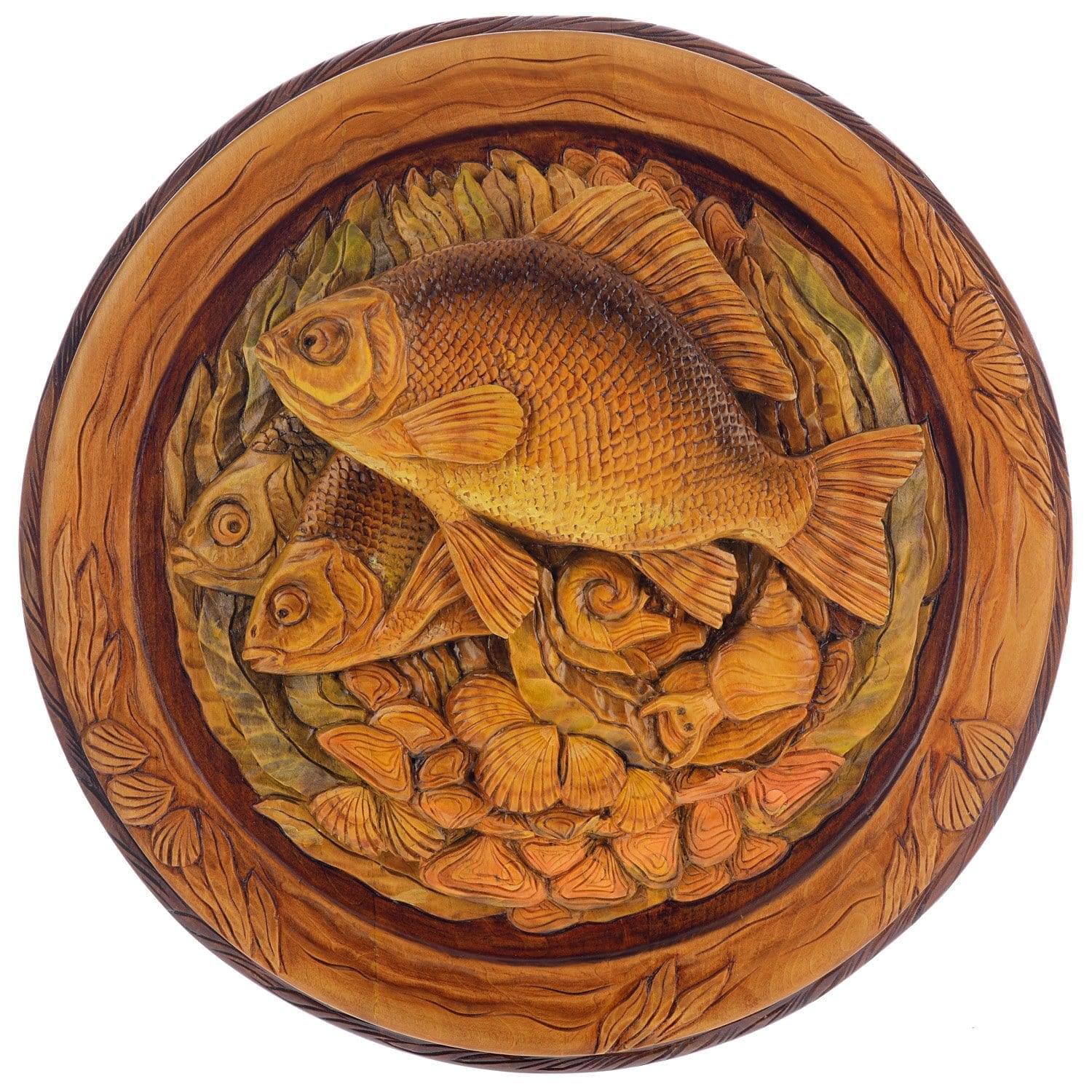 Атмосферная композиция с тремя карасиками привлекает взгляд и завораживает. Композиция отличается детализацией, благодаря которой резчику удалось создать эффект многомерности.  Напомним, что с незапамятных времен резные изделия были предметами культа,   элементами декора в русских избах и дворцах. Дерево почиталось как священный поделочный материал со времен язычества.