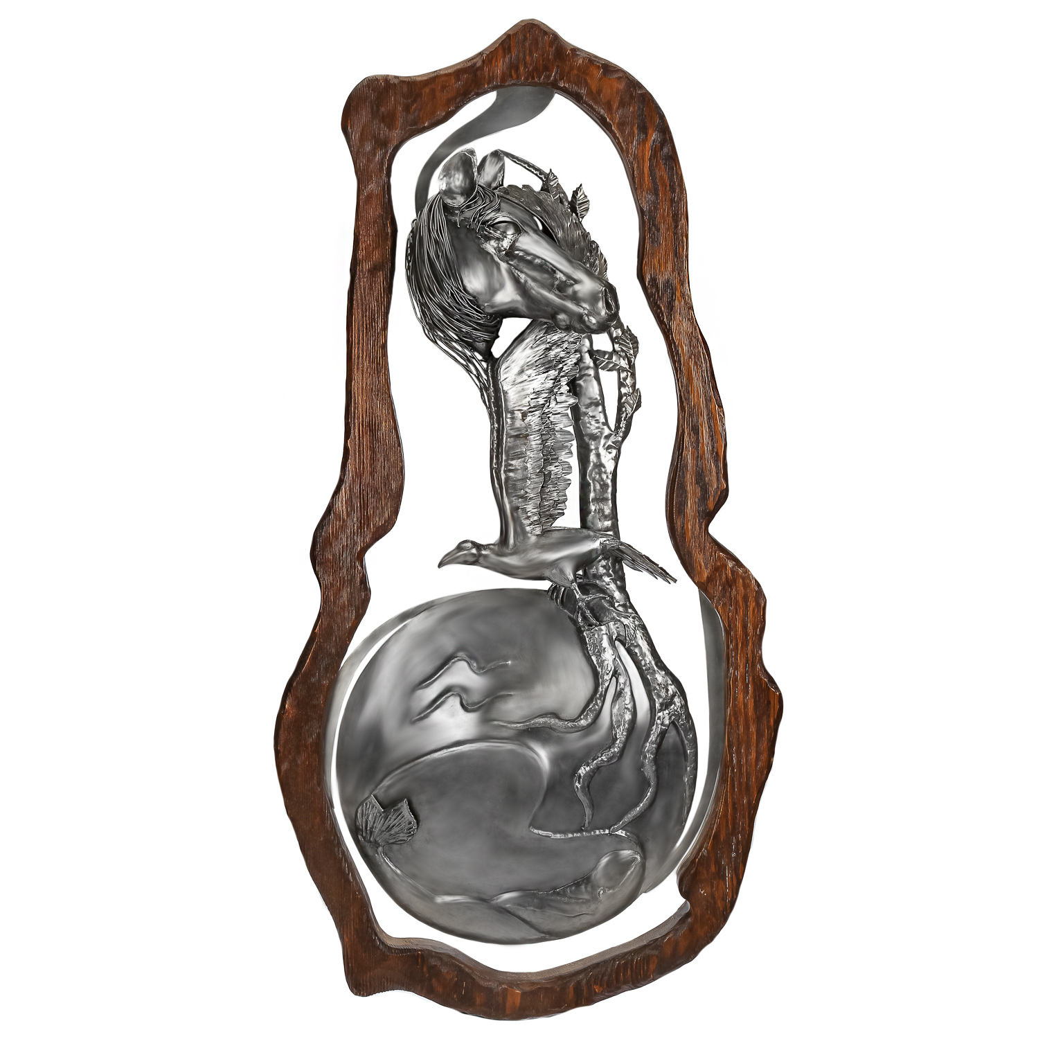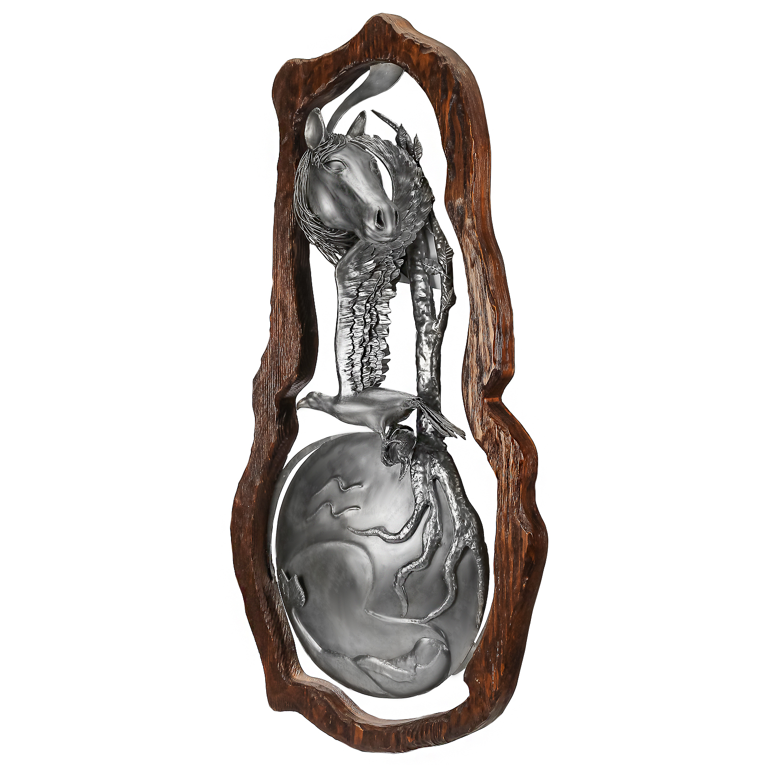 Изделия изготовлено из металлического сплава и ценной породы дерева, отличающейся  роскошной волокнистой текстурой. Металлическая композиция отлита по оригинальному эскизу: она состоит из земного шара, в который прорастает своими ветвистыми корнями дерево с птицами и головой лошади - символа непрерывности жизни, победы и женских чар. Эта художественная композиция обрамлена с импровизированную деревянную раму неровной формы, покрытой качественным лаком, подчеркивающим красоту  естественного орнамента древесины. Эксклюзивная авторская работа, настенная композиция "Земля обетованная" станет прекрасным подарком как для мужчины, так и для женщины творческого склада на общий или личный праздники и оставит добрую память о дарителе.