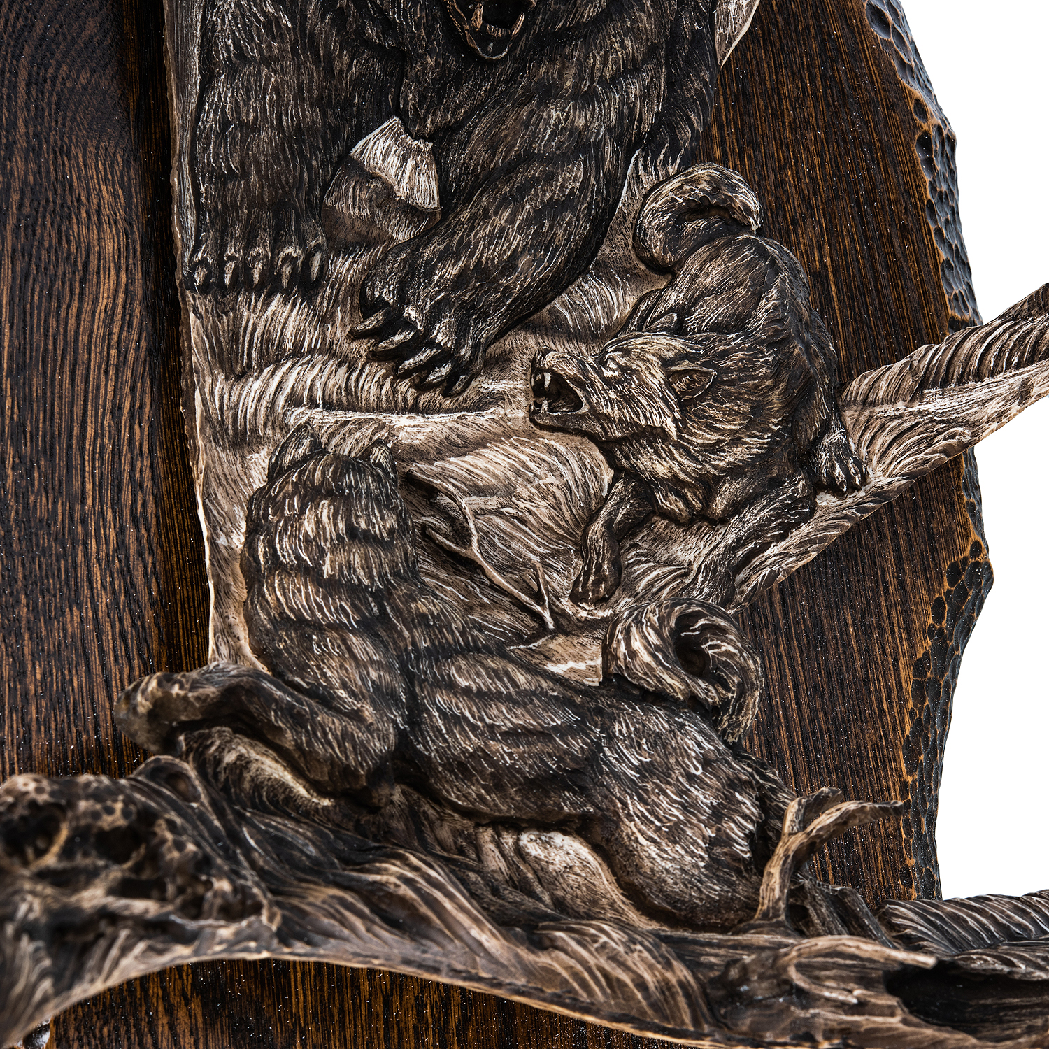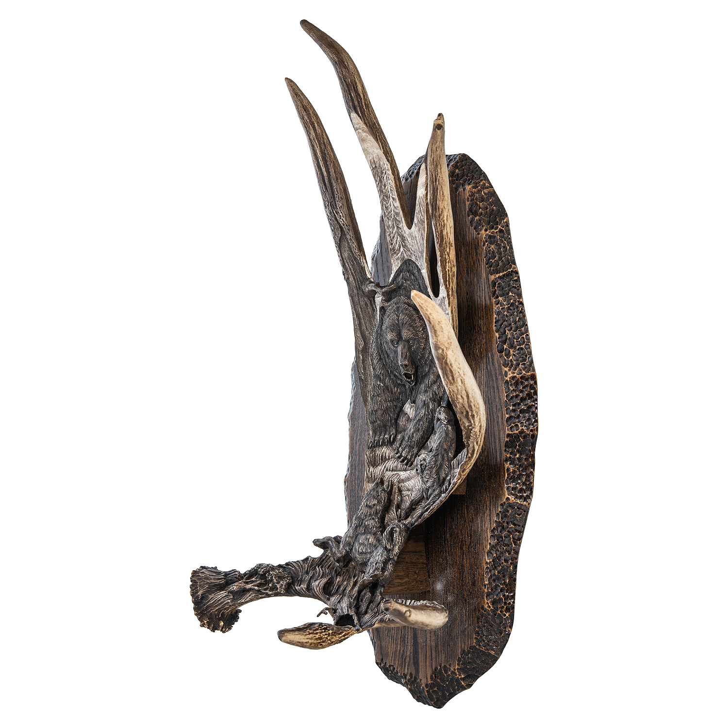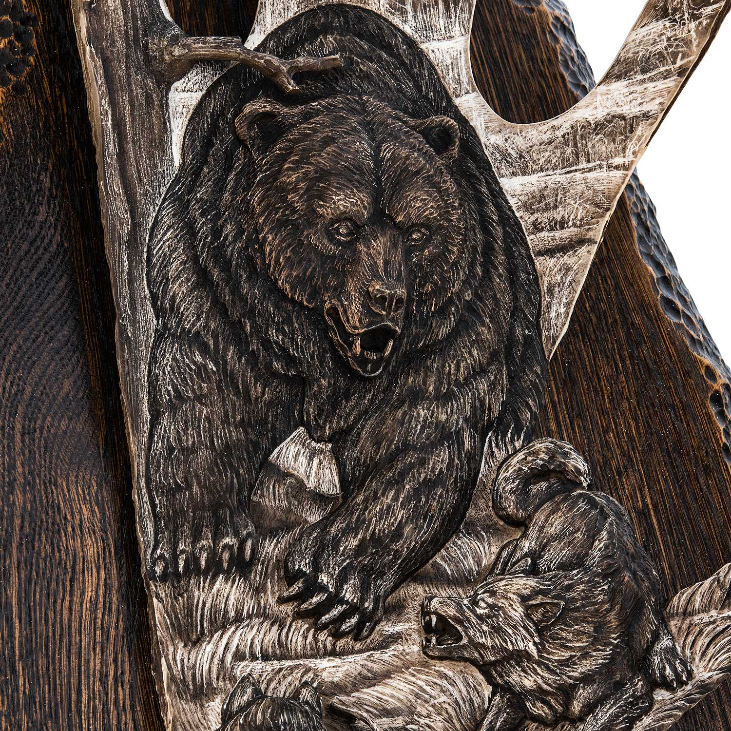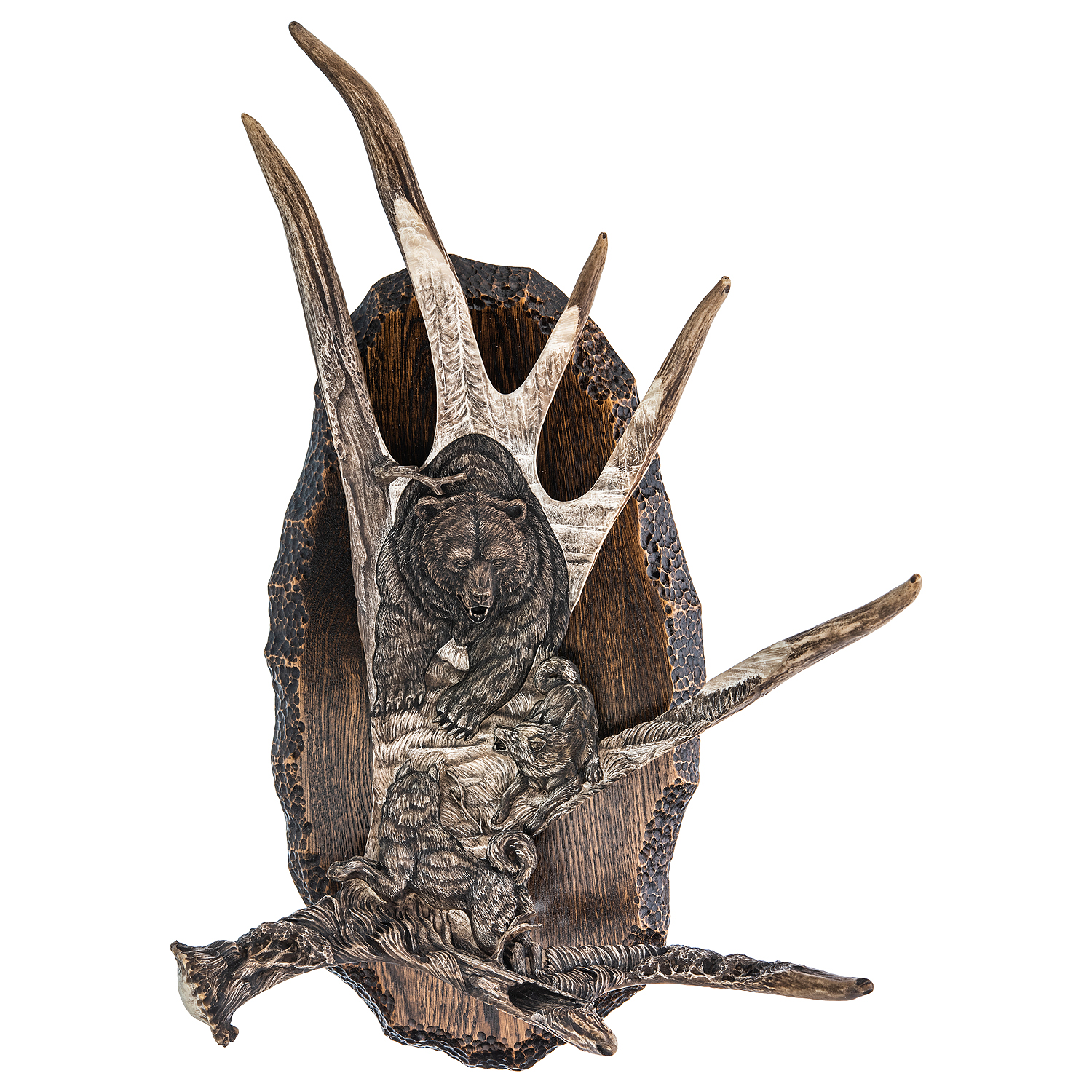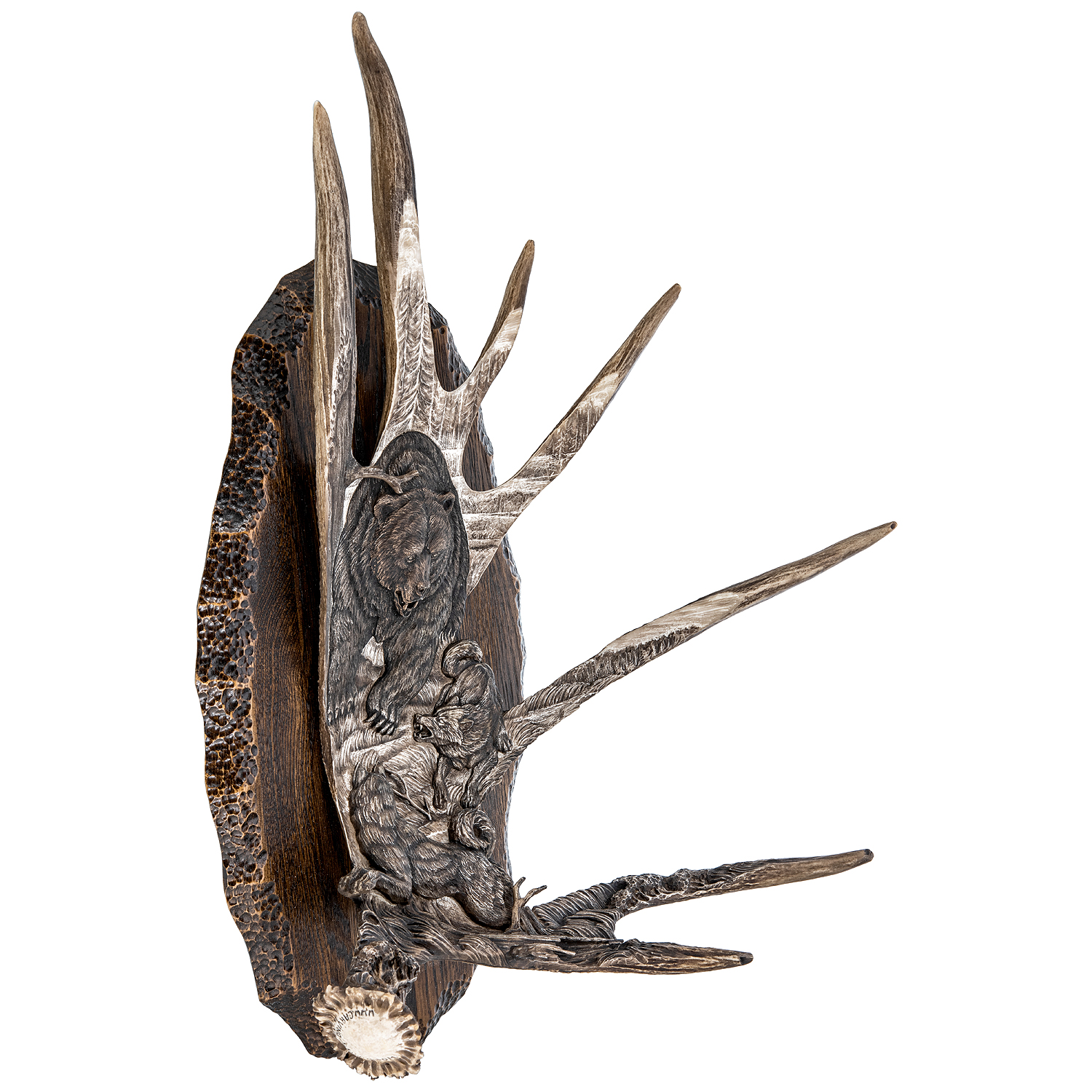 Русские подарки и сувениры → Интерьерные изделия → Панно → Настенная композиция из рога лося "Охота на медведя"
