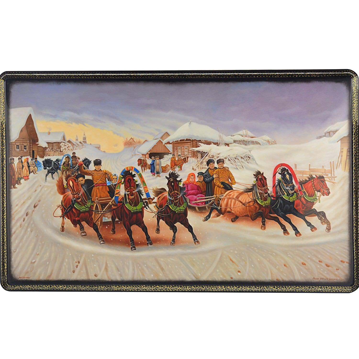 Теперь, когда Вы знаете историю лаковой миниатюры, обратите внимание, что перед Вами - полуметровое панно с живописным пейзажем и множеством персонажей, участвующих в русском-народном масленичном гулянье, на папье-маше, в центре которого - пара волков, замерших и глядящих прямо на зрителя. Лаковая миниатюра, представленная на паспарту, отличается художественной и коллекционной ценностью. Этот интерьерный аксессуар создает в помещении место силы и напоминает о России.