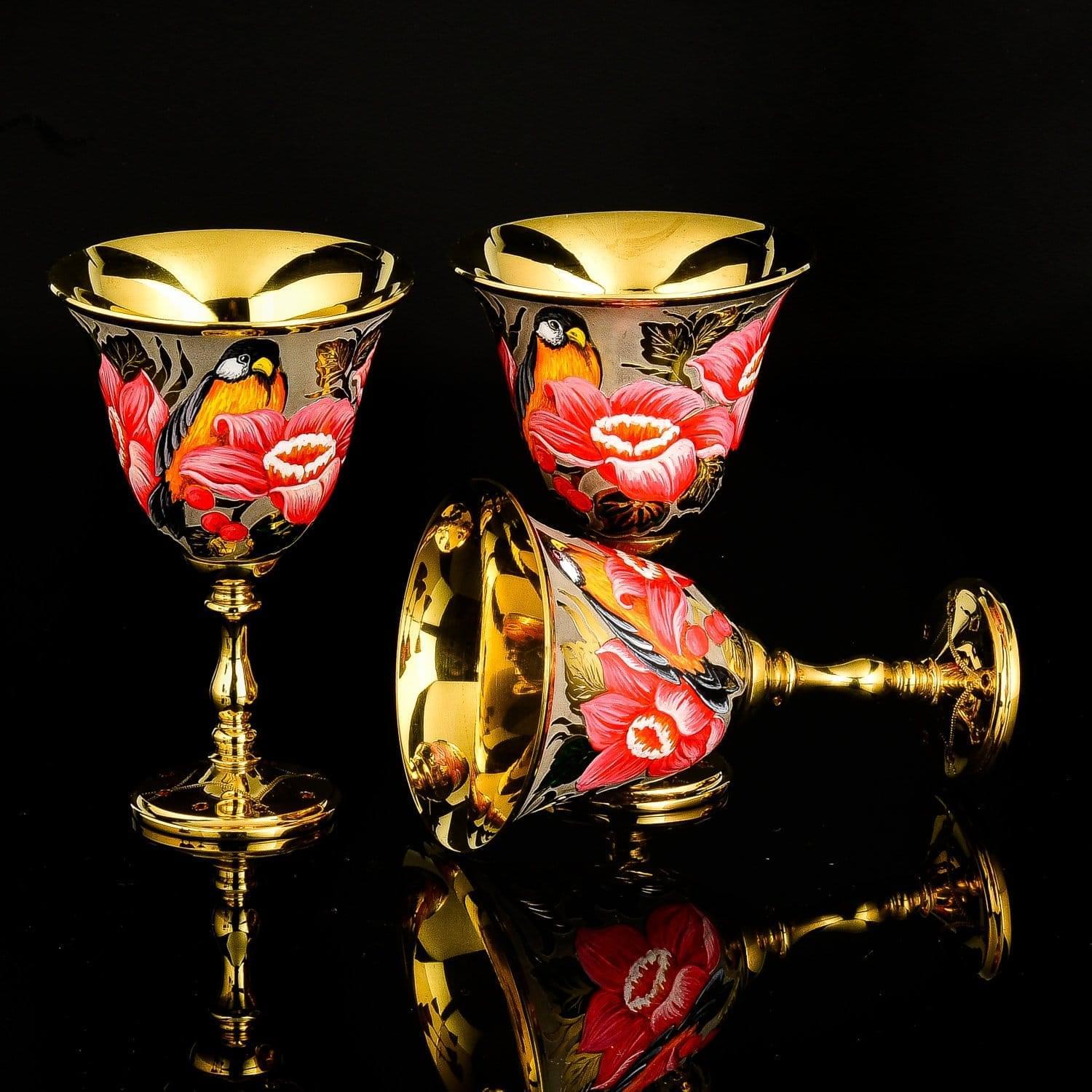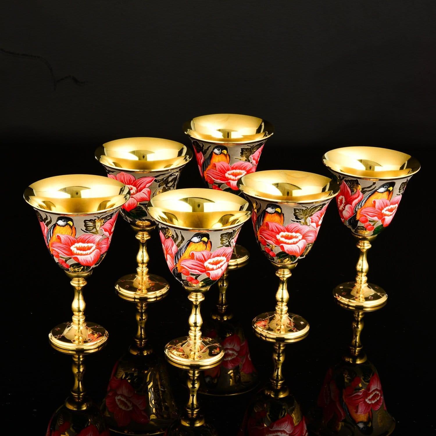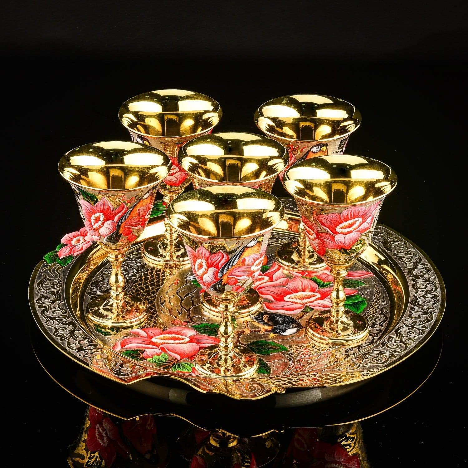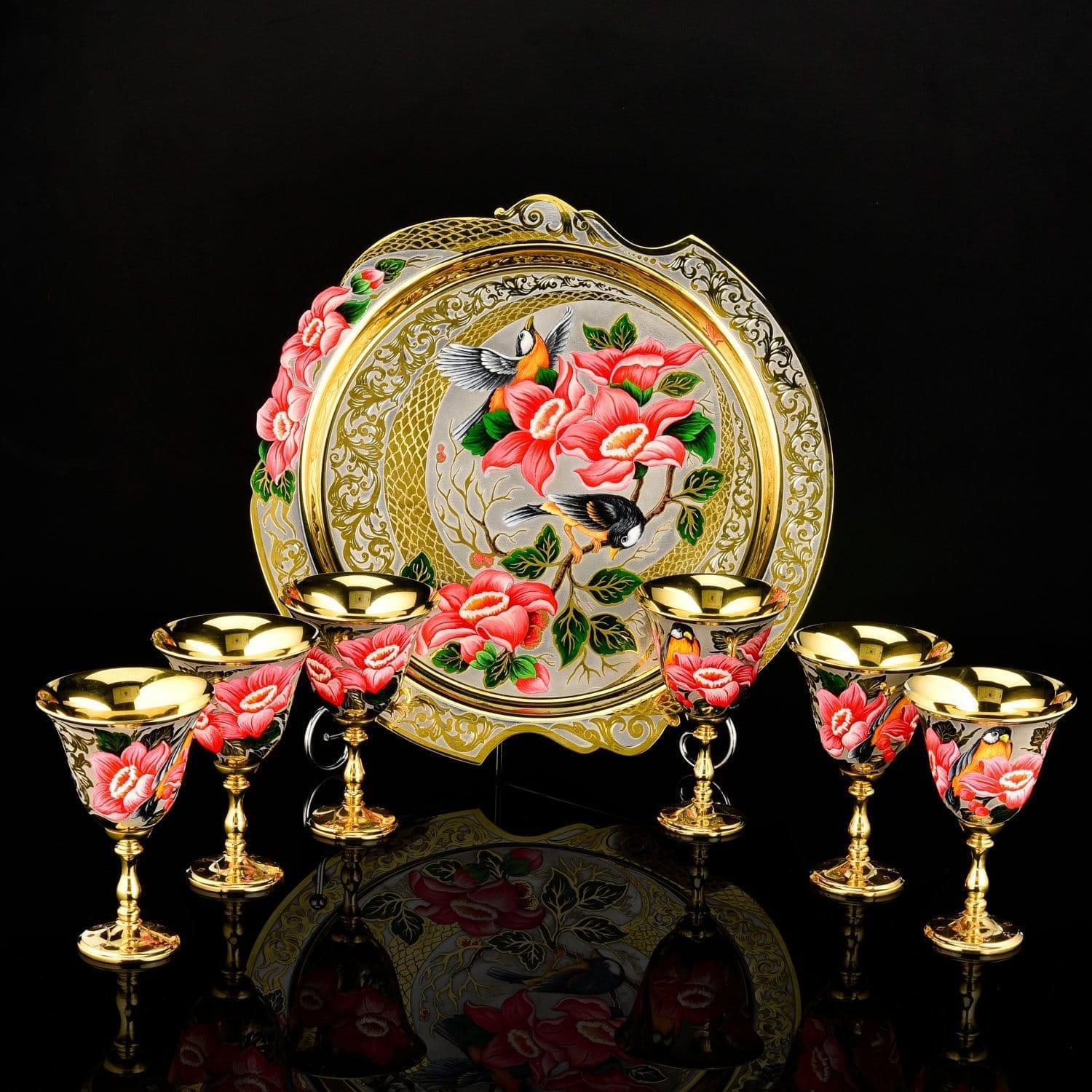 Корпуса подноса и бокалов - это образцы латунного литья. Их поверхности декорированы в техниках гравировки вручную, посредством резца и иглы. Вручную расписаны эмалью. Тонированы никелем и золотом. Напиток богов будет райским наслаждением!