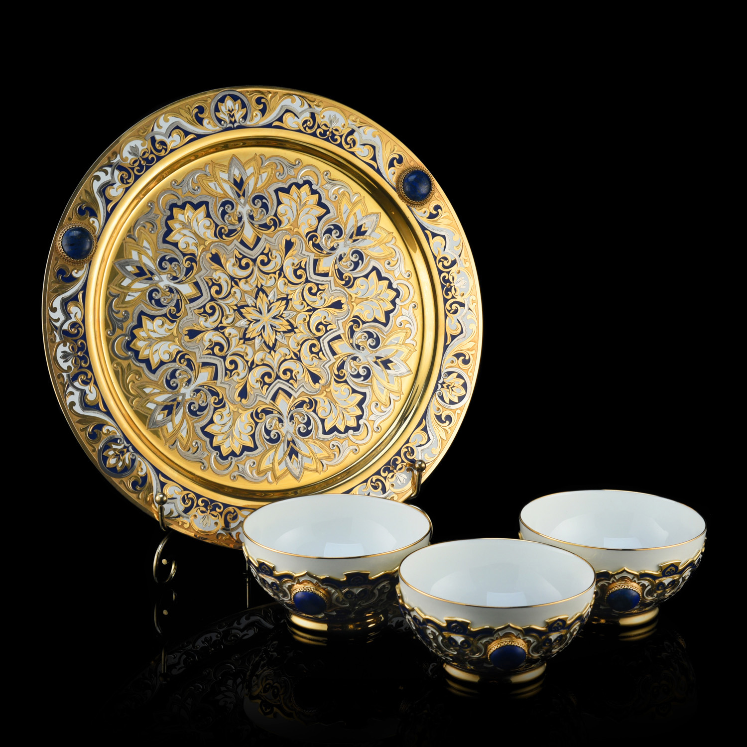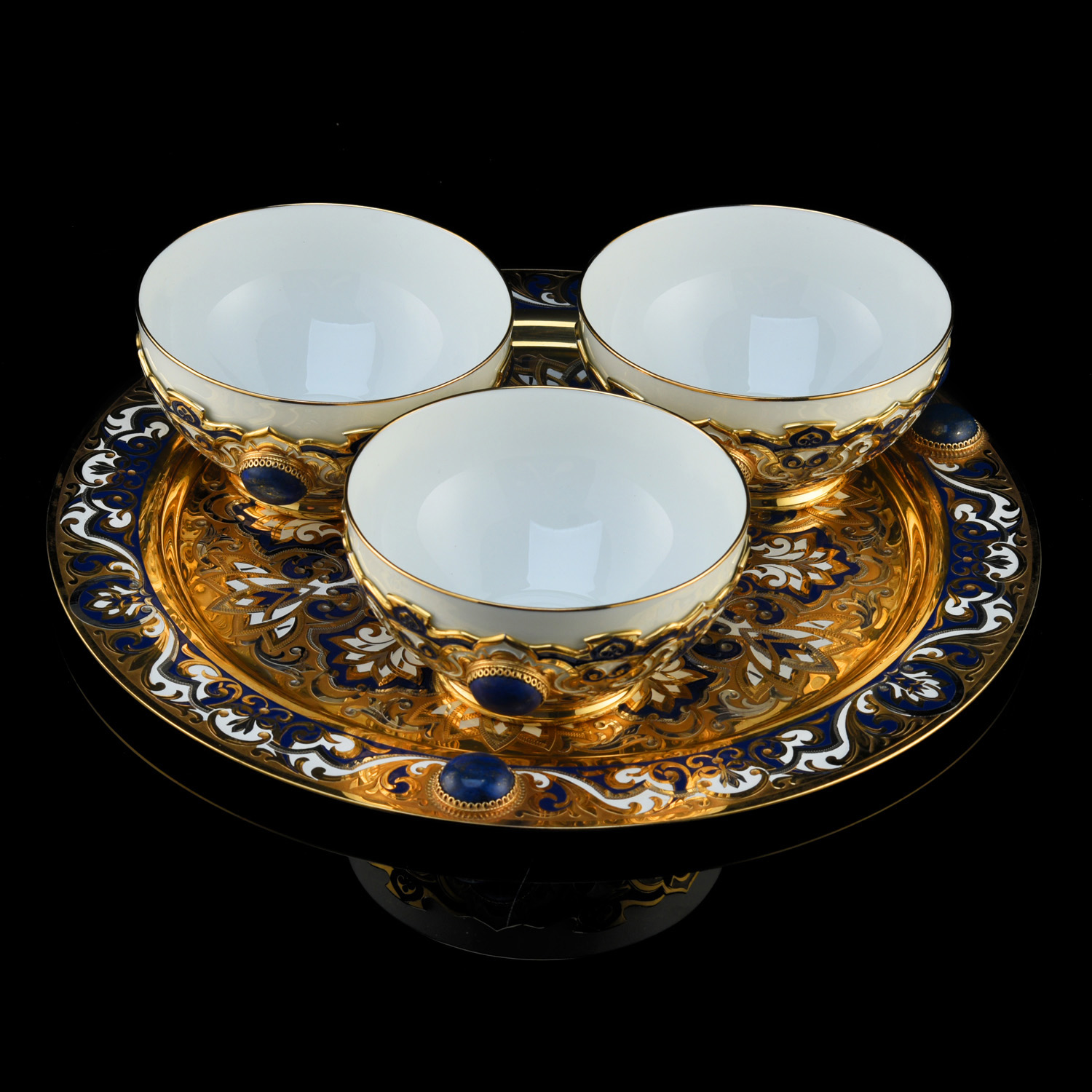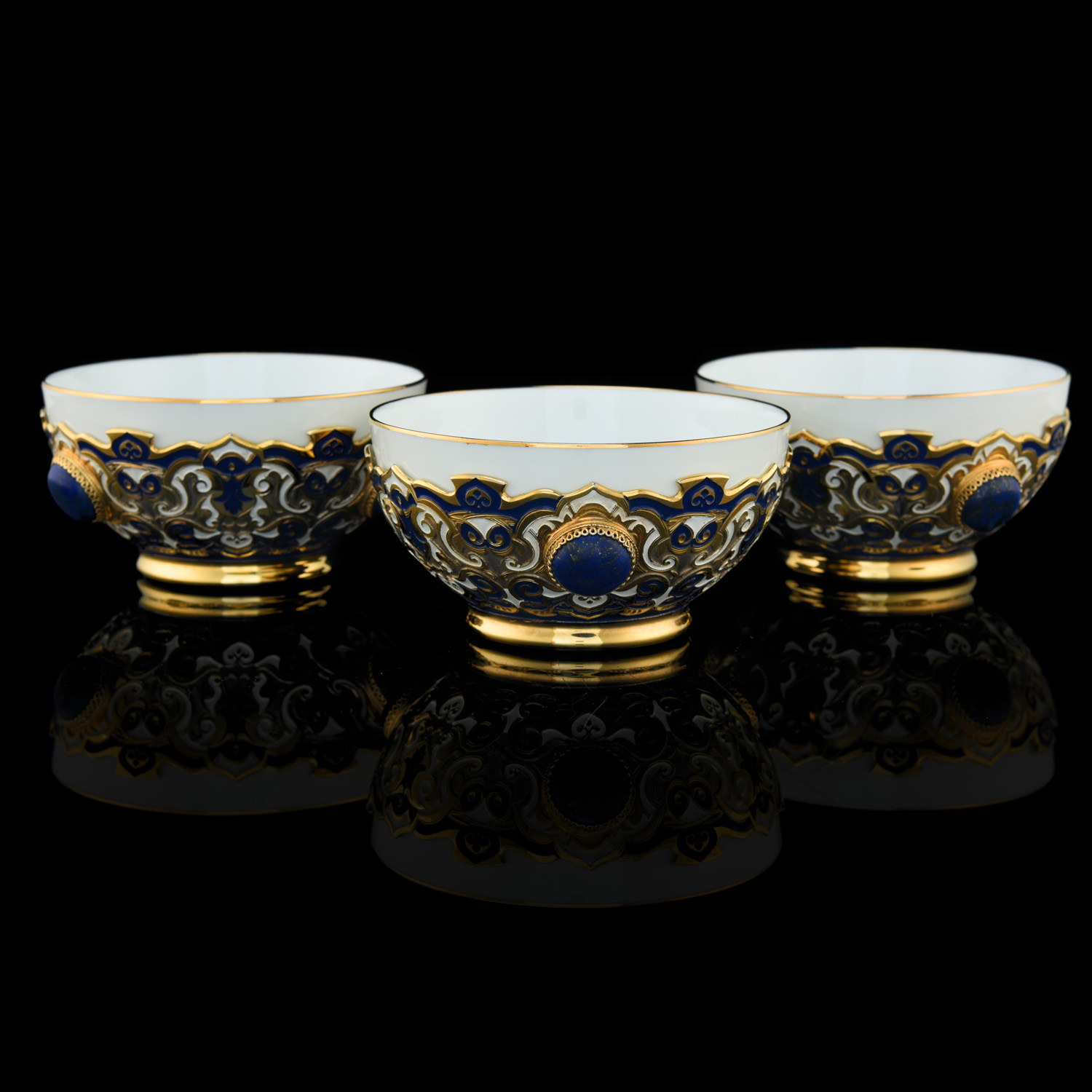 Набор из трех пиал "Восточный". Златоуст.Материалы: фарфор, латунь, никель, золото 999,9*, эмаль, лазурит.