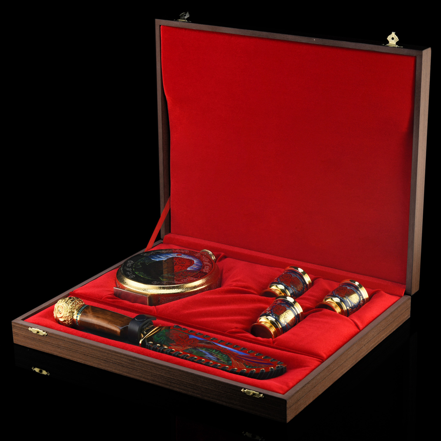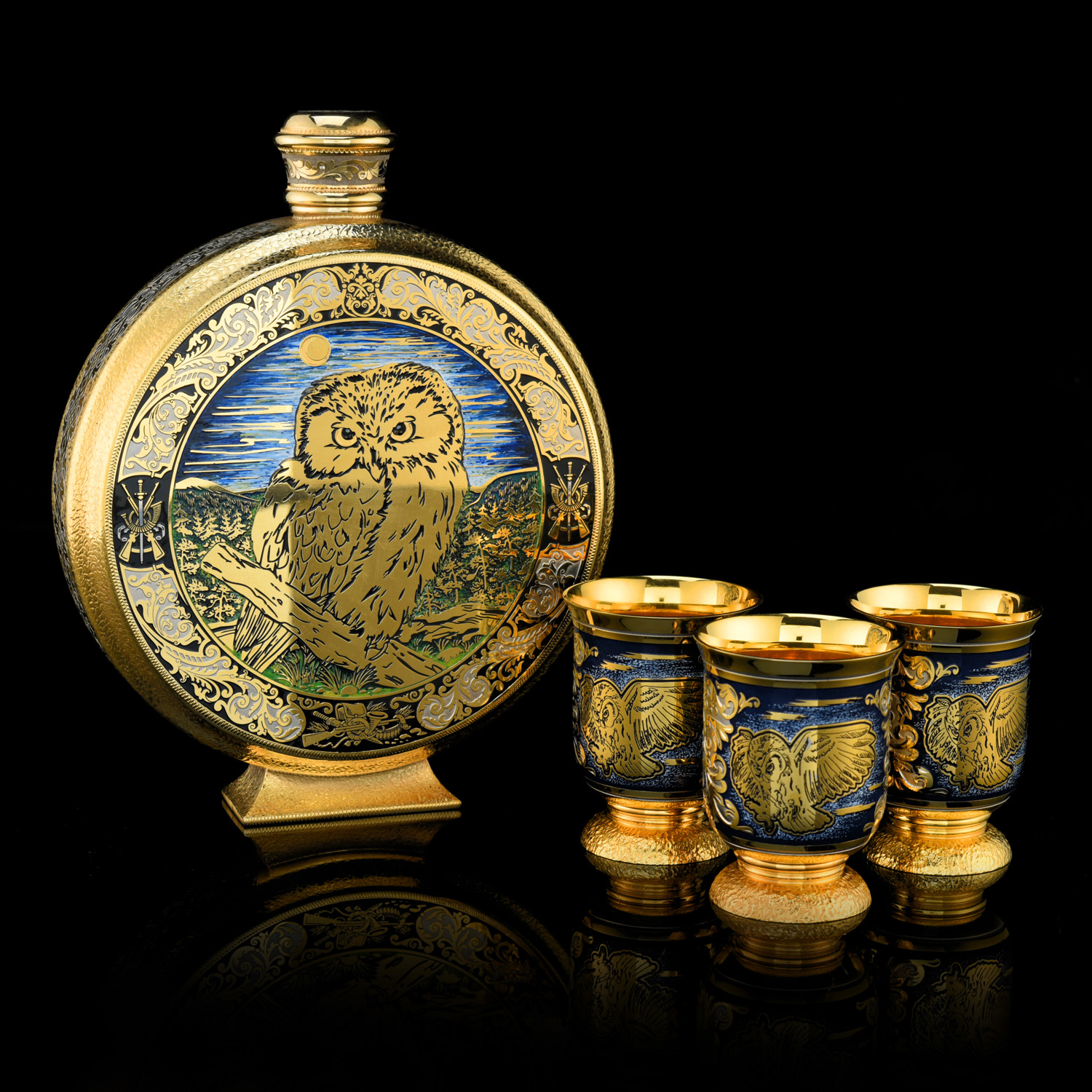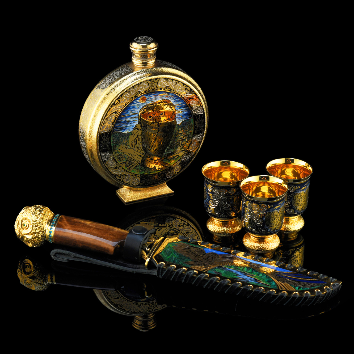 Питейный набор с флягой и ножом "Сова". Златоуст.Материалы: латунь, никель, золото 999,9*, эмаль, сталь, фианиты, дерево.