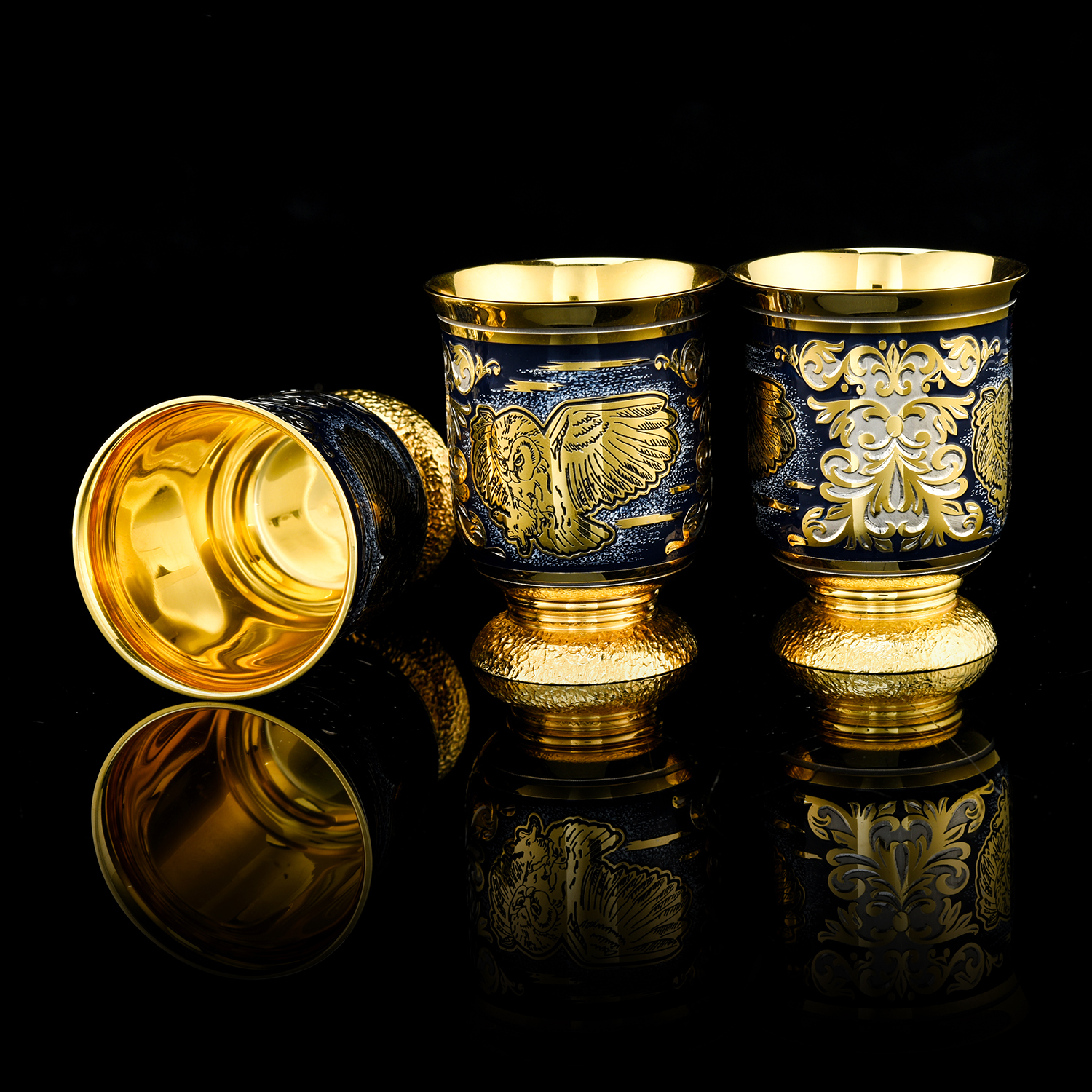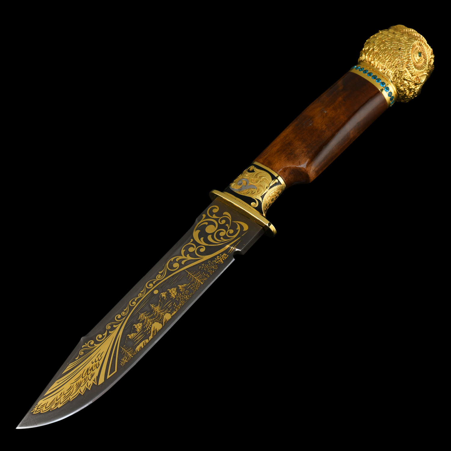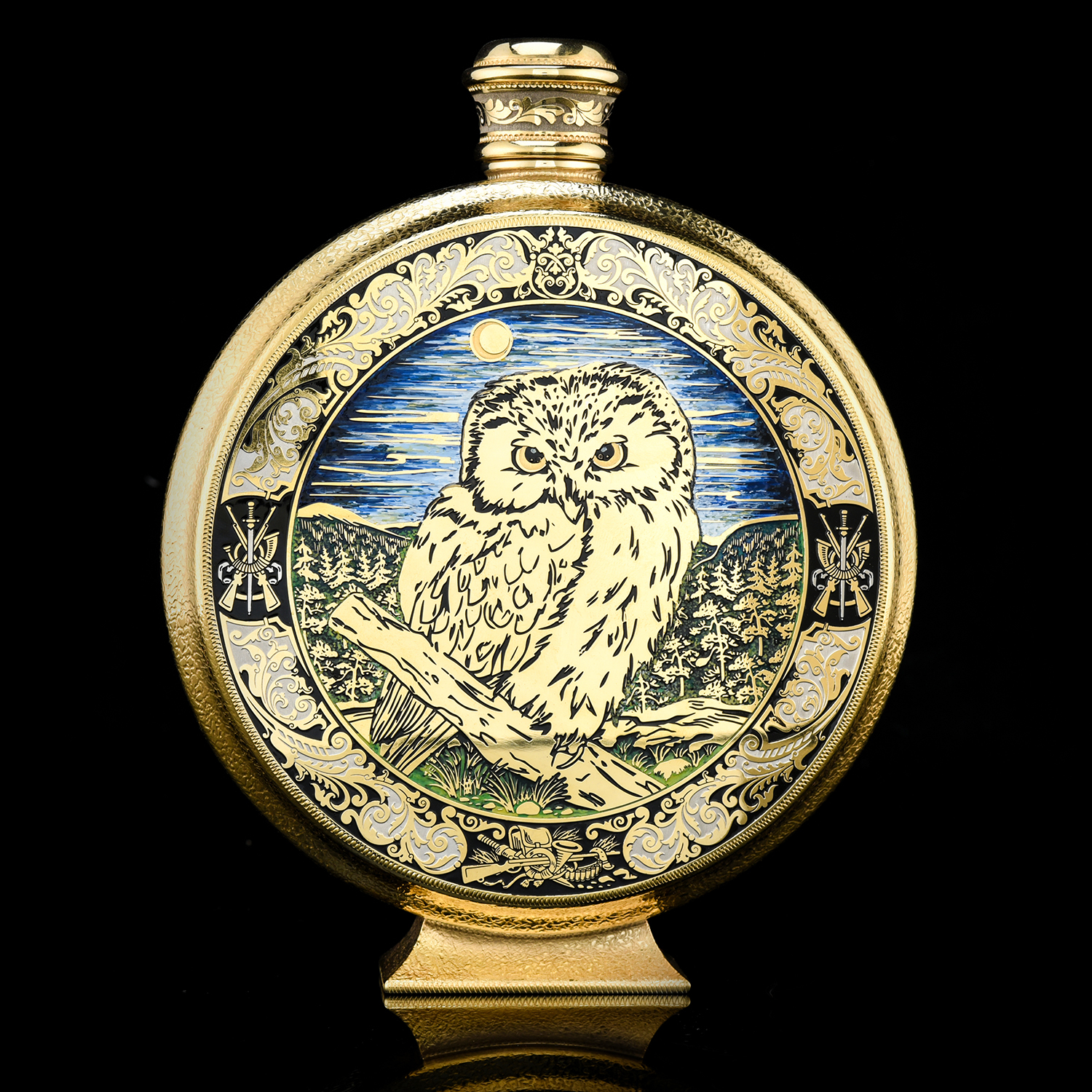 Питейный набор с флягой и ножом "Сова". Златоуст.Материалы: латунь, никель, золото 999,9*, эмаль, сталь, фианиты, дерево.