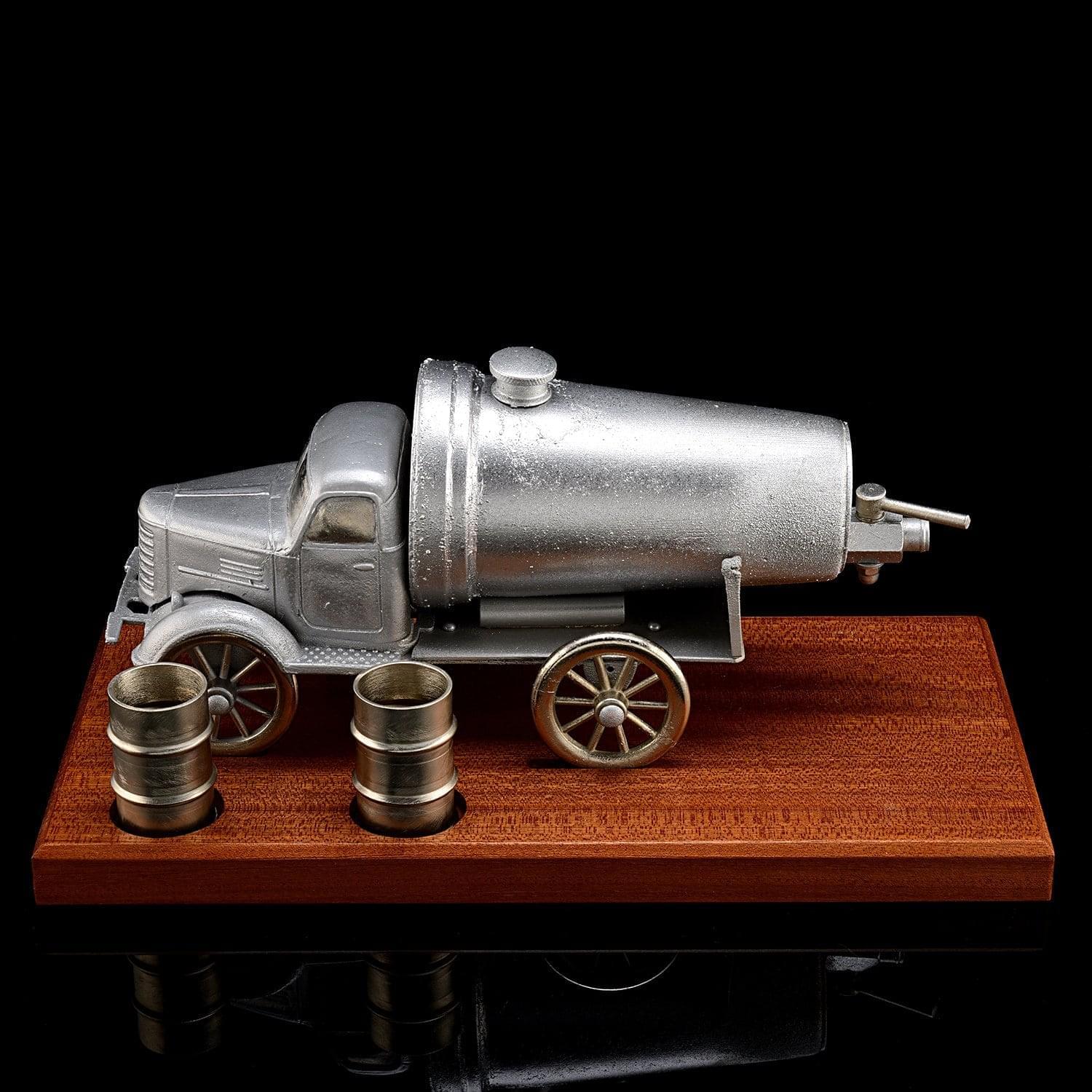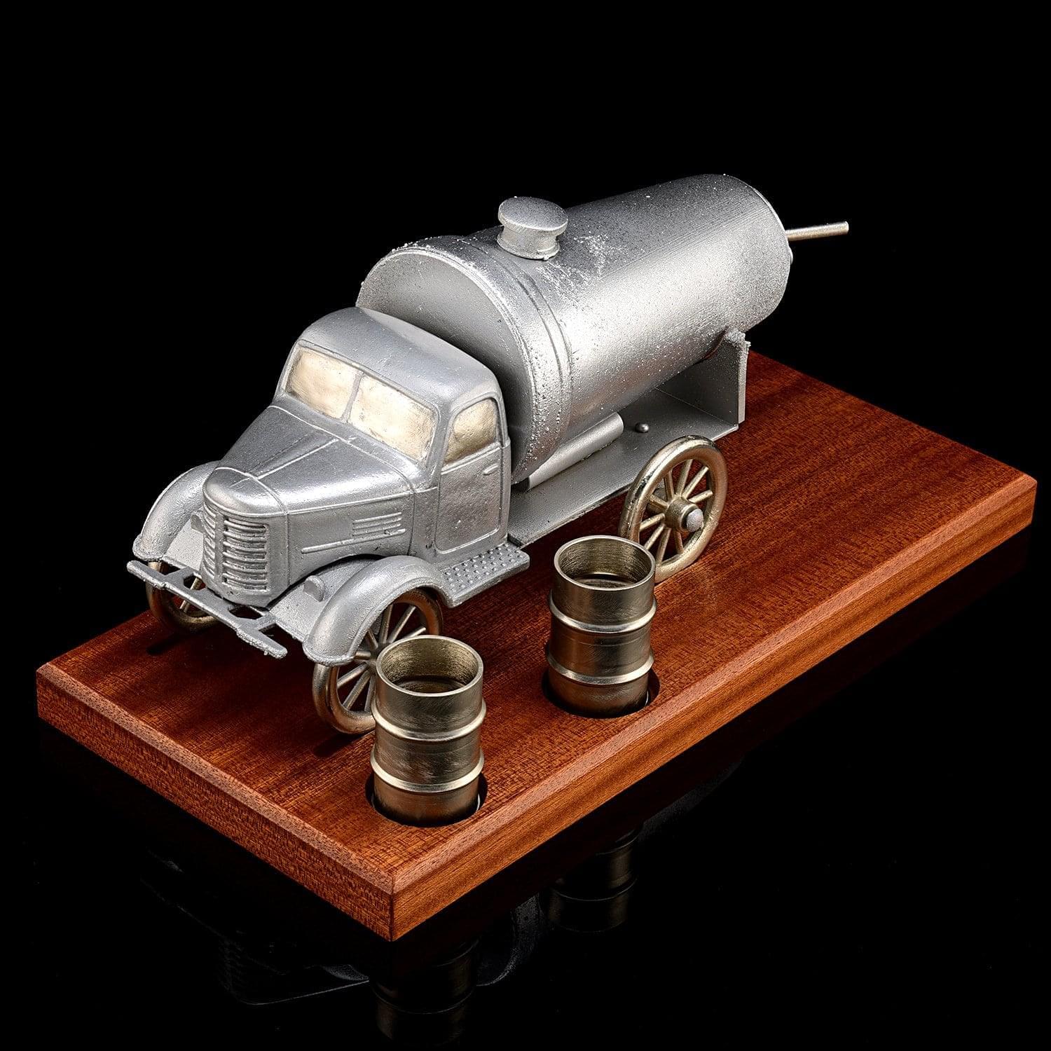 Вашему вниманию - эксклюзив Галереи, подарочный питейный набор, который призван подчеркнуть чувство вкуса и стиля хозяина дорогого интерьера, который является почитателем эксклюзивных предметов декора ручной работы. Набор с парой стопой и металлической скульптурой ретро-грузовика на подставке их дерева ценной породы.Набор изготовлен мастерами Златоуста - поставщиками штучных предметов утвари, элементов декора, образцов сувенирного холодного оружия и элитной посуды для главной резиденции президента России, Московского Кремля.