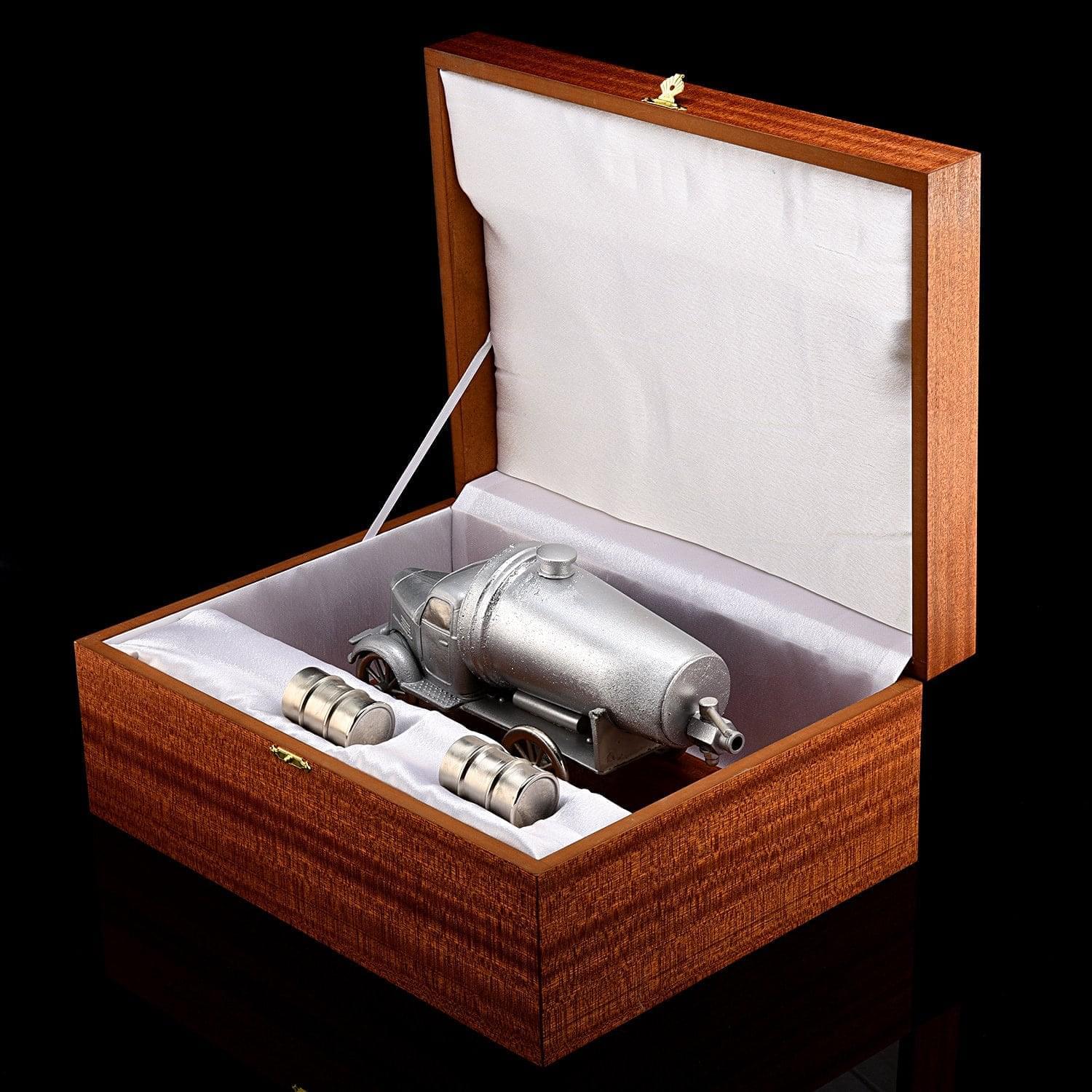 Набор продается в стильной подарочной упаковке из дерева, оформленной изнутри белым атласом. Эксклюзивная работа художника по металлу, питейный набор ретро-Грузовик со стопками - это вариант элитного /vip-подарка для состоятельного человека и пары влюбленных на Новый год, Новоселье, Свадьбу, День рождения, Юбилей, личный или общий, в том числе профессиональный праздник.