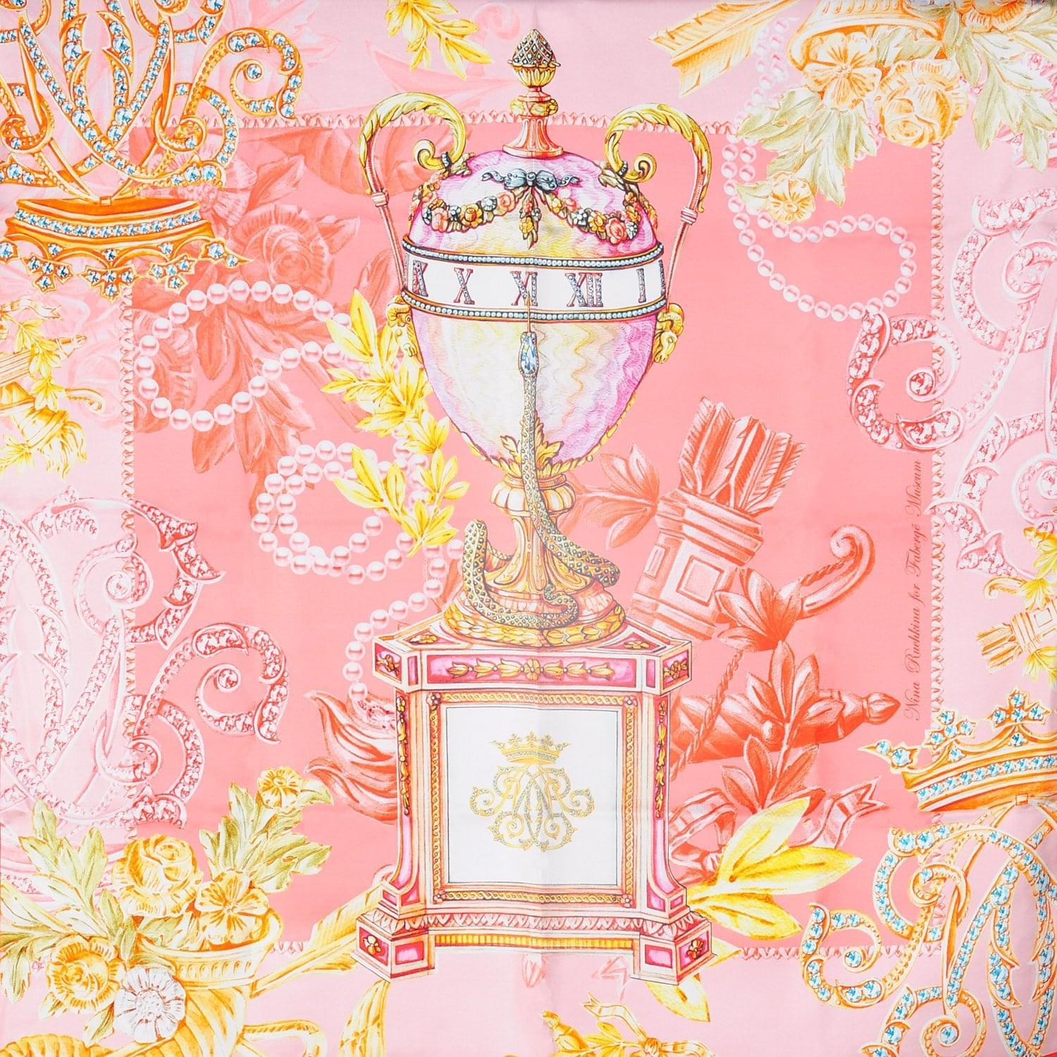 В рамках авторского принта в  персиковом оттенке на платке из 100% русского шелка изображено яйцо. Оно изготовлено в 1902 году фирмой Фаберже специально для герцогини  Консуэло Мальборо  Сегодня это яйцо-часы находится в постоянной экспозиции в Музея Фаберже в г. Санкт-Петербург. Платок с его изображением - самый нежный женский сувенир и символ роскоши.
