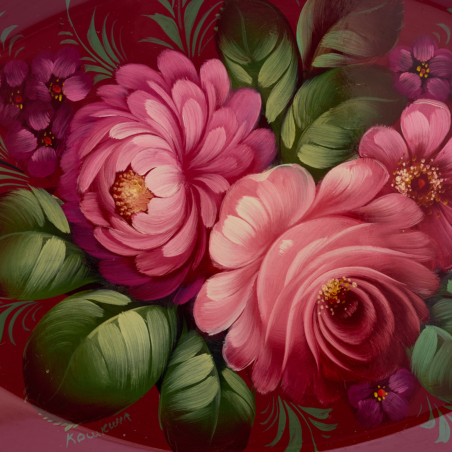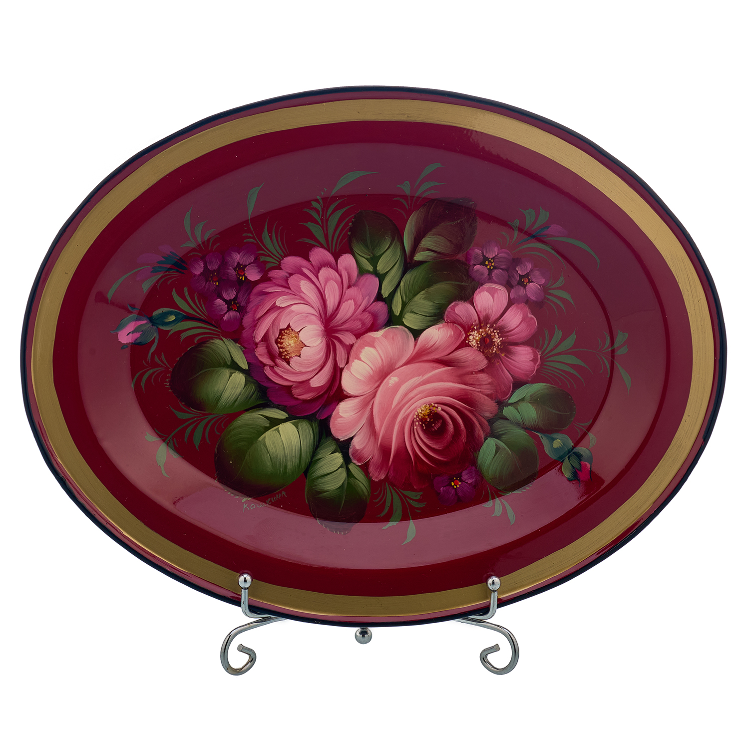 Поднос с авторской росписью "Цветы".Материалы: сталь, краски, лак.