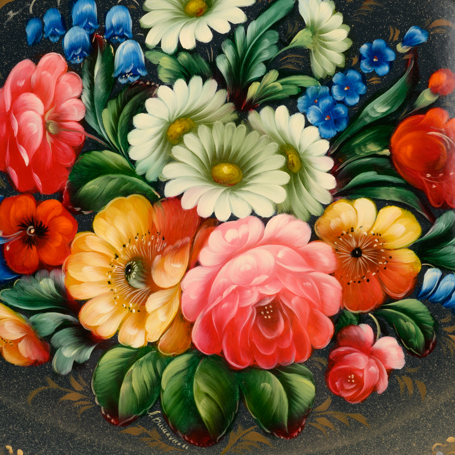 Поднос с авторской росписью "Цветы".Материалы: сталь, краски, лак.