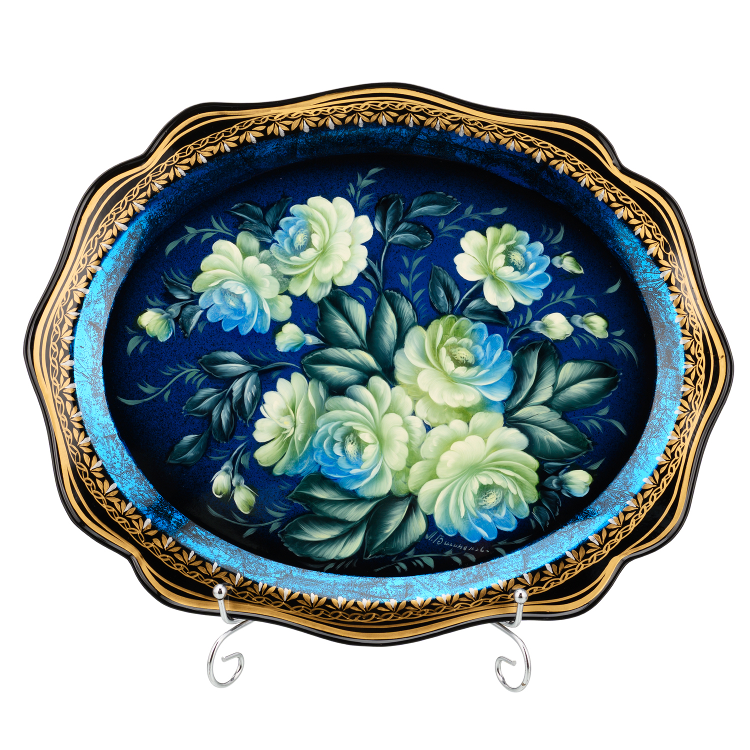 Поднос с авторской росписью "Цветы".Материалы: сталь, краски, лак.