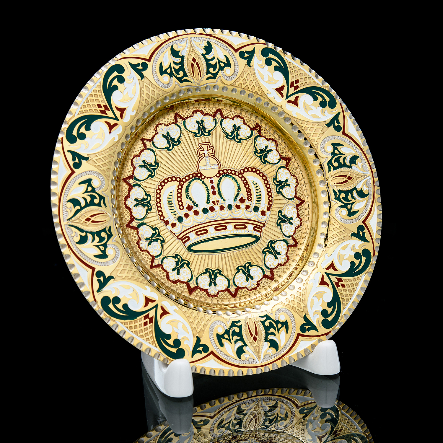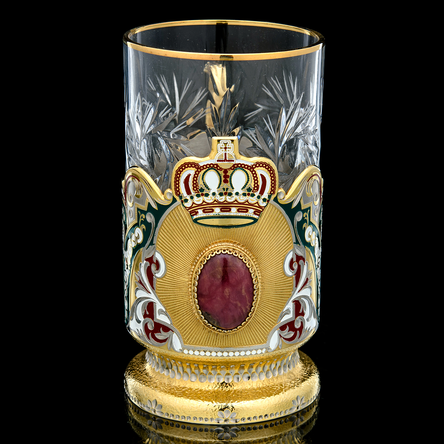 Чайный набор с подстаканником "Корона". Златоуст.Материалы: латунь, никель, золото 999,9*, эмаль, родонит.
