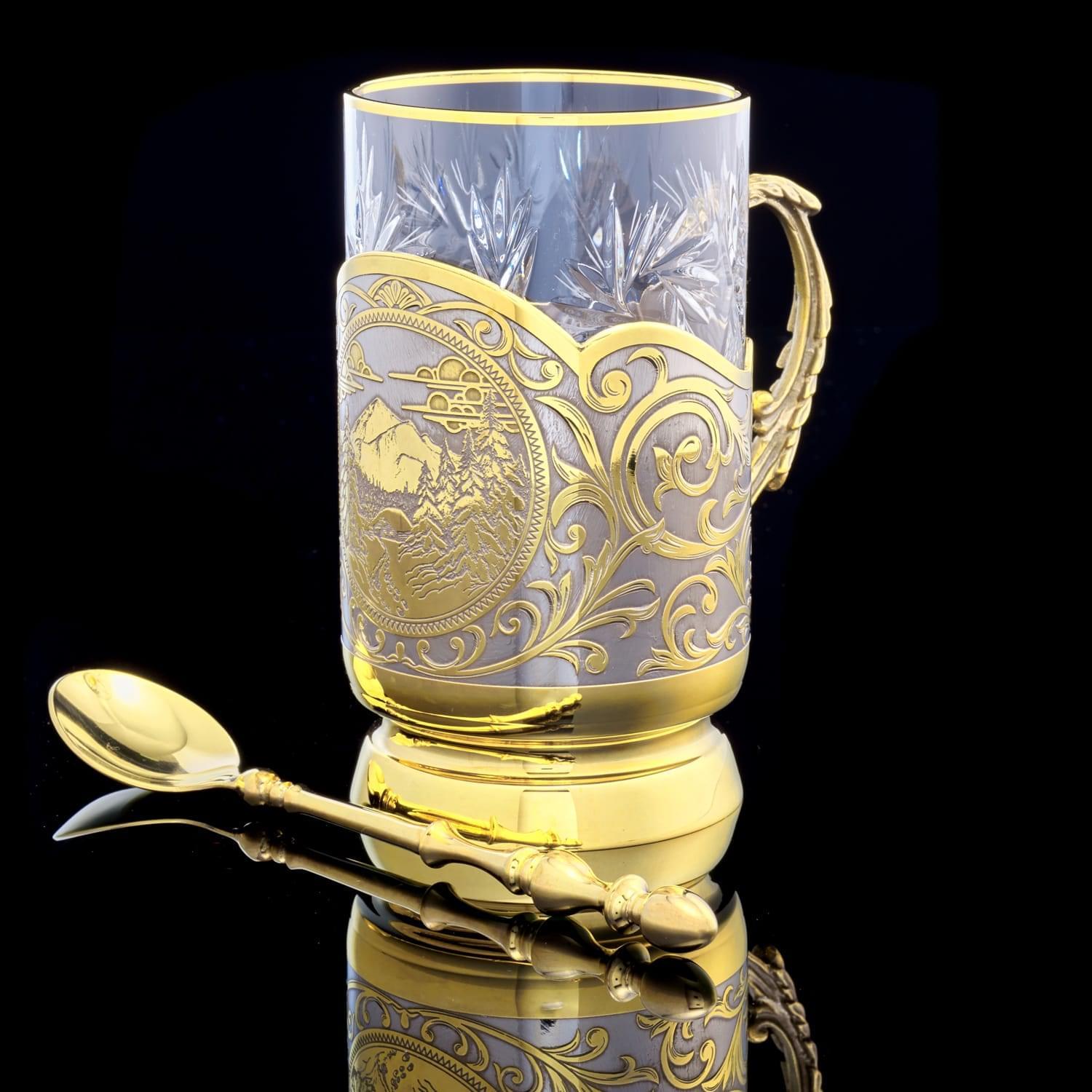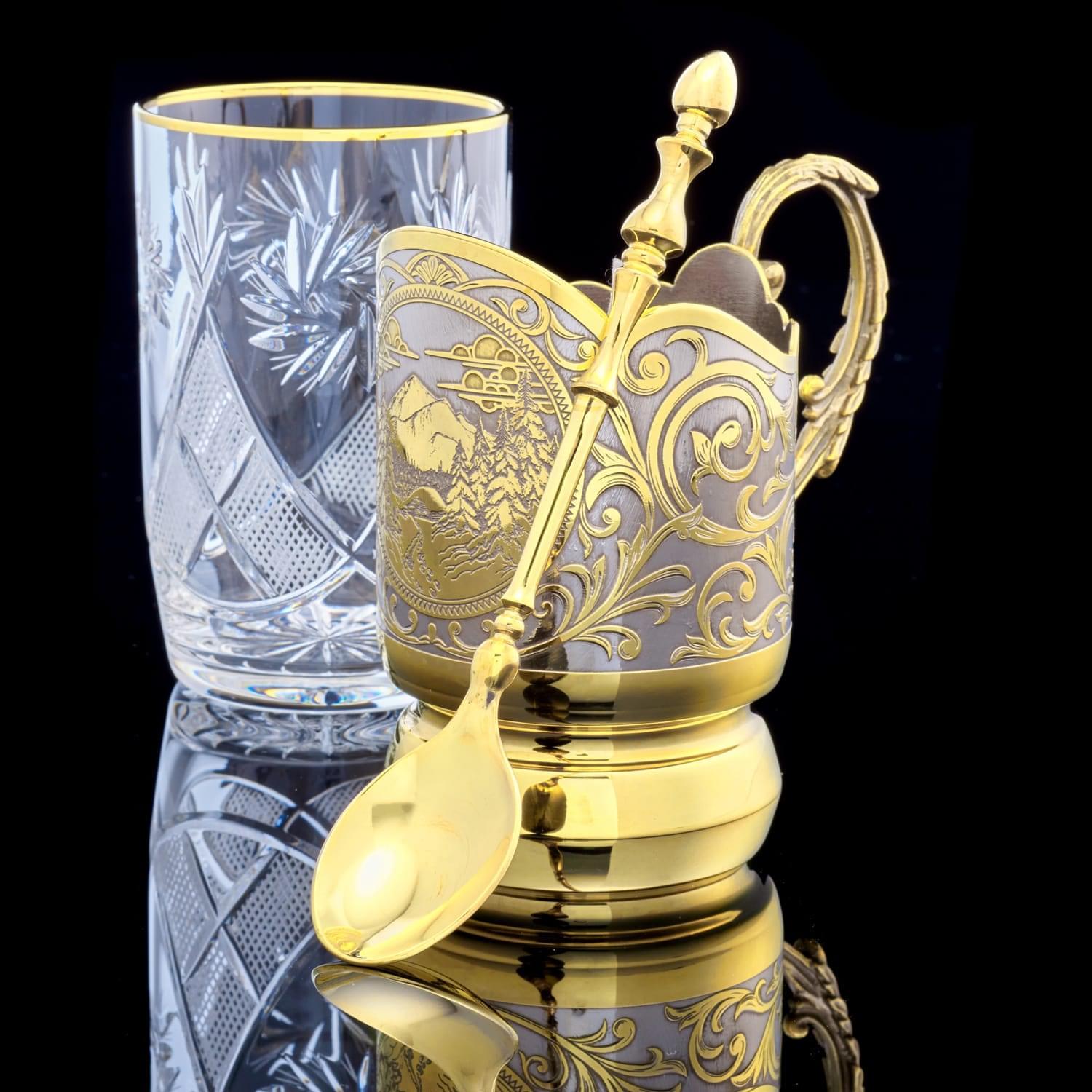 Подстаканник воплощает посредством Златоустовской гравюры на металле густой лес русского Таганая, национального парка на Южном Урале на территории Челябинской области. Его территория охватывает северную часть средневысотных горных хребтов Южного Урала, горный узел, переходящий в плоскогорья и равнинную лесостепь. Растительный мир Таганая похож на многоцветный узел, объединяющий разные природные зоны, елово-пихтовые, лиственные, березовые, сосновые леса тайги. Тут же видны горные степи, а высокогорья занимают субальпийские луга и горные тундры ....